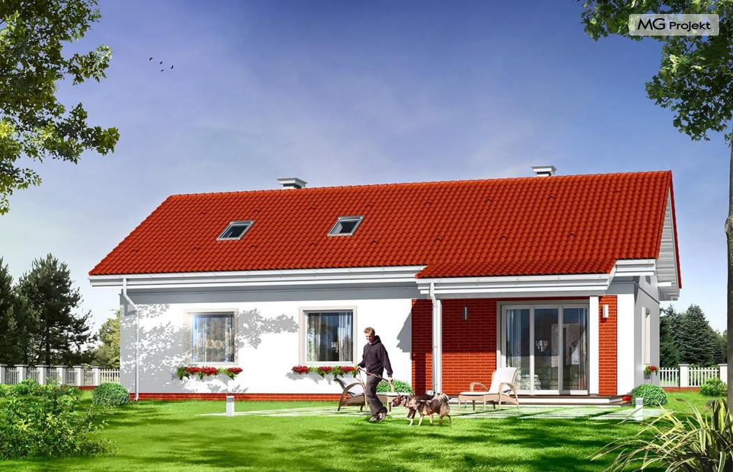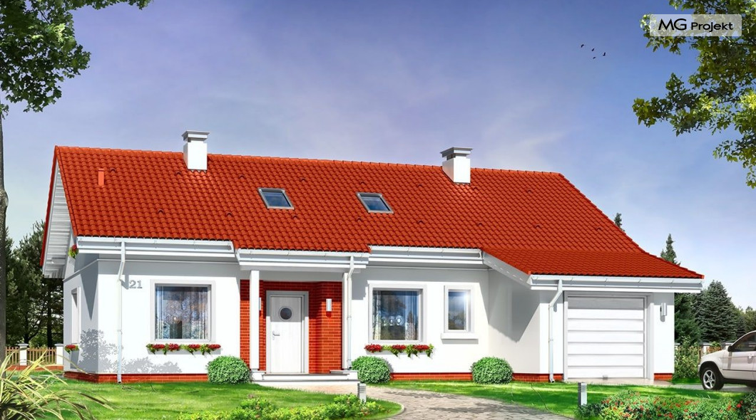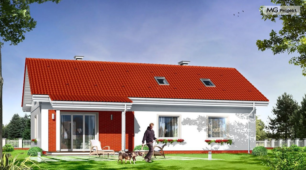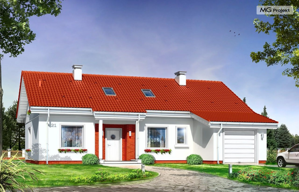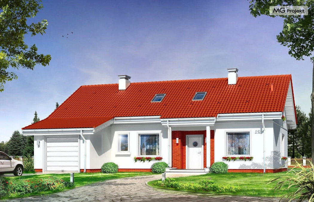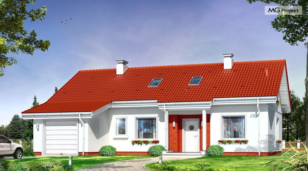 W projekcie domku Luna z garażem bezpretensjonalna współczesna architektura domu parterowego. Dom łączy w sobie tradycyjną formę i nowoczesne materiały, kolorystykę i detal. Całość tworzy skromny, ale bardzo sympatyczny wygląd domu.