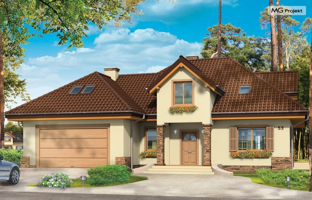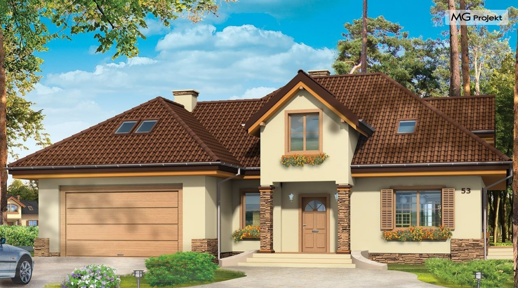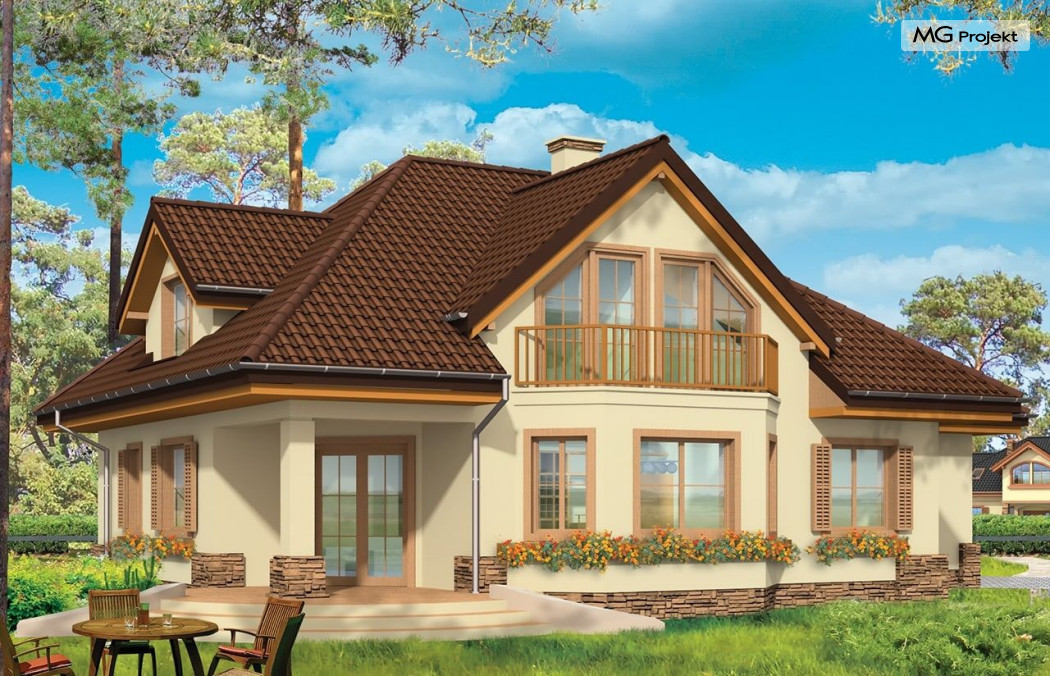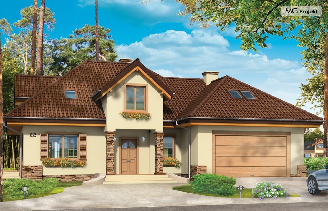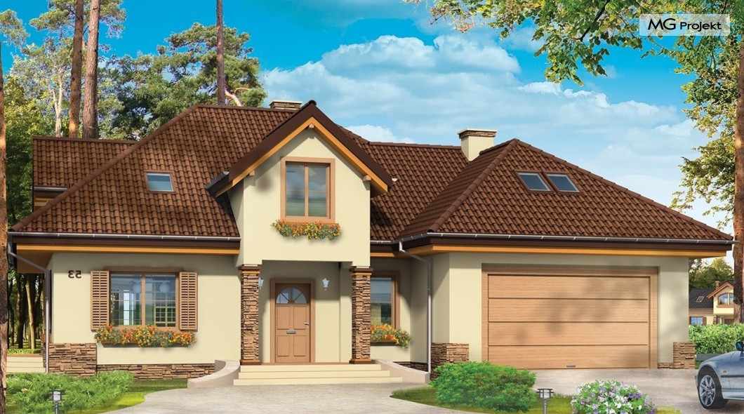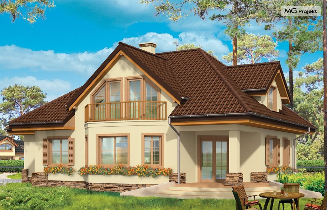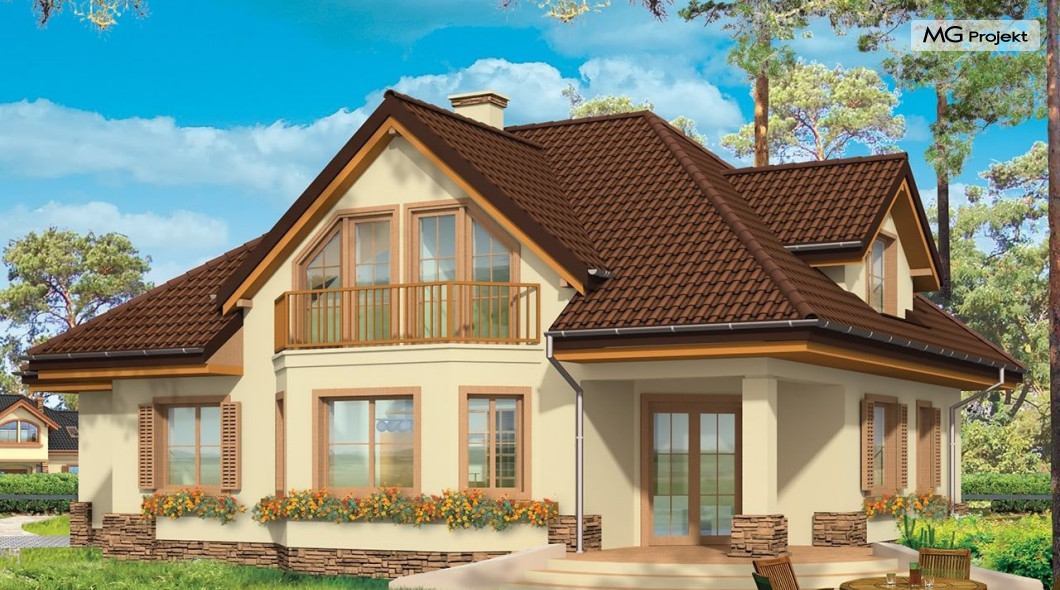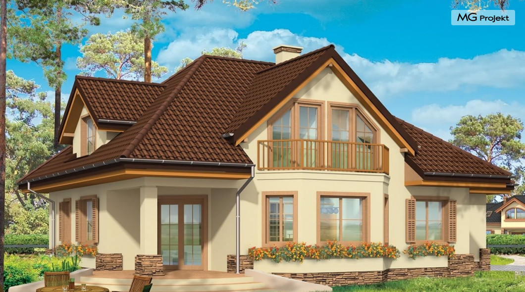 Projekt domu Maja 3 to druga odsłona projektu Maja. Dom został zwężony, tak aby mieścić się na mniejszej działce. Ponadto w projekcie domu Maja 3 zmieniono niektóre elementy elewacji na prostsze, mniej kosztowne rozwiązania: zrezygnowano z łukowo zakończonych okien, zlikwidowano jeden z wykuszy. Projekt domku Maja 3 dostępny jest także w odbiciu lustrzanym oraz inne jego wersje: projekt domu Maja, projekt domu Maja 2 i projekt domu Maja 4. Zapraszamy!