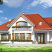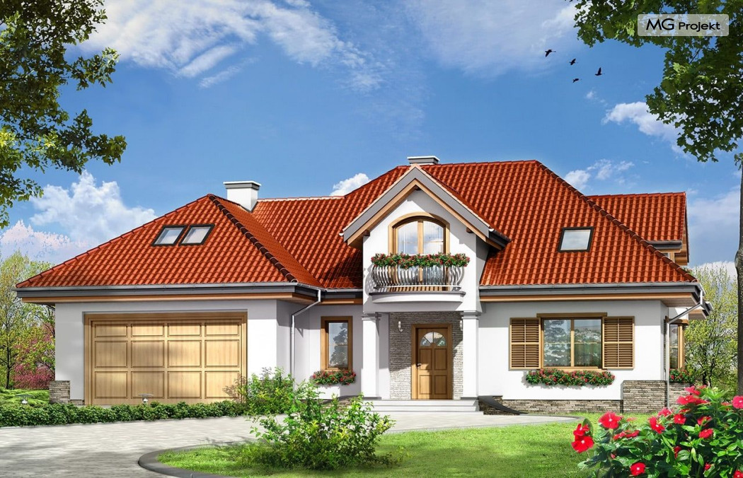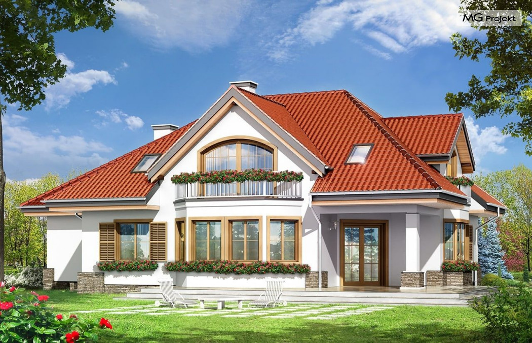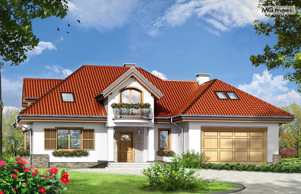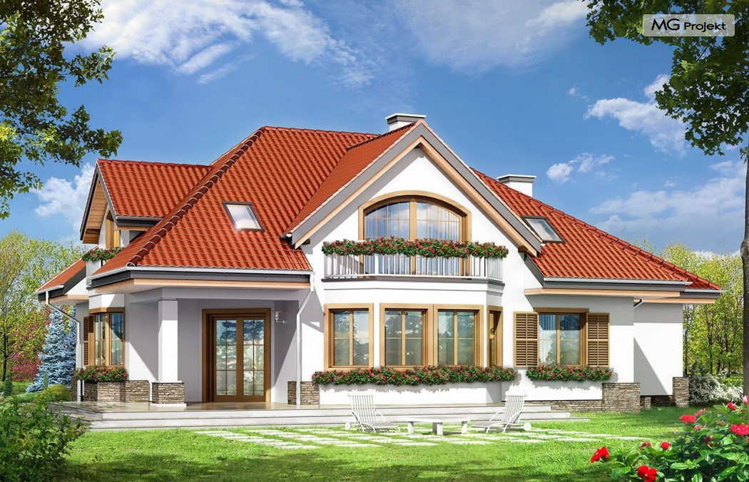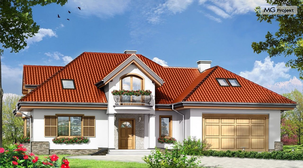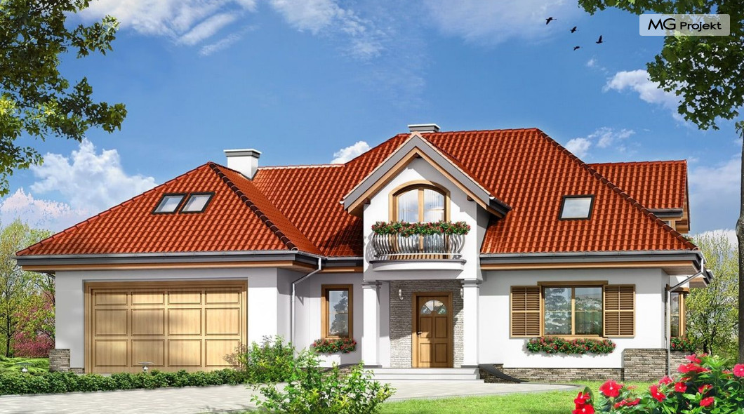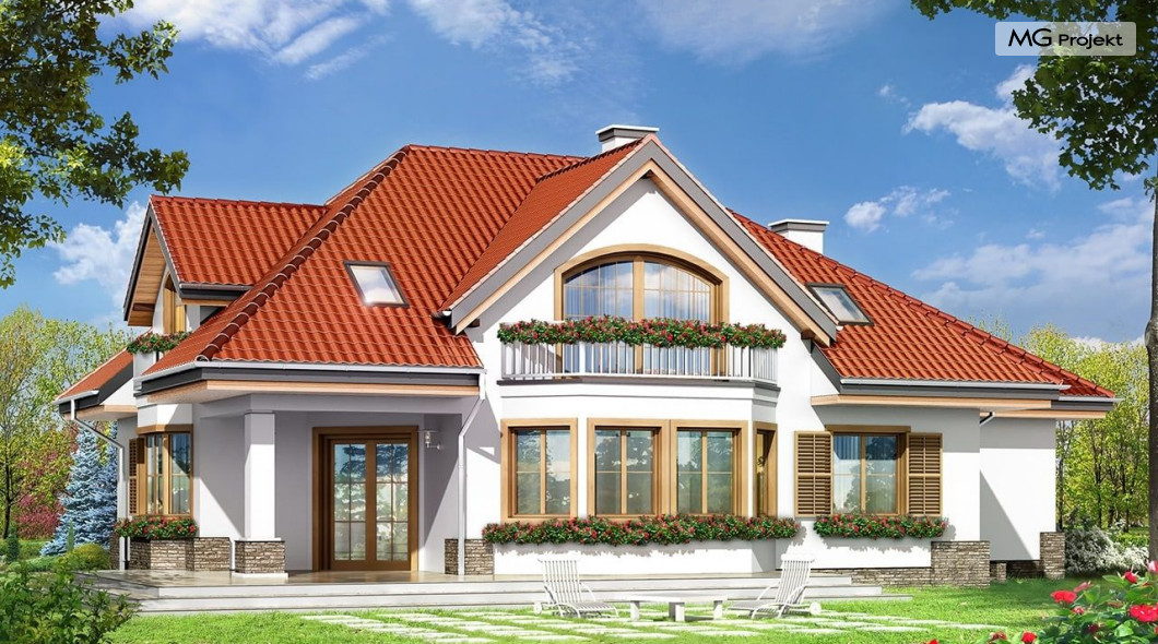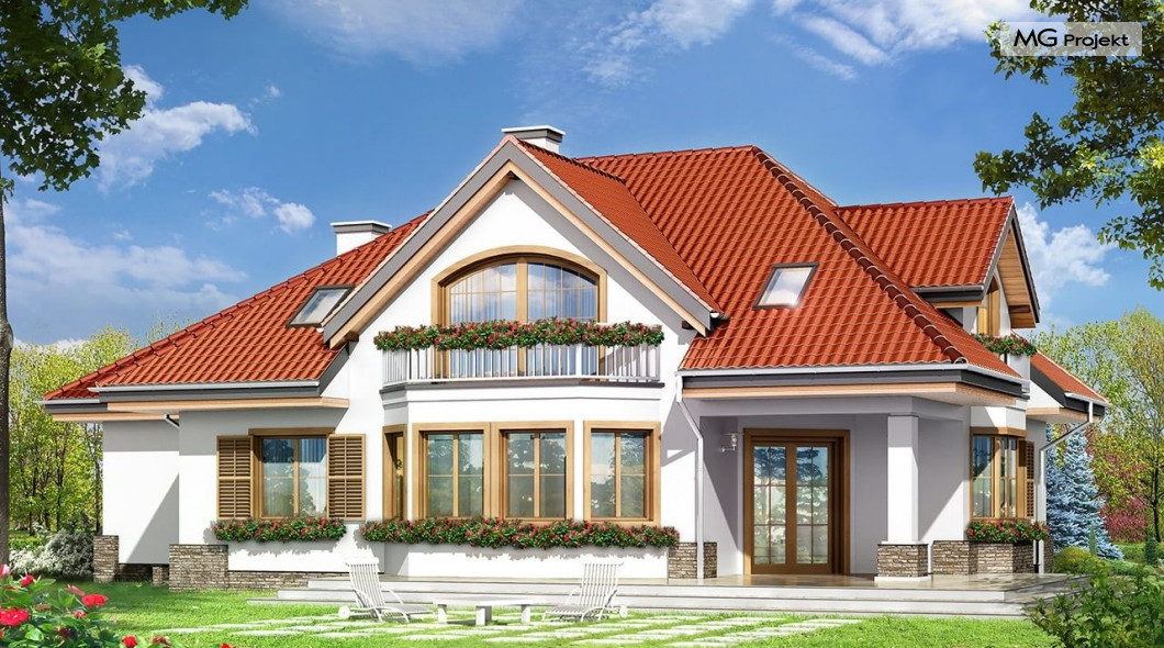 Projekt domu Maja 4 to kolejny wariant wersji popularnego projektu Maja. Projekt został powiększony w stosunku do swoich poprzedników. Budynek został poszerzony, podniesione zostały też ściany kolankowe na poddaszu, co ograniczyło zasięg skosów w sypialniach. Dom zaprojektowany został z myślą o rodzinie cztero-sześcioosobowej. Główna prostokątna bryła budynku z dobudowaną częścią garażową przekryta jest wielospadowym dachem, z lukarnami na poddaszu. Architektonicznie dom Maja 4 utrzymano w stylistyce typowego "polskiego dachowca", urozmaiconego wieloma ozdobnymi detalami, jak wykusze, podcienie z kolumnami, lukarny z balkonami, czy łukowe okna piętra. Zwrócić uwagą należy również na otwarcie domu na ogród - duże przeszklenia salonu, bardzo ładny taras, oraz praktyczny podcień powodują, że ogród staje się przedłużeniem wnętrza. Projekt domu Maja 4 to pomysł na bardzo wygodny i komfortowy dom, nawet dla licznej rodziny. Na parterze prócz części dziennej, na którą składają się: salon, jadalnia, hol i częściowo otwarta kuchnia, zaprojektowano również dodatkowy, niezależny pokój, oraz część techniczną domu z dwustanowiskowym garażem. Na poddaszu przewidziano cztery sypialnie i łazienki. W pracowni MG Projekt dostępna jest także wersja projektu Maja w odbiciu lustrzanym oraz inne jego warianty: projekt domu Maja, projekt domu Maja 2, projekt domu Maja 3, projekt domu Maja 4.
