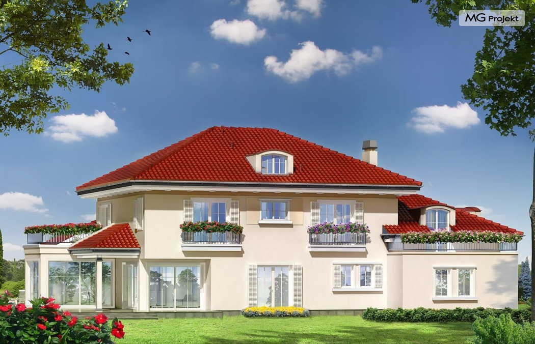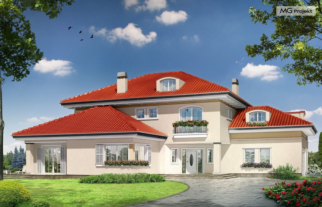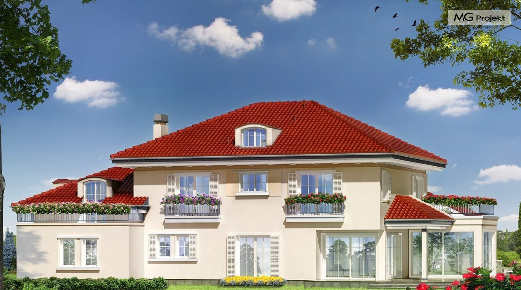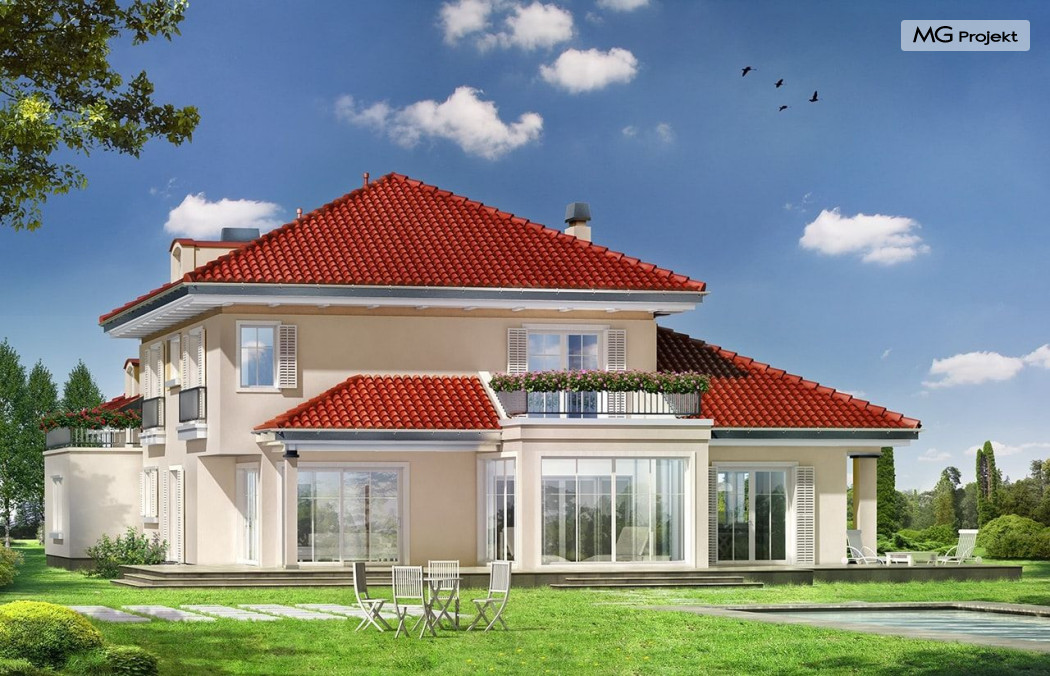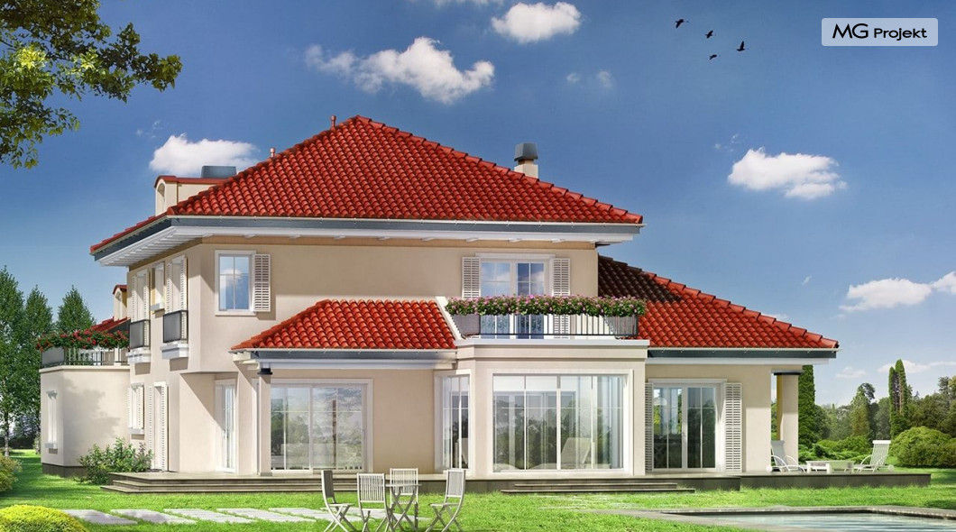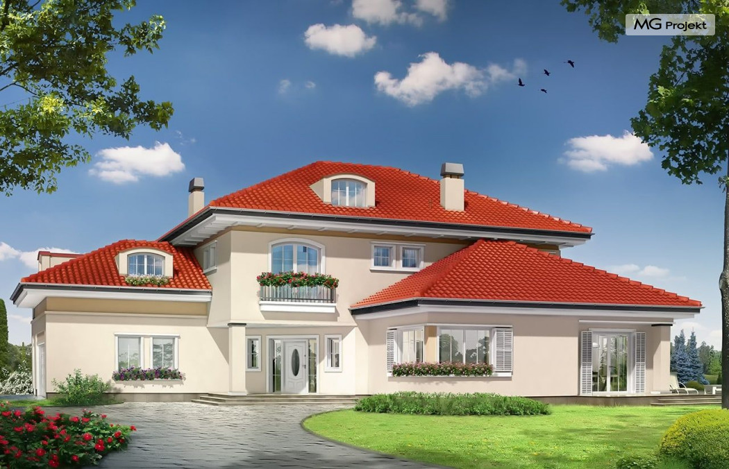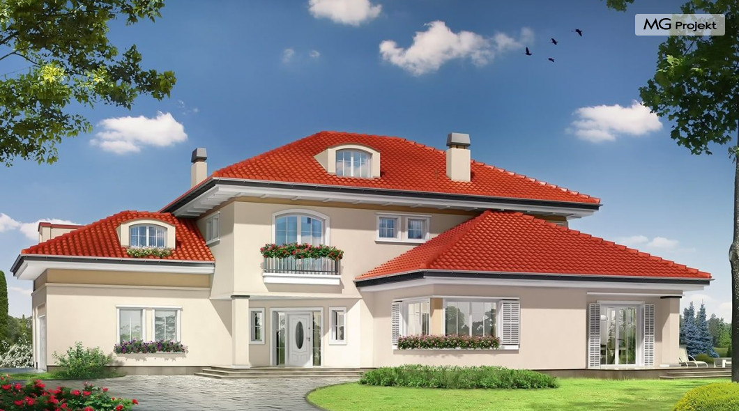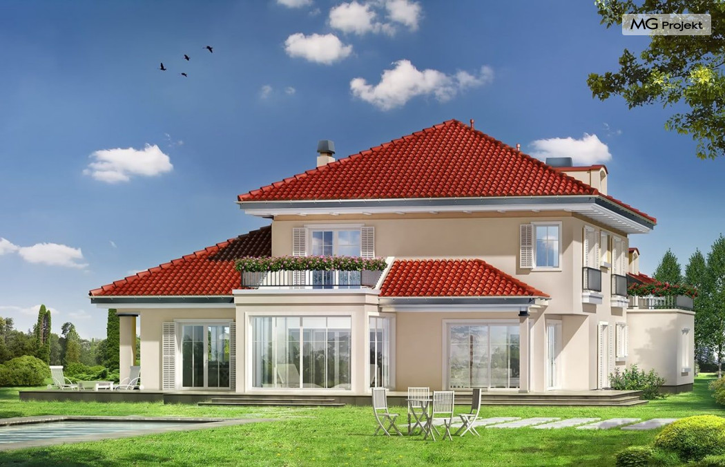 Projekt domu Malibu to wspaniała podmiejska rezydencja na ładną działkę. Budynek urzeka pięknymi otwarciami pomieszczeń na ogród, oraz bardzo reprezentacyjnym wejściem. Piętrowy dom, zaprojektowano łącząc ze sobą trzy bryły: dwukondygnacyjną główną bryłę budynku, oraz dwie parterowe z poddaszami - garażową i kryjącą kuchnię i jadalnię. Wejście ze ściętego narożnika, przez podcień stanowi złamanie formy typowego wejścia do rezydencji. Inspiracją przy projektowaniu domu Malibu były wzory śródziemnomorskich, włoskich czy francuskich willi, co zdecydowanie wyróżnia go spośród architektury polskiej tradycji dworkowej. Złamanie zasady symetrii bryły i wnętrza dało wolność w kształtowaniu funkcji poszczególnych pomieszczeń. Dom Malibu, jak na rezydencję w południowym stylu przystało otoczony jest tarasami, podcieniami, dużymi przeszkleniami, łączącymi wnętrze z otaczającym ogrodem. Dodatkowym urozmaiceniem są balkony i tarasy na piętrze. Wnętrze domu to: otwarta jednoprzestrzenna część dzienna, z salonem, jadalnią, pięknie przeszkloną oranżerią, reprezentacyjnym holem i częściowo otwartą kuchnią. Dodatkowo na parterze zaplanowano pokój - gabinet, oraz garaż i pomieszczenia techniczne. Na piętrze mieszczą się cztery sypialnie z garderobami i dwiema łazienkami, oraz pralnia, pokój rekreacyjny nad garażem, oraz osobne schody na strych nad piętrem, gdzie można zaaranżować duży pokój - studio, lub pozostawić strych. Budynek jest duży, reprezentacyjny, ale zaprojektowano go bez niepotrzebnej rozrzutności, z dbałością o funkcjonalność każdego fragmentu wnętrza. Pracownia posiada projekt domu Malibu w odbiciu lustrzanym.