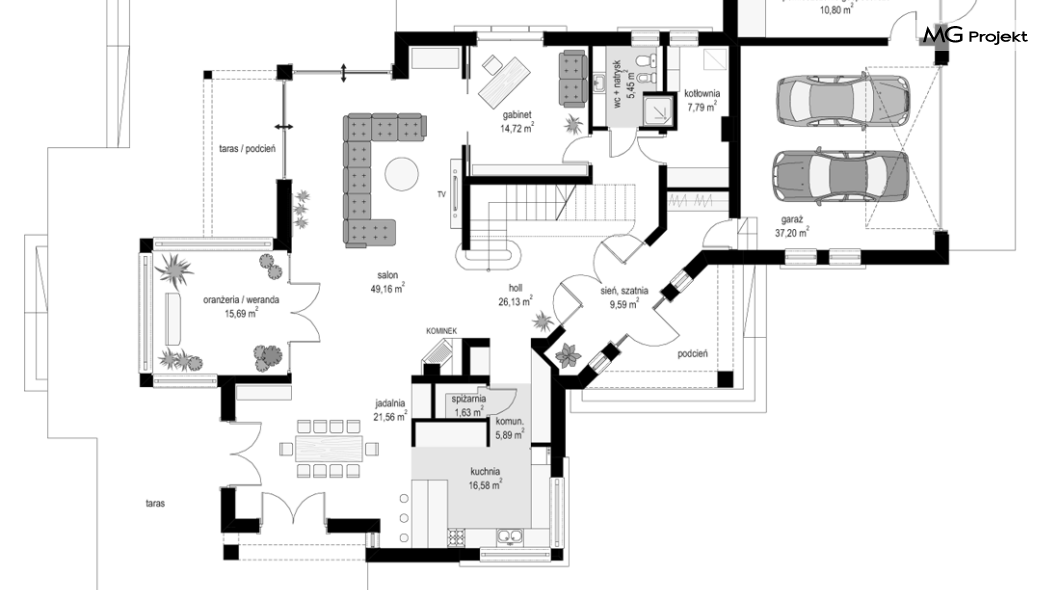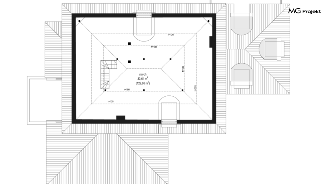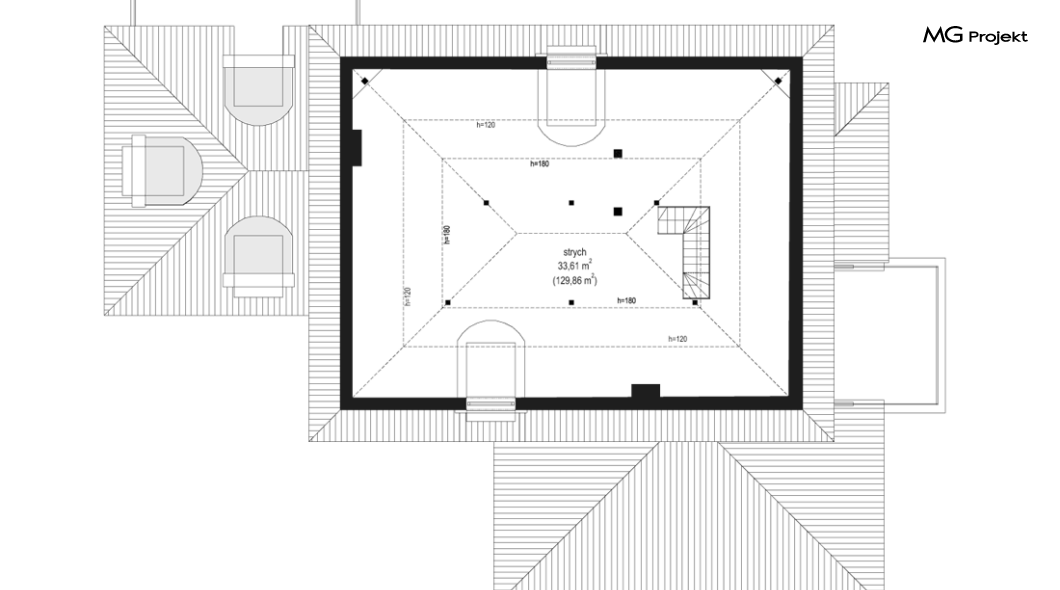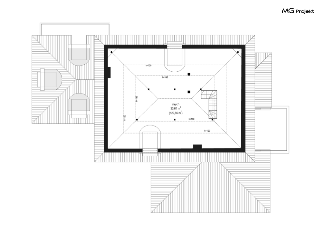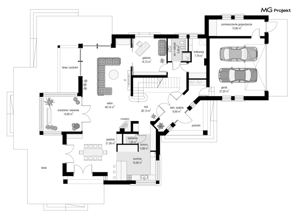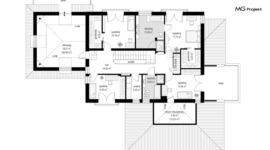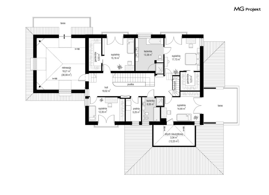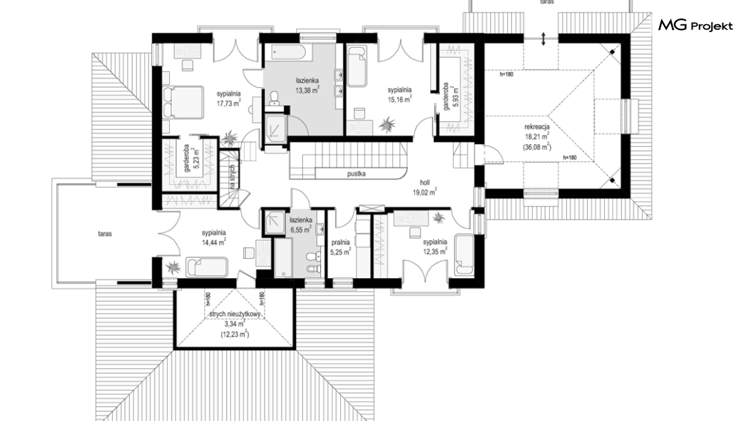 Projekt domu Malibu to wspaniała podmiejska rezydencja na ładną działkę. Budynek urzeka pięknymi otwarciami pomieszczeń na ogród, oraz bardzo reprezentacyjnym wejściem. Piętrowy dom, zaprojektowano łącząc ze sobą trzy bryły: dwukondygnacyjną główną bryłę budynku, oraz dwie parterowe z poddaszami - garażową i kryjącą kuchnię i jadalnię. Wejście ze ściętego narożnika, przez podcień stanowi złamanie formy typowego wejścia do rezydencji. Inspiracją przy projektowaniu domu Malibu były wzory śródziemnomorskich, włoskich czy francuskich willi, co zdecydowanie wyróżnia go spośród architektury polskiej tradycji dworkowej. Złamanie zasady symetrii bryły i wnętrza dało wolność w kształtowaniu funkcji poszczególnych pomieszczeń. Dom Malibu, jak na rezydencję w południowym stylu przystało otoczony jest tarasami, podcieniami, dużymi przeszkleniami, łączącymi wnętrze z otaczającym ogrodem. Dodatkowym urozmaiceniem są balkony i tarasy na piętrze. Wnętrze domu to: otwarta jednoprzestrzenna część dzienna, z salonem, jadalnią, pięknie przeszkloną oranżerią, reprezentacyjnym holem i częściowo otwartą kuchnią. Dodatkowo na parterze zaplanowano pokój - gabinet, oraz garaż i pomieszczenia techniczne. Na piętrze mieszczą się cztery sypialnie z garderobami i dwiema łazienkami, oraz pralnia, pokój rekreacyjny nad garażem, oraz osobne schody na strych nad piętrem, gdzie można zaaranżować duży pokój - studio, lub pozostawić strych. Budynek jest duży, reprezentacyjny, ale zaprojektowano go bez niepotrzebnej rozrzutności, z dbałością o funkcjonalność każdego fragmentu wnętrza. Pracownia posiada projekt domu Malibu w odbiciu lustrzanym.