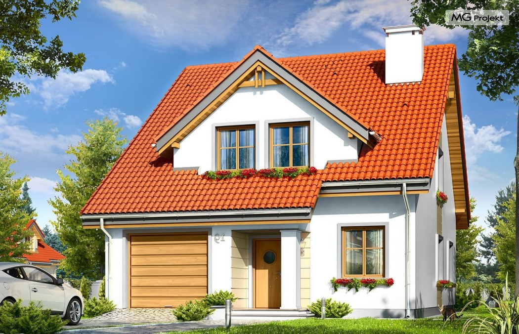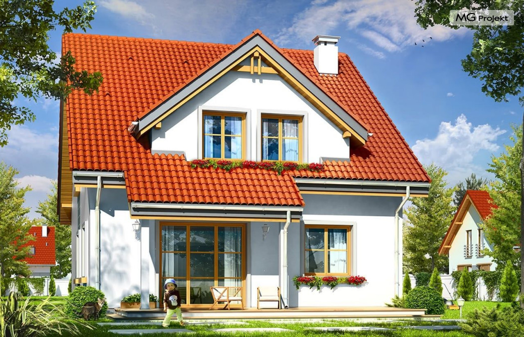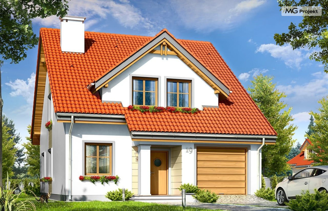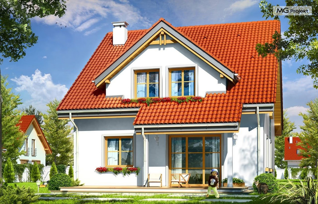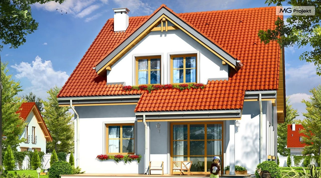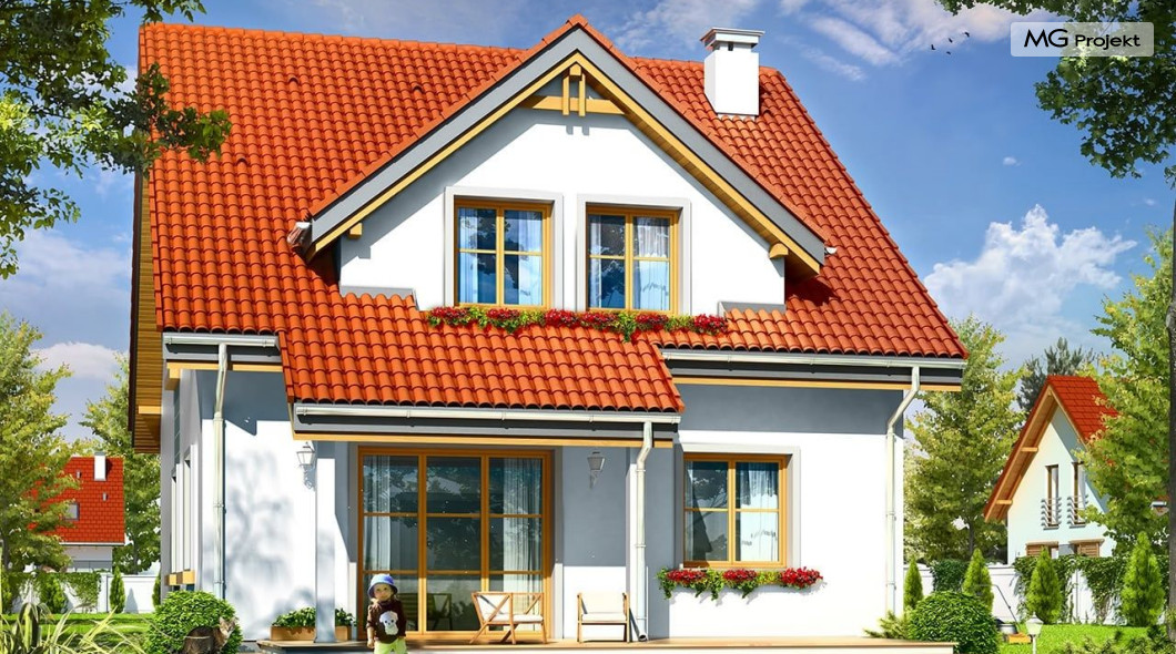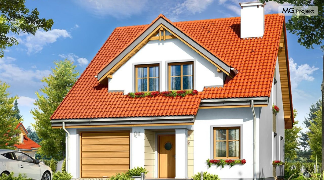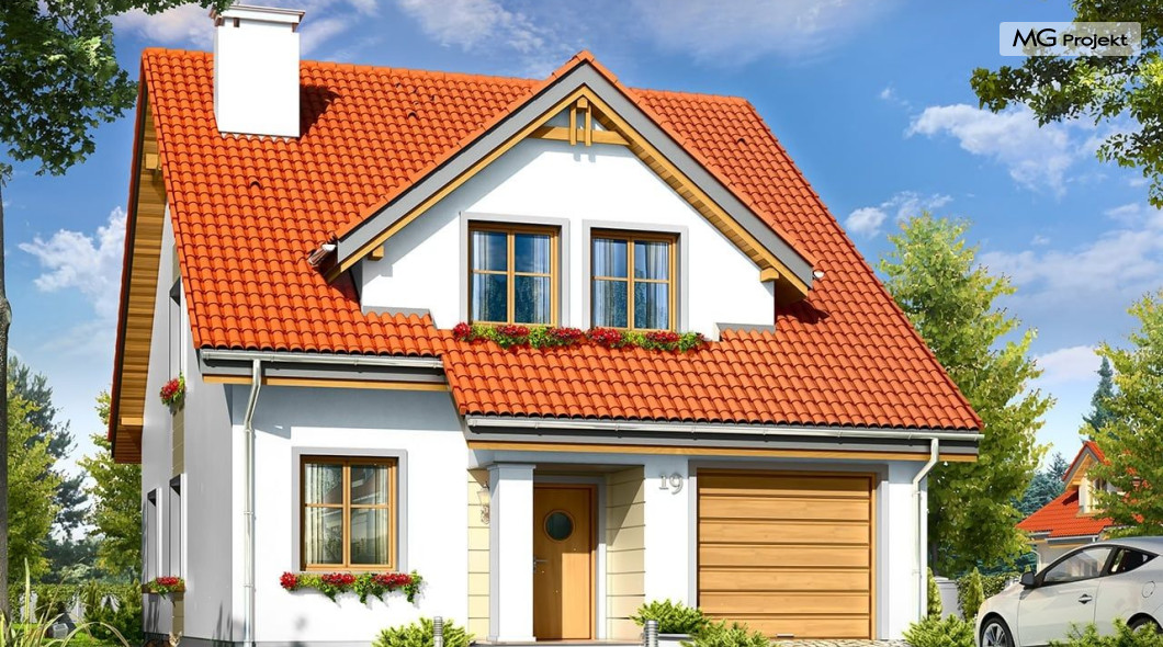 Projekt domu Mewa to domek jednorodzinny, dla 4-5cioosobowej rodziny. Projekt łączy w sobie tradycyjny solidny wygląd, bezpretensjonalność, prostotę konstrukcji, oraz funkcjonalność i klarowność wnętrza. Dom Mewa – dzięki zwartej bryle, zbudowanej na planie prostokąta, jest energooszczędny, a także łatwy i niedrogi w budowie. Dzięki dość wąskiej elewacji frontowej zmieści się na działce o szerokości zaledwie 16 m. Budynek w łatwy sposób można zamienić na bliźniaka, można z niego także zrobić szeregówkę. Prosty układ konstrukcyjny - parterowa bryła z poddaszem przekrytym dwuspadowym dachem – nie powinien sprawić kłopotów wykonawczych żadnej ekipie budowlanej. Właściwy stosunek powierzchni przegród zewnętrznych do uzyskanej kubatury sprzyja energooszczędności budynku. Wygląd zewnętrzny domu Mewa doskonale wpasuje się w sąsiednią zabudowę przedmieść. Elewacje urozmaicają duże lukarny w dwuspadowym dachu, wystający nieco garaż z podcieniem wejściowym, oraz – od tyłu – zadaszenie tarasu, na który możemy wyjść z salonu przez ładne przeszklone drzwi. Wnętrze domu podzielono na część dzienną, oraz gospodarczą na parterze i sypialnie na poddaszu. Na parterze zaprojektowano bardzo ładne jednoprzestrzenne wnętrze połączonego salonu z jadalnią, kuchnią i holem. Kuchnia jest otwarta na salon – można ją łatwo oddzielić ścianką działową. Pozostałe pomieszczenia parteru to wygodny garaż z magazynem pod schodami, kotłownia, łazienka i przedsionek. Na poddaszu znajdziemy cztery bardzo ładne, ustawne sypialnie, oraz łazienkę. Wnętrze można dowolnie modyfikować przestawiając ścianki działowe - zostawiając na przykład trzy sypialnie i dodając jeszcze jedną łazienkę i garderobę rodziców. Nad poddaszem jest jeszcze ładny strych, który również można zaadaptować. Projekt domu Mewa jest dla Klientów szukających prostej konstrukcji, bez udziwnień, chcących „wycisnąć” jak najwięcej powierzchni za rozsądne pieniądze. Pracownia posiada odbicie lustrzane projektu domu Mewa.