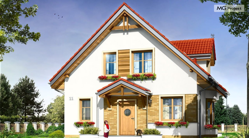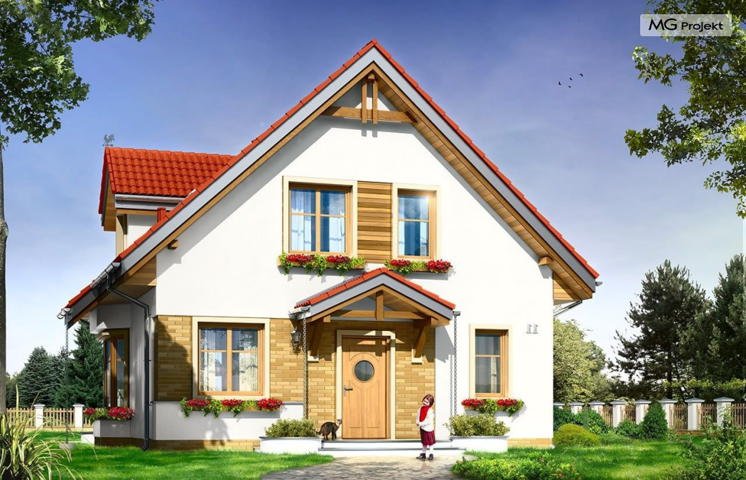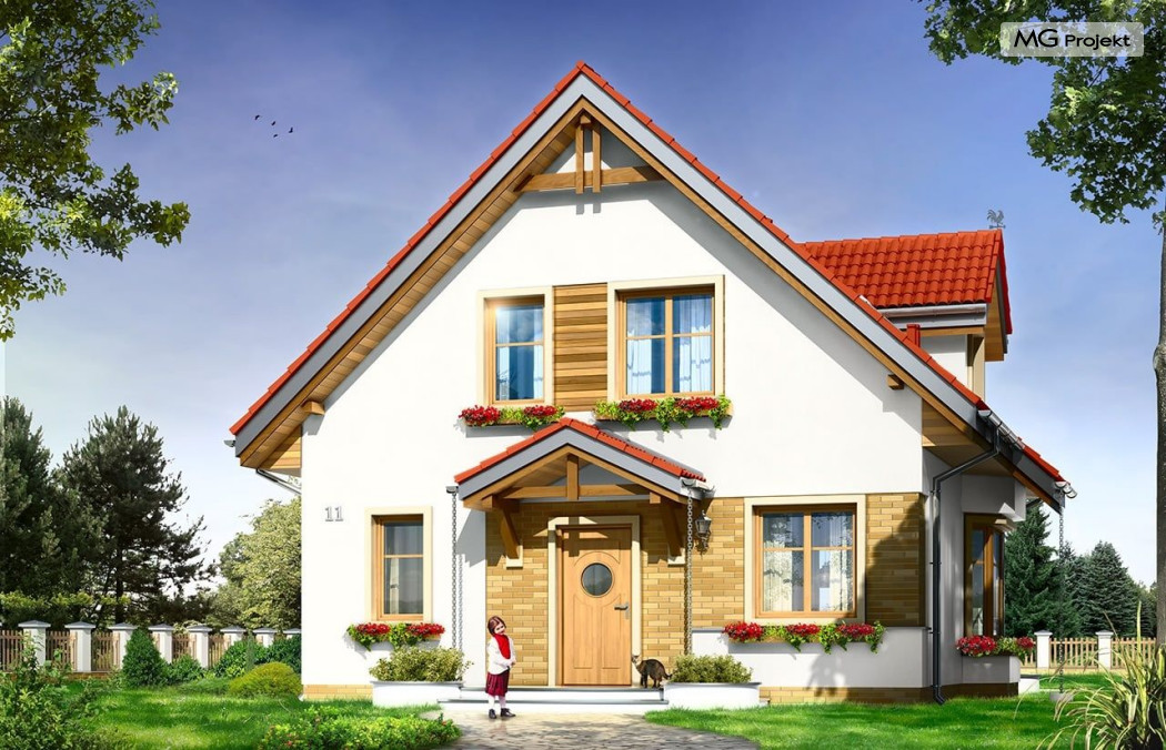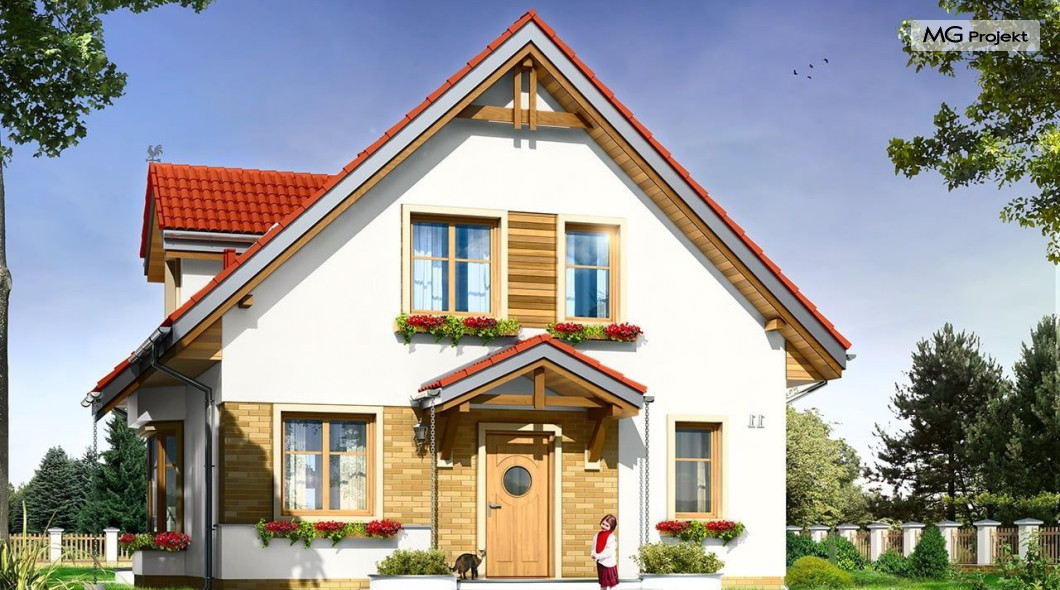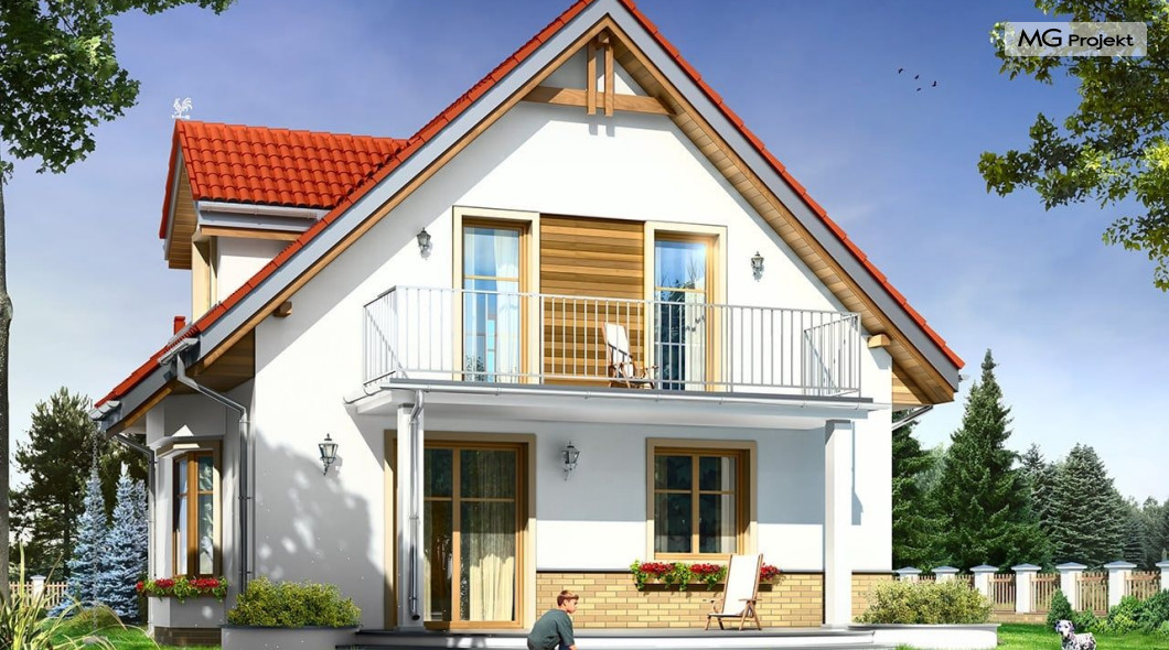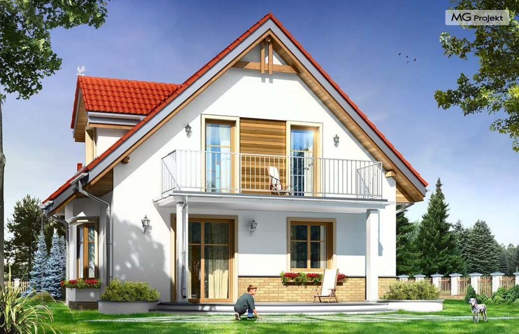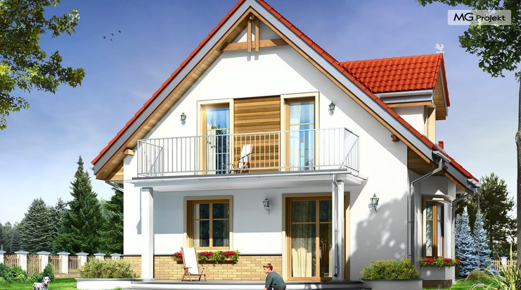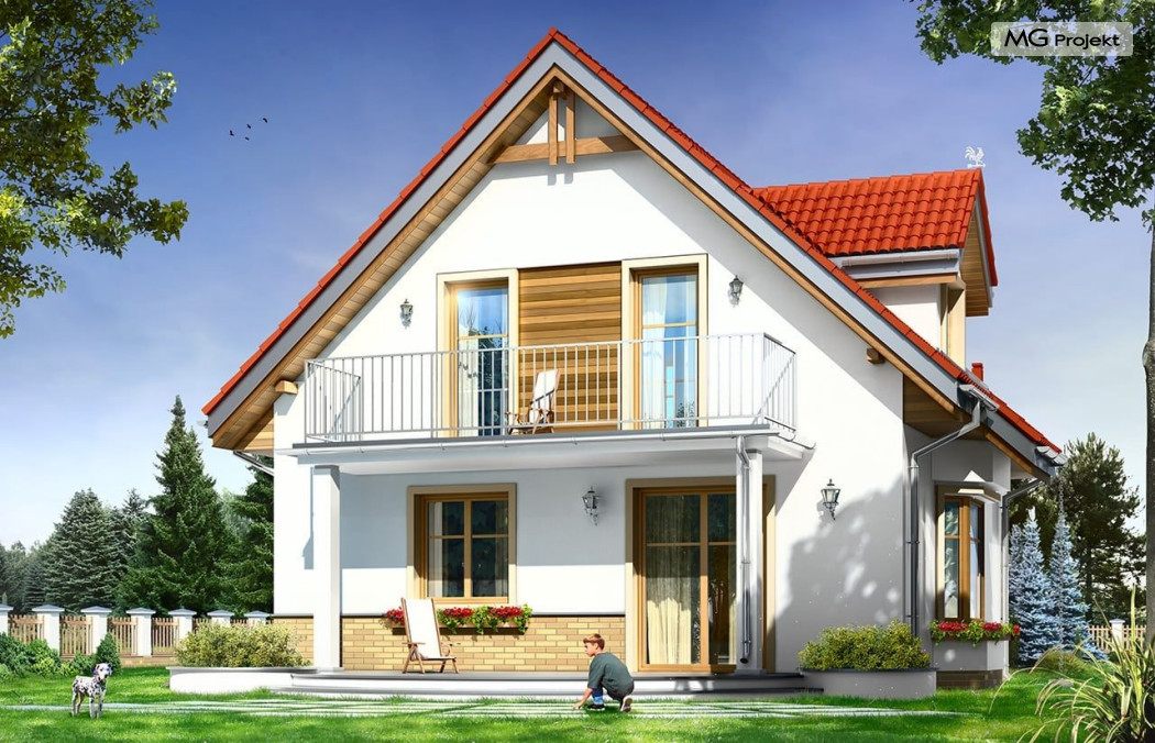 Projekt domu Michalina to uroczy domek jednorodzinny – zrealizowany jako „braciszek” projektu Michałek - oba domy mają podobną wielkość i rozplanowanie wnętrza, różną się kształtem dachu. Dom Michalina został zaprojektowany dla czteroosobowej rodziny - budynek jest parterowy z poddaszem użytkowym. Na parterze przewidziano obszerną część dzienną, z salonem, aneksem jadalnym, ładną – otwartą kuchnią, holem i dużą kotłownią. Na poddaszu mieszczą się trzy sypialnie i wygodna łazienka. Tradycyjna bryła budynku, zbudowana na planie kwadratu, została przekryta dwuspadowym dachem. Dach zaprojektowano tak, aby ściany szczytowe domu były od strony elewacji frontowej i ogrodowej. Front budynku ozdabia zgrabny daszek podkreślający wejście. Od strony ogrodu zaprojektowano z kolei balkon na kolumnach, będący jednocześnie zadaszeniem tarasu. Architektura domu jest spokojna, jednocześnie zachowane zostały właściwe proporcje bryły. Zastosowane nowoczesne materiały i ciekawa kolorystyka dają udany efekt całości. Projekt domu Michalina to doskonała propozycja dla Inwestorów szukających niedużego, wygodnego domu dla swojej rodziny, biorących pod uwagę oszczędność kosztów, prostotę budowy i niewielki koszt utrzymania domu. Pracownia posiada również wersję odbicia lustrzanego projektu domu Michalina.