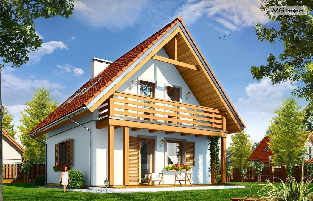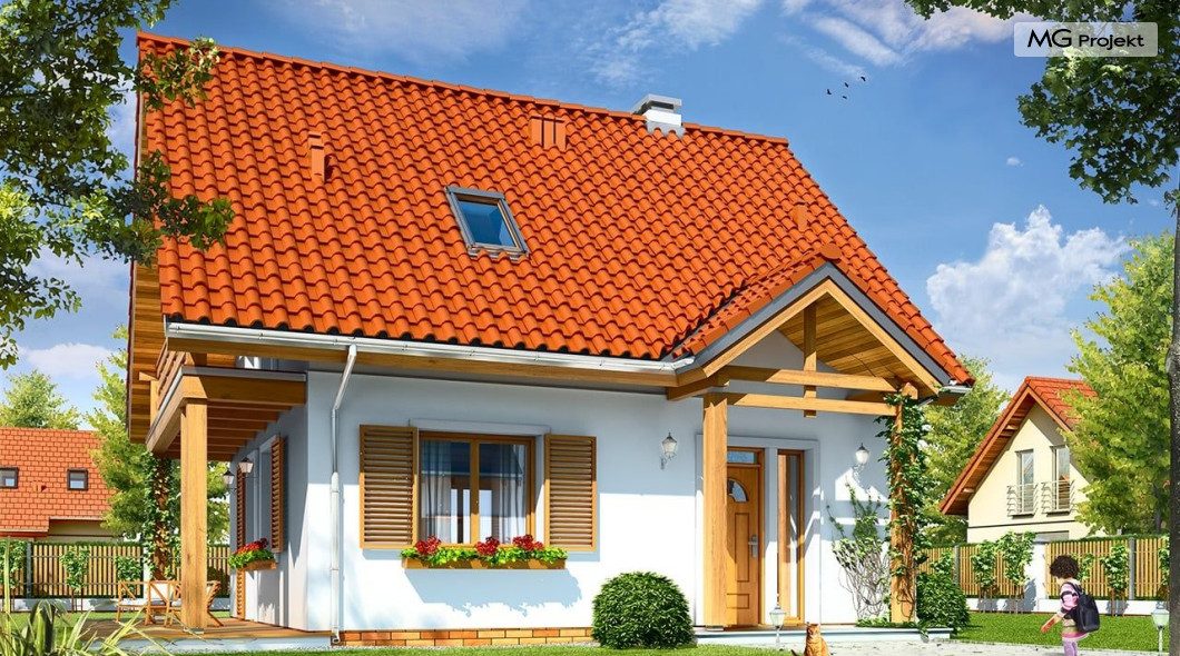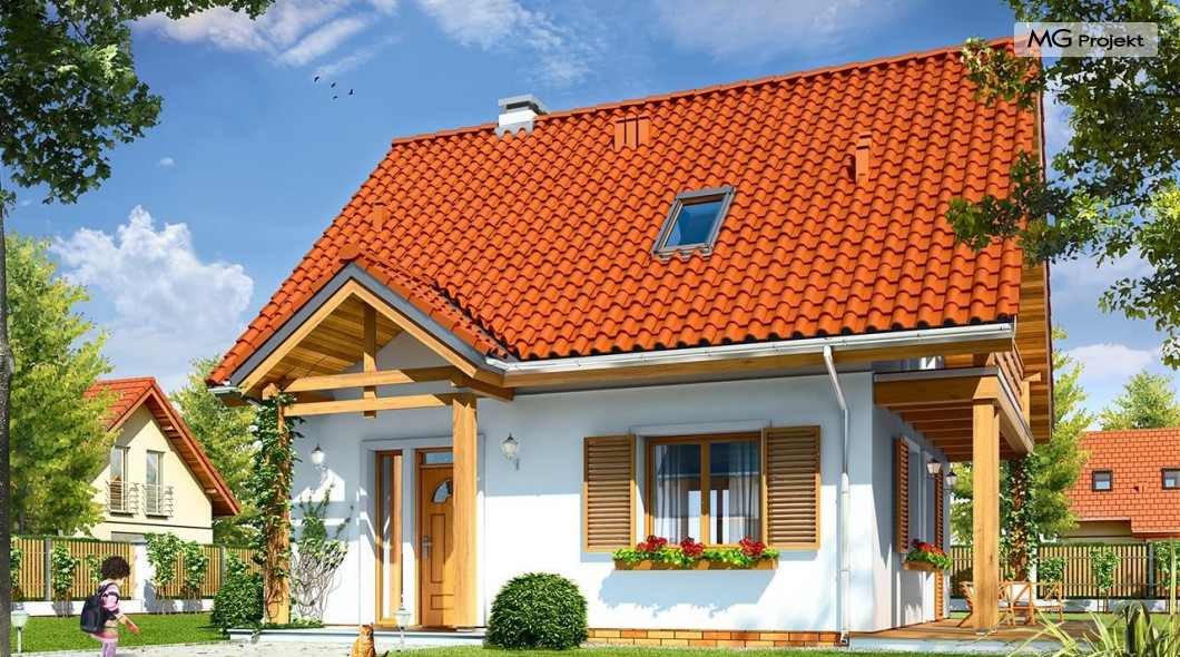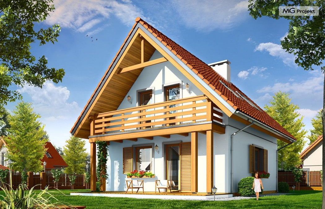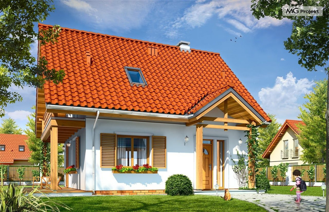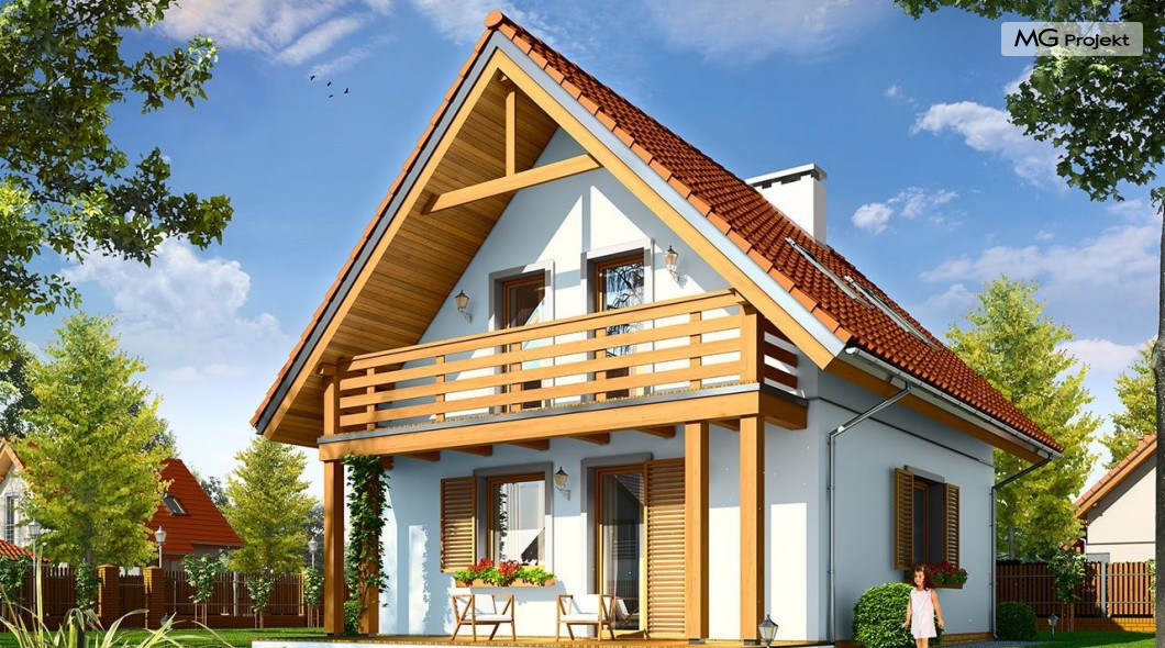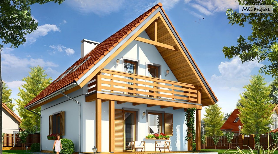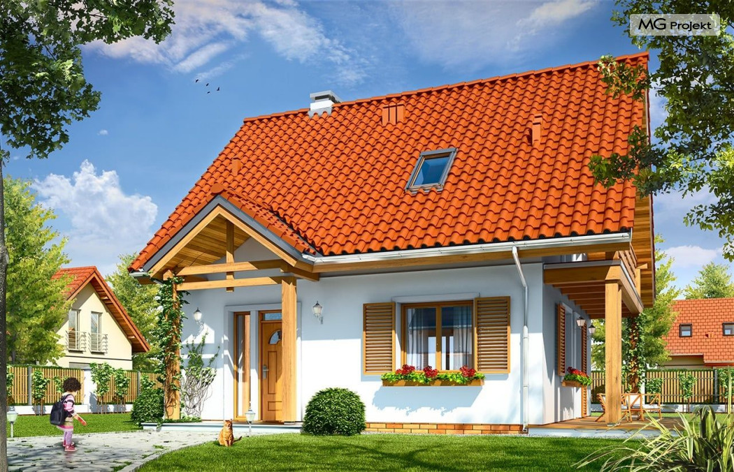 Projekt domu Milutki przeznaczony jest dla trzy-czteroosobowej rodziny. Dom został zaprojektowany jako jednorodzinny całoroczny, może też służyć jako budynek letniskowy. Prostokątny rzut parteru został przykryty dwuspadowym dachem, mieszczącym w sobie poddasze użytkowe. Ciekawą bryłę urozmaicono zadaszeniem tarasu i balkonem od strony ogrodu, oraz wspartym na dwóch kolumienkach daszkiem nad wejściem. Architektura domu łączy w sobie tradycyjną formę, z nowoczesnym detalem i materiałami. Projekt dzięki swojej bezpretensjonalności doskonale wpisuje się w każde otoczenie. Milutki dobrze będzie wyglądał i w górach, i na Mazurach :-). Wnętrze domu podzielono na część dzienną na parterze i sypialnie na poddaszu. Połączone pomieszczenia salonu, kuchni i holu tworzą dużą otwartą wspólną przestrzeń. Sprytnie umiejscowione schody na piętro są ozdobą pokoju dziennego. Centralnie umieszczony komin obsługuje zarówno kominek w salonie jak i kocioł w sąsiedniej kotłowni. Kotłownia zaprojektowana jako gazowa, może być łatwo dostosowana dla pieca na paliwo stałe. Na poddaszu znalazło się miejsce dla trzech niewielkich sypialni i łazienki. Ścianki działowe poddasza można łatwo i dowolnie przestawiać, zmieniając konfigurację pomieszczeń. Projekt domu Milutki uwzględnia bardzo dobre ocieplenia przegród. Dom jest energooszczędny - zastosowano w nim nowoczesne instalacje. Dzięki prostej i niedrogiej w realizacji konstrukcji z jednej strony i zastosowanym energooszczędnym technologiom z drugiej strony, dom będzie tani w budowie i późniejszej eksploatacji. Projekt domu Milutki jest idealną propozycją dla liczących pieniądze Inwestorów pragnących mieszkać w oszczędnym i uroczym domku jednorodzinnym. Pracownia posiada odbicie lustrzane projektu.
