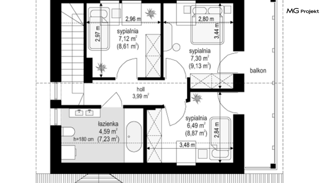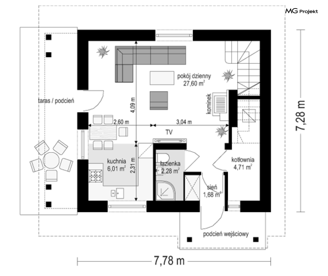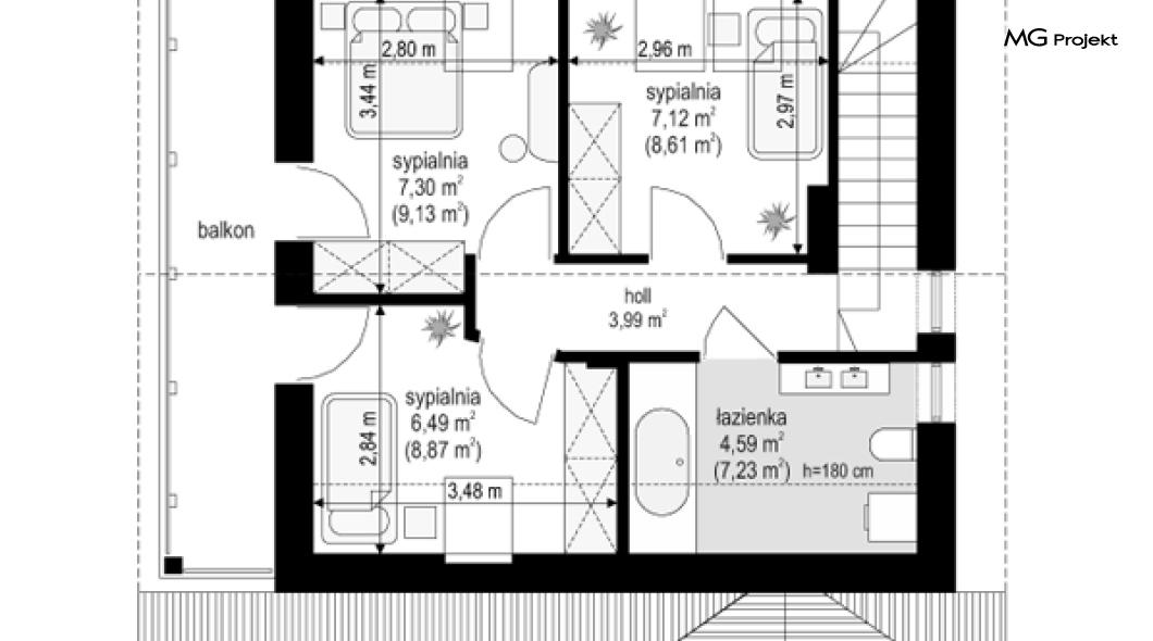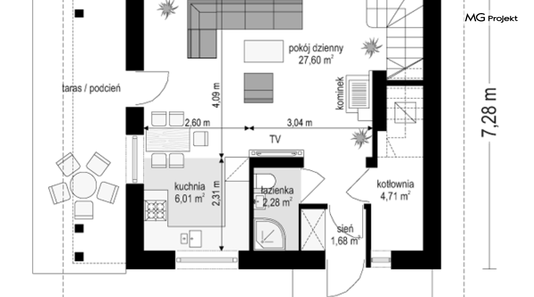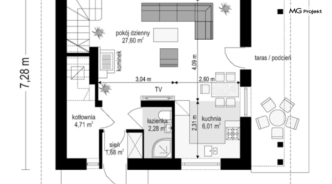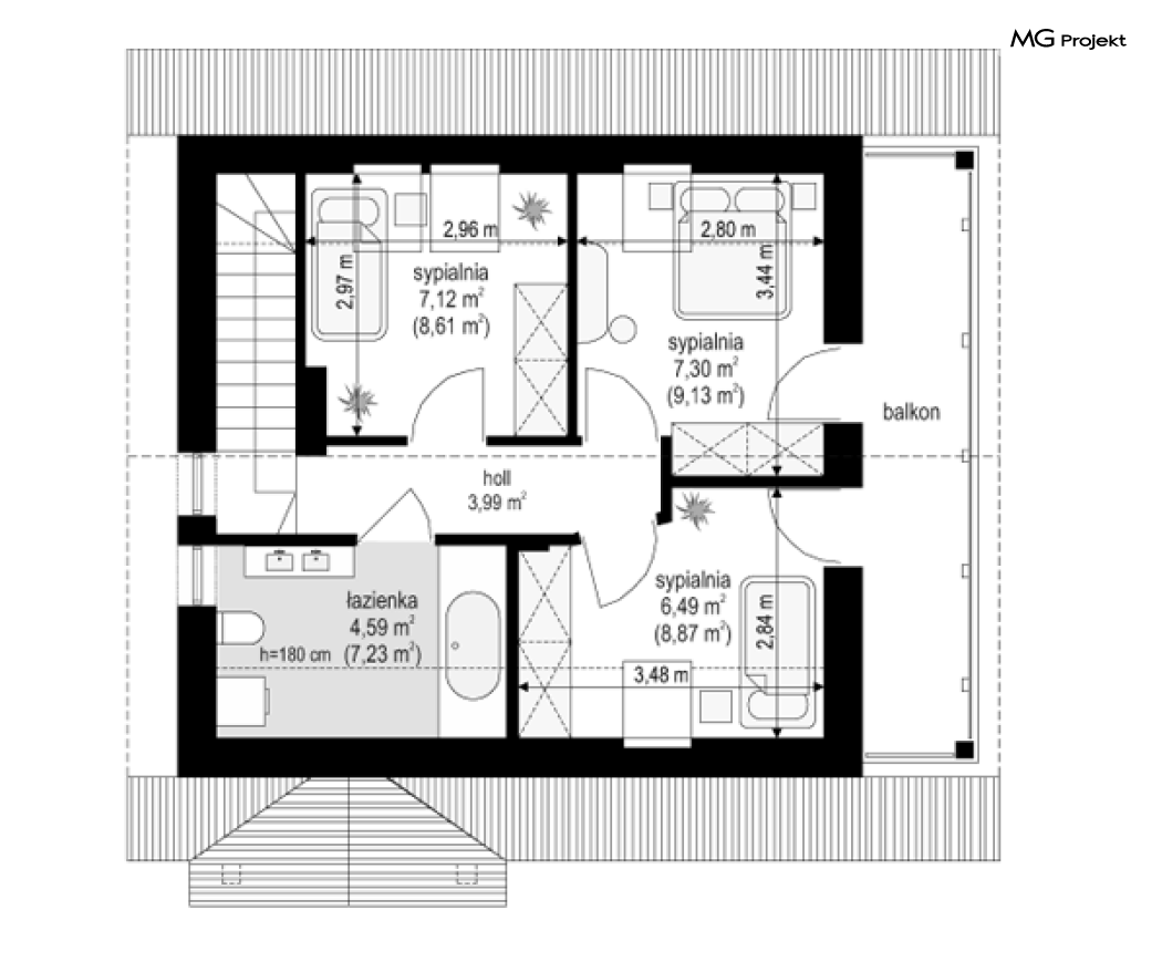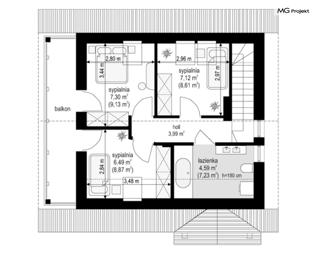 Projekt domu Milutki przeznaczony jest dla trzy-czteroosobowej rodziny. Dom został zaprojektowany jako jednorodzinny całoroczny, może też służyć jako budynek letniskowy. Prostokątny rzut parteru został przykryty dwuspadowym dachem, mieszczącym w sobie poddasze użytkowe. Ciekawą bryłę urozmaicono zadaszeniem tarasu i balkonem od strony ogrodu, oraz wspartym na dwóch kolumienkach daszkiem nad wejściem. Architektura domu łączy w sobie tradycyjną formę, z nowoczesnym detalem i materiałami. Projekt dzięki swojej bezpretensjonalności doskonale wpisuje się w każde otoczenie. Milutki dobrze będzie wyglądał i w górach, i na Mazurach :-). Wnętrze domu podzielono na część dzienną na parterze i sypialnie na poddaszu. Połączone pomieszczenia salonu, kuchni i holu tworzą dużą otwartą wspólną przestrzeń. Sprytnie umiejscowione schody na piętro są ozdobą pokoju dziennego. Centralnie umieszczony komin obsługuje zarówno kominek w salonie jak i kocioł w sąsiedniej kotłowni. Kotłownia zaprojektowana jako gazowa, może być łatwo dostosowana dla pieca na paliwo stałe. Na poddaszu znalazło się miejsce dla trzech niewielkich sypialni i łazienki. Ścianki działowe poddasza można łatwo i dowolnie przestawiać, zmieniając konfigurację pomieszczeń. Projekt domu Milutki uwzględnia bardzo dobre ocieplenia przegród. Dom jest energooszczędny - zastosowano w nim nowoczesne instalacje. Dzięki prostej i niedrogiej w realizacji konstrukcji z jednej strony i zastosowanym energooszczędnym technologiom z drugiej strony, dom będzie tani w budowie i późniejszej eksploatacji. Projekt domu Milutki jest idealną propozycją dla liczących pieniądze Inwestorów pragnących mieszkać w oszczędnym i uroczym domku jednorodzinnym. Pracownia posiada odbicie lustrzane projektu.