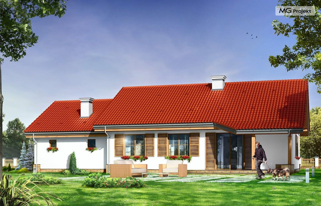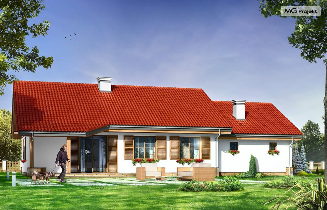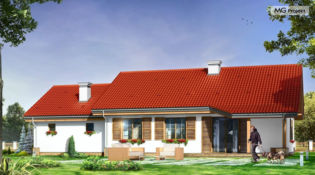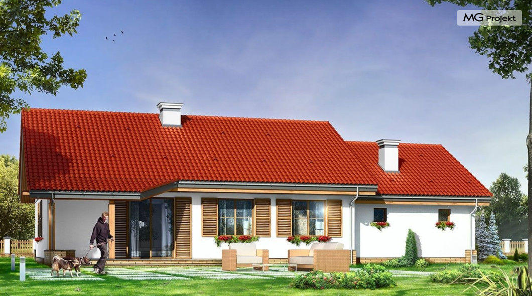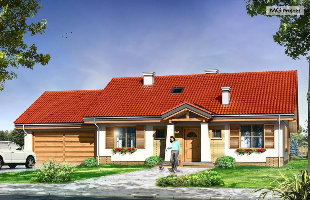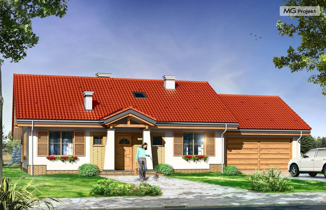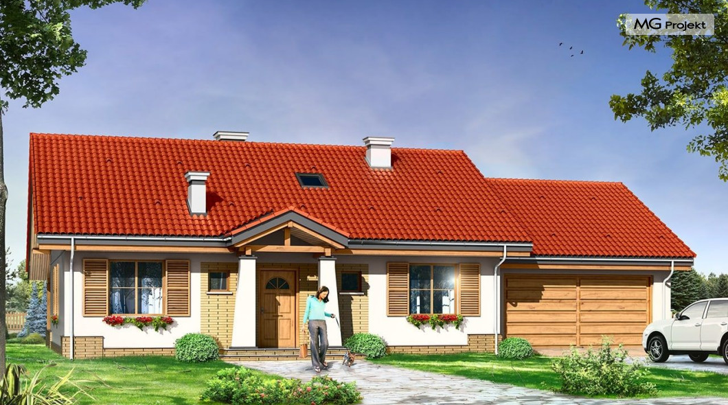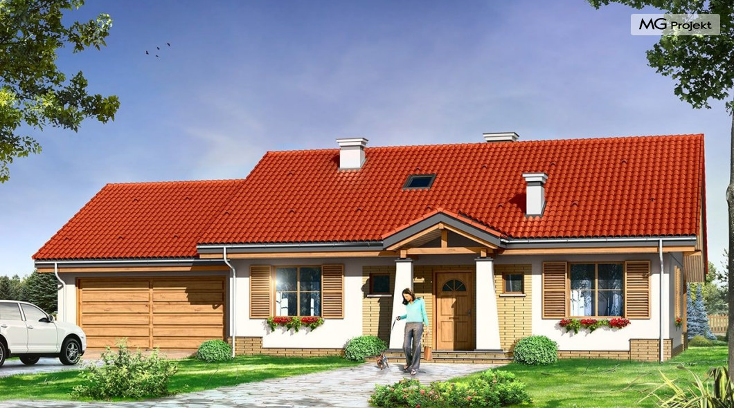Projekt domu Niezapominajka z garażem 2 to wariant popularnego projektu Niezapominajka – tym razem z podwójnym garażem i obszerną częścią gospodarczą. Projekt domu Niezapominajka z garażem 2 to dom jednorodzinny, parterowy, przeznaczony dla cztero- pięcioosobowej rodziny. Prostokątna bryła budynku z dobudowanym garażem została przekryta dwuspadowymi dachami. Nieużytkowy strych nad parterem można zaadaptować na poddasze. Architektonicznie dom nawiązuje do typowej tradycyjnej stylistyki. Front domu z zaakcentowanym gankiem wejściowym wspartym na dwóch kolumnach z oknami po bokach, przypomina polski dworek. Wnętrze domu podzielono na część dzienną, z salonem, holem i częściowo otwartą kuchnią, oraz część nocną z trzema sypialniami i łazienką. Zaletą tej wersji projektu jest kotłownia przeniesiona do pomieszczenia za garażem, dzięki czamu dom można ogrzewać gazem, ale też zamiennie paliwem stałym. Projekt domu Niezapominajka z garażem 2 stanowi świetną propozycję dla inwestorów chcących niedrogo wybudować dom, którzy planują zostawić sobie możliwość wykończenia w drugim etapie dodatkowej przestrzeni na strychu – lub po prostu mieć duży przydatny przecież strych. Pracownia posiada wersję odbicia lustrzanego projektu oraz innych jego wariantów: projekt domu Niezapominajka, projekt domu Niezapominajka z garażem.