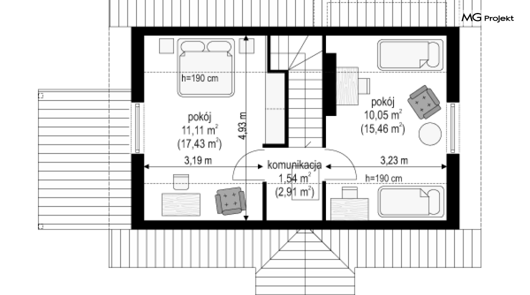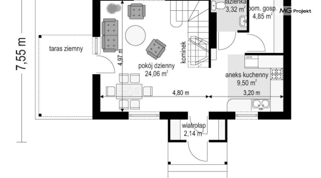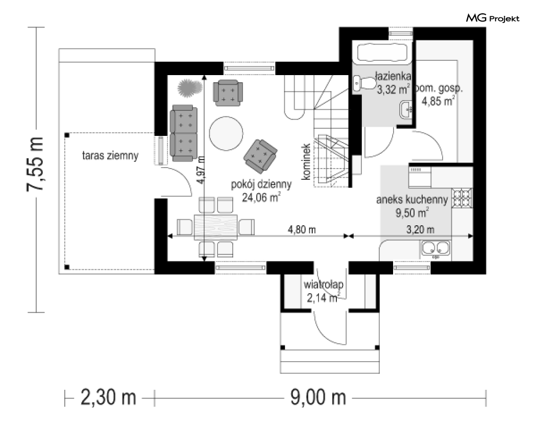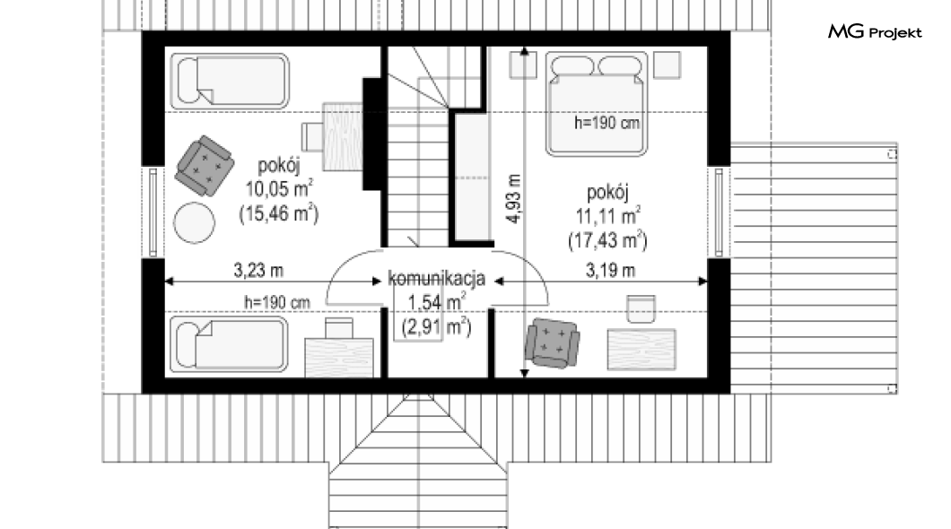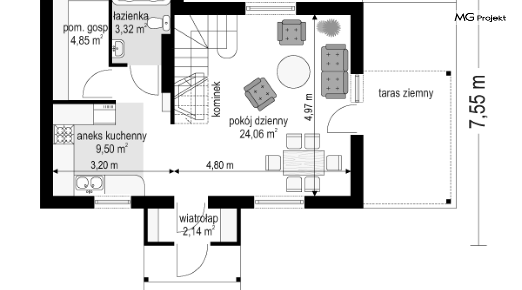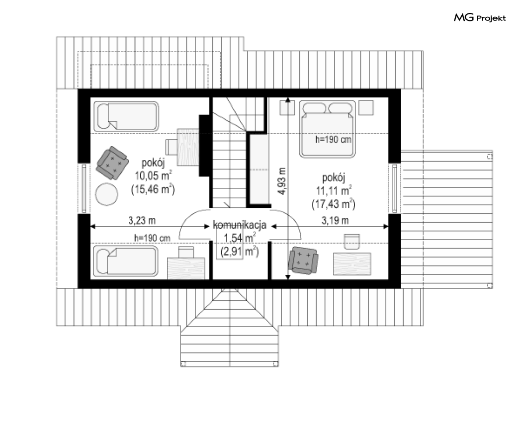 Projekt domu Okruszek jest rozbudowaną wersją projektu domu Sosenka. Budynek powiększony został o pomieszczenie gospodarcze na parterze, przedsionek z daszkiem przed wejściem i zadaszony częściowo taras. Projekt domku Okruszek jest świetnym rozwiązaniem dla małej rodziny, może służyć zarówno jako dom letniskowy jak i całoroczny. Budynek jest tani w budowie, jak i późniejszej eksploatacji. Jego bryła ukształtowana zaprojektowana została z myślą o ewentualnej rozbudowie. Częściowe podpiwniczenie może być pomocne przy konieczności umieszczenia w domu np. hydroforu. Duży salon na parterze z kominkiem, z wyjściem na częściowo zadaszony taras. Na poddaszu zaprojektowano dwie obszerne sypialnie. Pracownia posiada odbicie lustrzane projektu domu Okruszek oraz wersję niepodpiwniczoną lub z całkowitym podpiwniczeniem. Zapraszamy do obejrzenia wszystkich domków z tej serii: https://www.mgprojekt.com.pl/okruszek, https://www.mgprojekt.com.pl/okruszek-wariant-b, https://www.mgprojekt.com.pl/okruszek-wariant-e