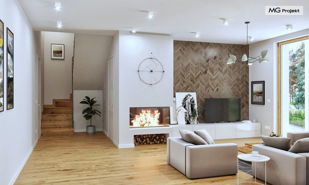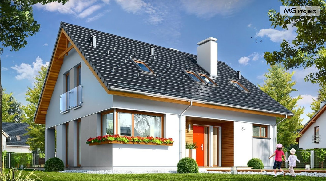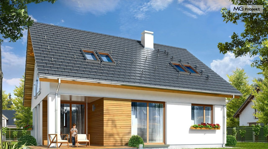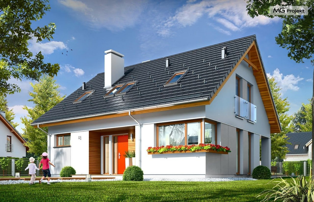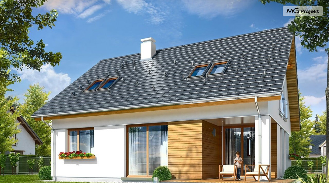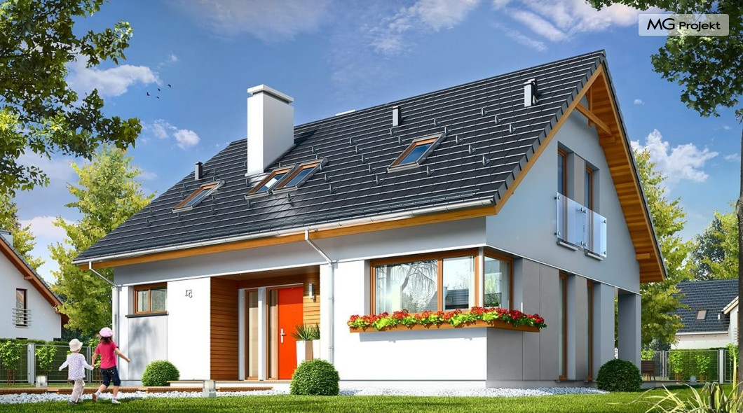 Projekt domu Optymalny jest to dom jednorodzinny, parterowy z poddaszem użytkowym, przeznaczony dla 4-5 osobowej rodziny.