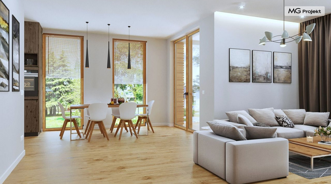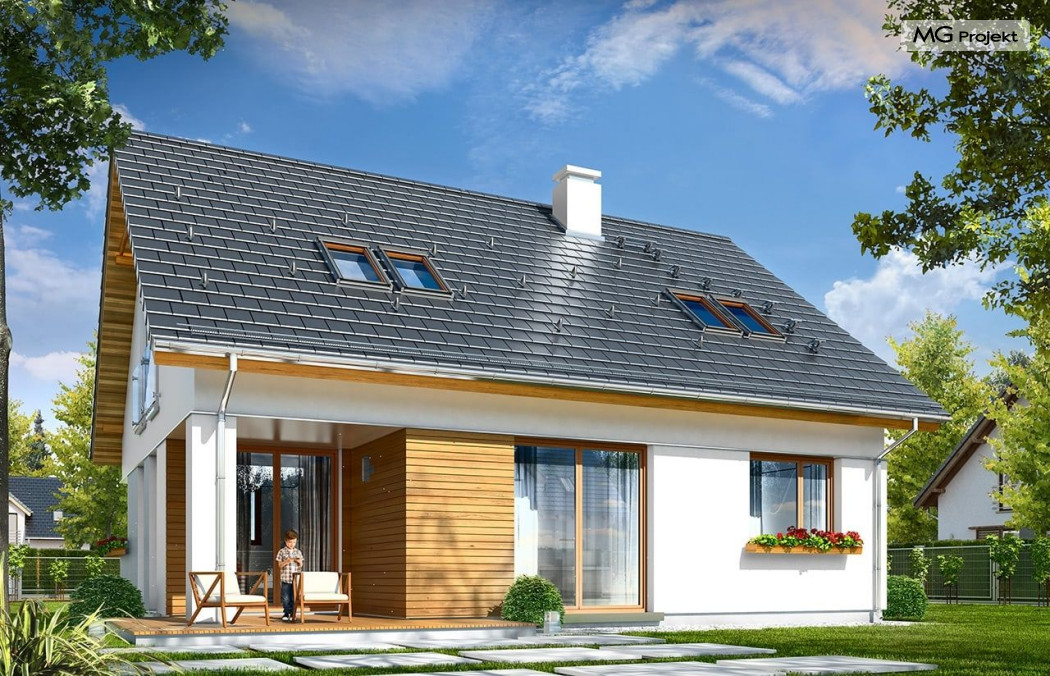Optymalny jest domem o prostej konstrukcji, klarownej, czytelnej bryle. Prostokątny rzut parteru w domu Optymalny przekryty jest symetrycznym dwuspadowym dachem. Brak rozczłonkowania zwiększa energooszczędność, poza tym dzięki zwartemu planowi budynek Optymalny zmieści się nawet na niewielkiej działce o ograniczonej powierzchni zabudowy. Wygląd zewnętrzny domu Optymalny łączy w sobie nowoczesne detale z tradycyjną bryłą. Ciekawie rozmieszczone okna, nowoczesne okładziny ścian – wszystkie te elementy zwiększają atrakcyjność budynku.