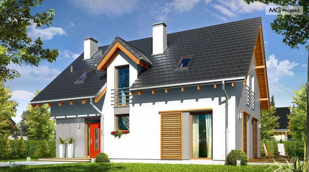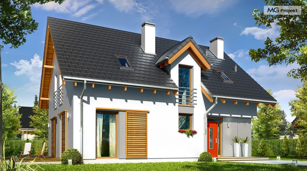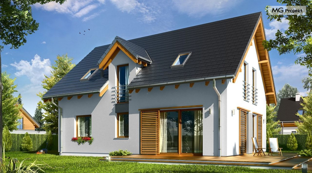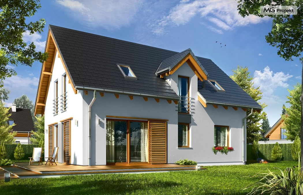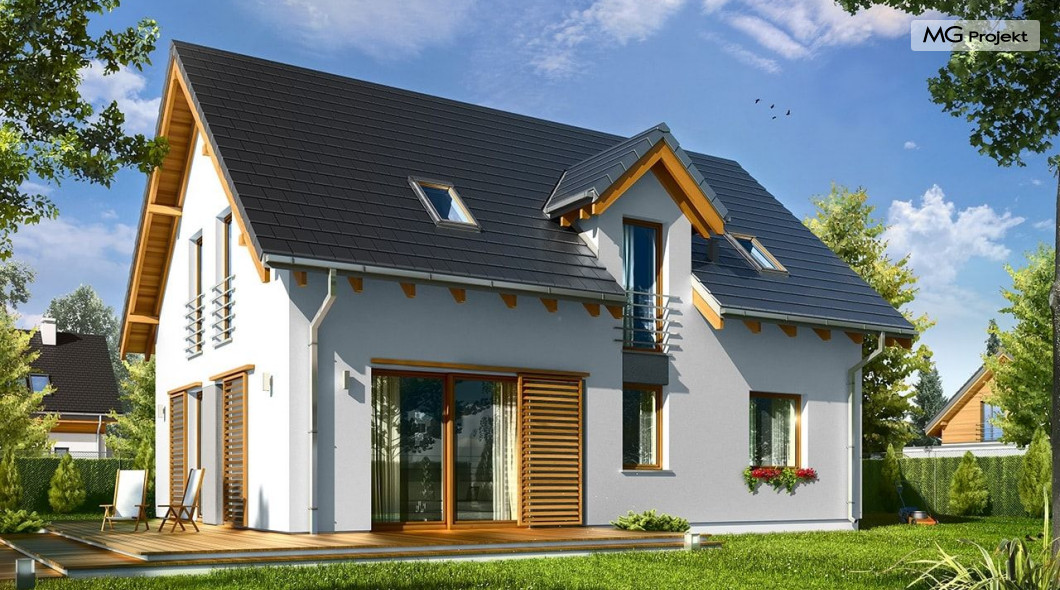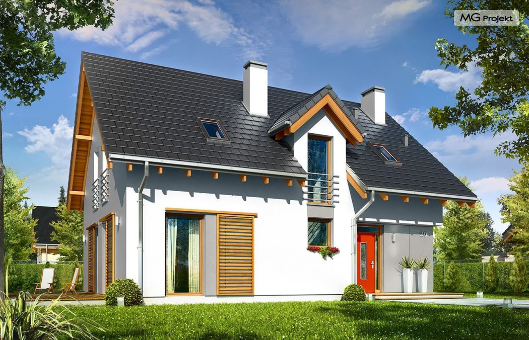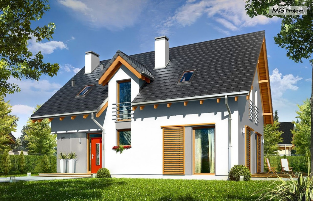 Projekt domu Oskar to budynek jednorodzinny dla 4-5osobowej familii. Parterowy domek z poddaszem użytkowym, rozwiązany na prostokątnym rzucie i przekryty symetrycznym dachem. Bryła budynku jest proporcjonalna i bliska skali człowieka. Właściwe proporcje, oszczędna forma i dopracowane nowoczesne detale dają bardzo estetyczny wygląd Oskara. Dzięki nieskomplikowanej konstrukcji, budynek będzie łatwy i niedrogi w budowie. Zarówno jego sylwetka, jak i układ pomieszczeń w środku rozwiązano optymalnie. Do domu wchodzimy przez delikatny frontowy podcień wejściowy. Elewację frontową dekoruje lukarna z podwójnym oknem doświetlającym klatkę schodową. Od strony elewacji ogrodowej - z tyłu i z boku domu z kolei, zaprojektowano ładne przeszklone wyjścia na narożny taras. Wnętrze podzielono na część dzienną na parterze (nie licząc dodatkowego pokoju – gabinetu, lub sypialni gościnnej), oraz sypialnie na poddaszu. Połączono przestrzennie salon z jadalnią, oraz kuchnię i częściowo otwarty holl z widocznymi reprezentacyjnymi schodami. Jednoprzestrzenna część dzienna jest dzięki temu wyjątkowo duża. W salonie znajduje się kominek i ściana telewizyjna. Na parterze domu Oskar dodatkowo znalazł swoje miejsce przedsionek z szafami, kotłownia, oraz dodatkowy pokój i łazienka z natryskiem. Na poddaszu mieszczą się trzy bardzo ładne sypialnie, oraz duża łazienka. Sypialnie dziecięce mają wbudowane szafy, a sypialnia rodziców obszerną garderobę. Projekt domu Oskar to energooszczędny, prosty w budowie, ekonomiczny dom, który będzie służył każdego rodzinie przez wiele lat. Jego wielkość jest optymalna – nie jest za duża ani zbyt mały – po prostu w sam raz. Pracownia posiada wersję odbicia lustrzanego projektu domu Oskar.