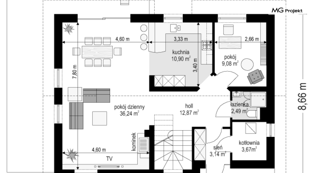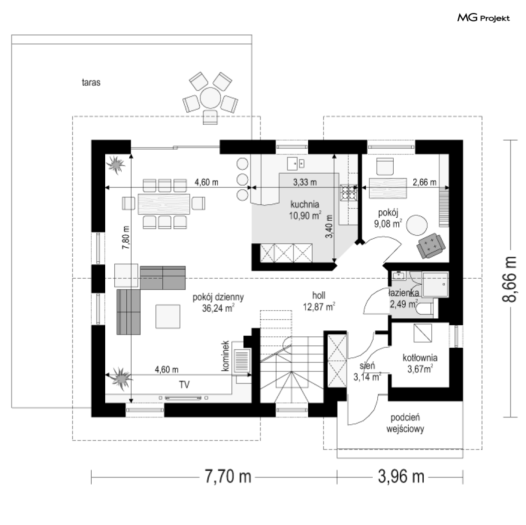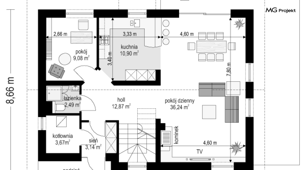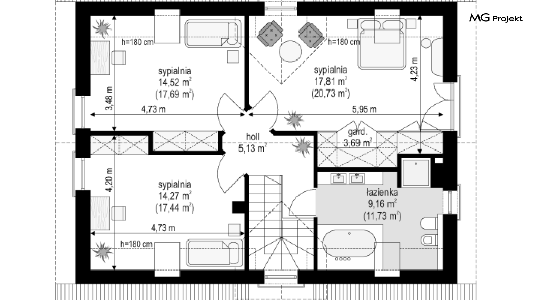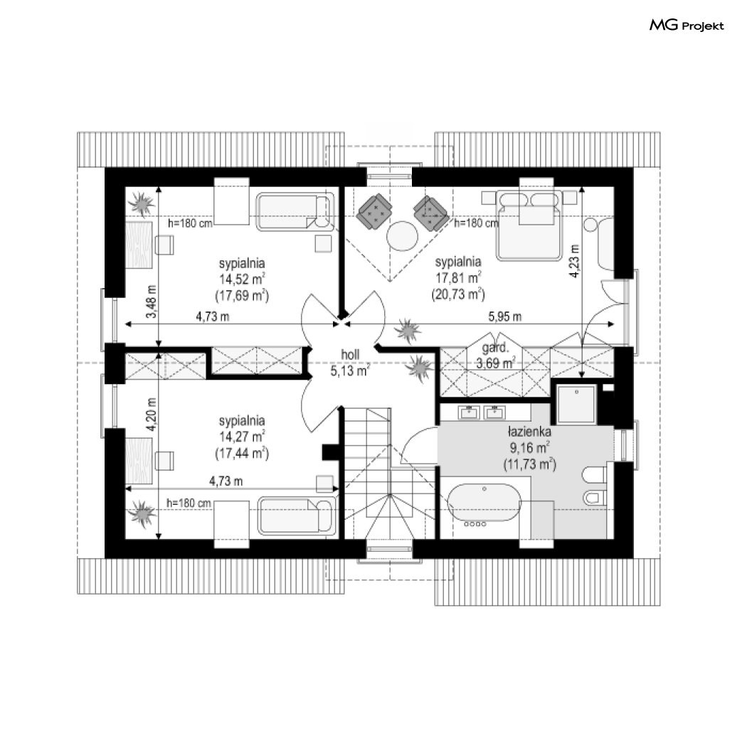 Projekt domu Oskar to budynek jednorodzinny dla 4-5osobowej familii. Parterowy domek z poddaszem użytkowym, rozwiązany na prostokątnym rzucie i przekryty symetrycznym dachem. Bryła budynku jest proporcjonalna i bliska skali człowieka. Właściwe proporcje, oszczędna forma i dopracowane nowoczesne detale dają bardzo estetyczny wygląd Oskara. Dzięki nieskomplikowanej konstrukcji, budynek będzie łatwy i niedrogi w budowie. Zarówno jego sylwetka, jak i układ pomieszczeń w środku rozwiązano optymalnie. Do domu wchodzimy przez delikatny frontowy podcień wejściowy. Elewację frontową dekoruje lukarna z podwójnym oknem doświetlającym klatkę schodową. Od strony elewacji ogrodowej - z tyłu i z boku domu z kolei, zaprojektowano ładne przeszklone wyjścia na narożny taras. Wnętrze podzielono na część dzienną na parterze (nie licząc dodatkowego pokoju – gabinetu, lub sypialni gościnnej), oraz sypialnie na poddaszu. Połączono przestrzennie salon z jadalnią, oraz kuchnię i częściowo otwarty holl z widocznymi reprezentacyjnymi schodami. Jednoprzestrzenna część dzienna jest dzięki temu wyjątkowo duża. W salonie znajduje się kominek i ściana telewizyjna. Na parterze domu Oskar dodatkowo znalazł swoje miejsce przedsionek z szafami, kotłownia, oraz dodatkowy pokój i łazienka z natryskiem. Na poddaszu mieszczą się trzy bardzo ładne sypialnie, oraz duża łazienka. Sypialnie dziecięce mają wbudowane szafy, a sypialnia rodziców obszerną garderobę. Projekt domu Oskar to energooszczędny, prosty w budowie, ekonomiczny dom, który będzie służył każdego rodzinie przez wiele lat. Jego wielkość jest optymalna – nie jest za duża ani zbyt mały – po prostu w sam raz. Pracownia posiada wersję odbicia lustrzanego projektu domu Oskar.