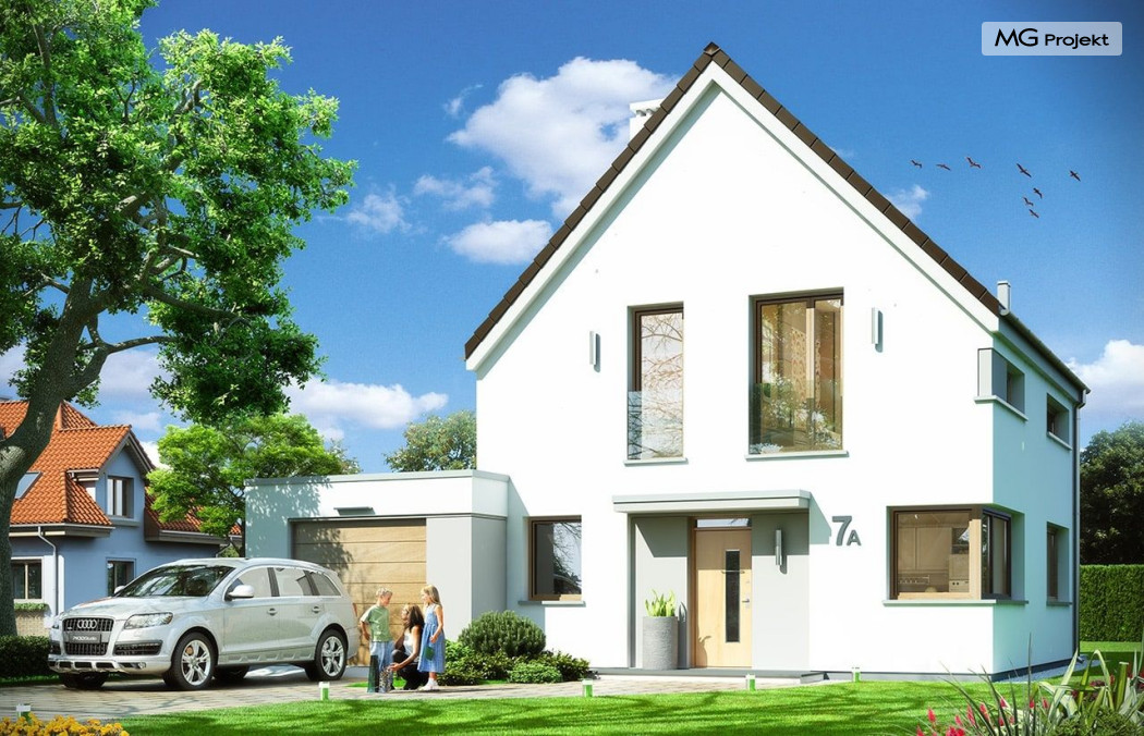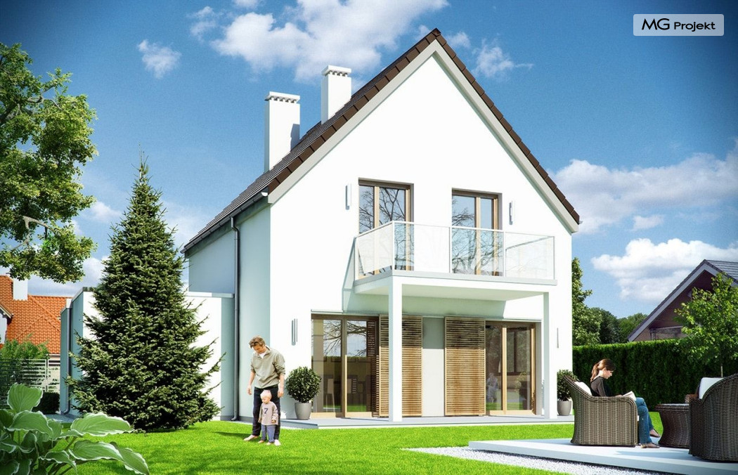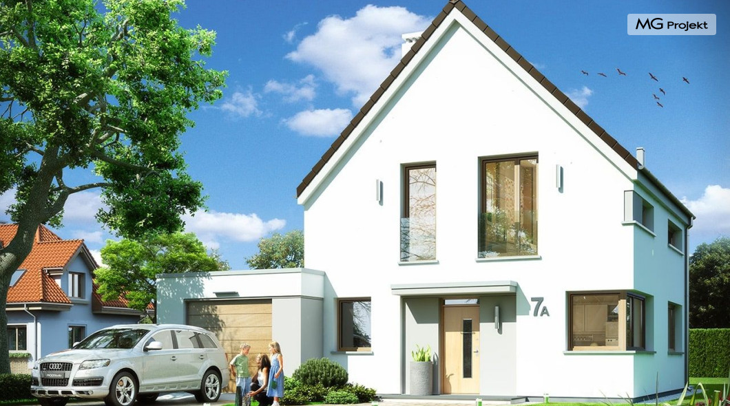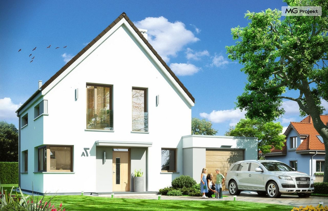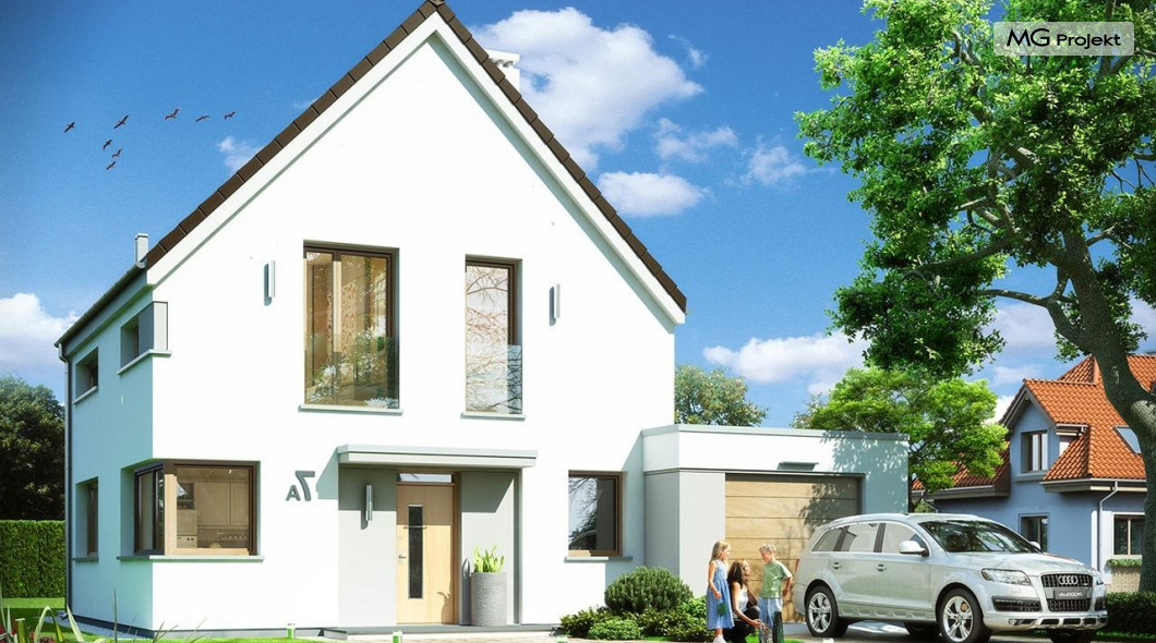 Projekt domu Oszczędny 2 to wariantowa wersja projektu – z garażem dobudowanym wdłuż bryły domu. Prosta, nowoczesna bryła domu, symetrycznie i proporcjonalnie rozłożone okna - wszystko to sprawia, że projekt Oszczędny 2 dobrze wkomponuje się w każde sąsiedztwo. Zastosowane nowoczesne materiały, ciekawa kolorystyka budynku, idą w parze z energooszczędnością i prostą konstrukcją domu, która ułatwi i zminimalizuje koszty budowy domu.