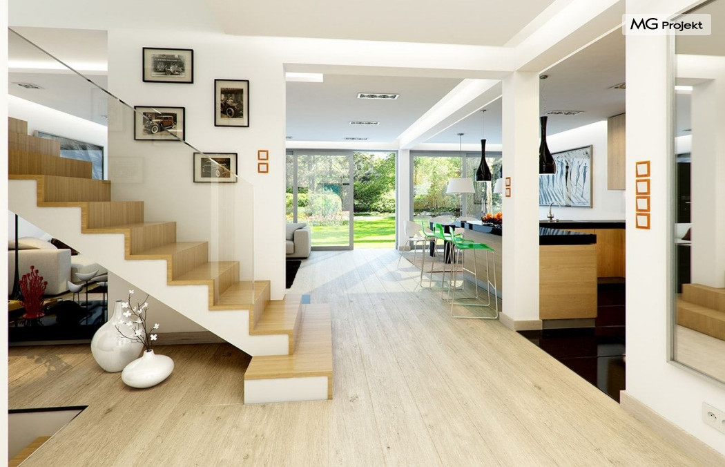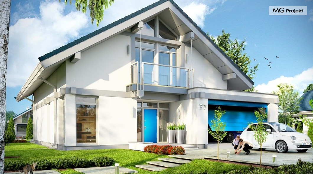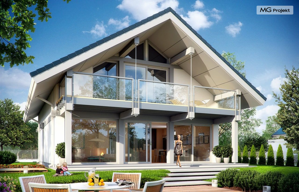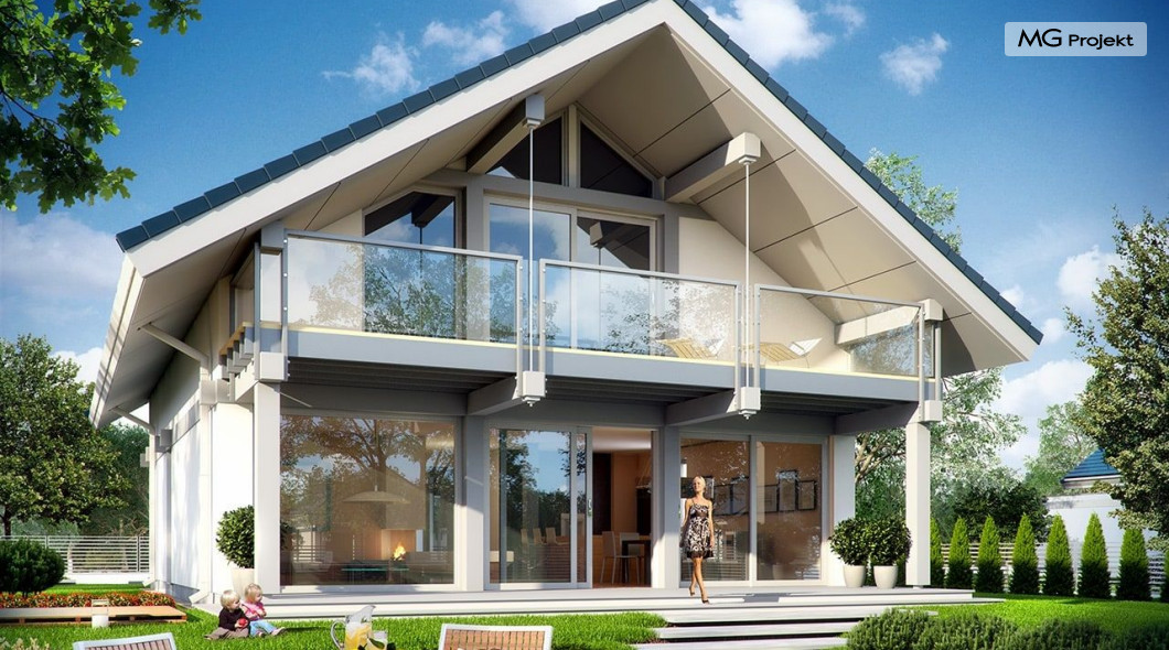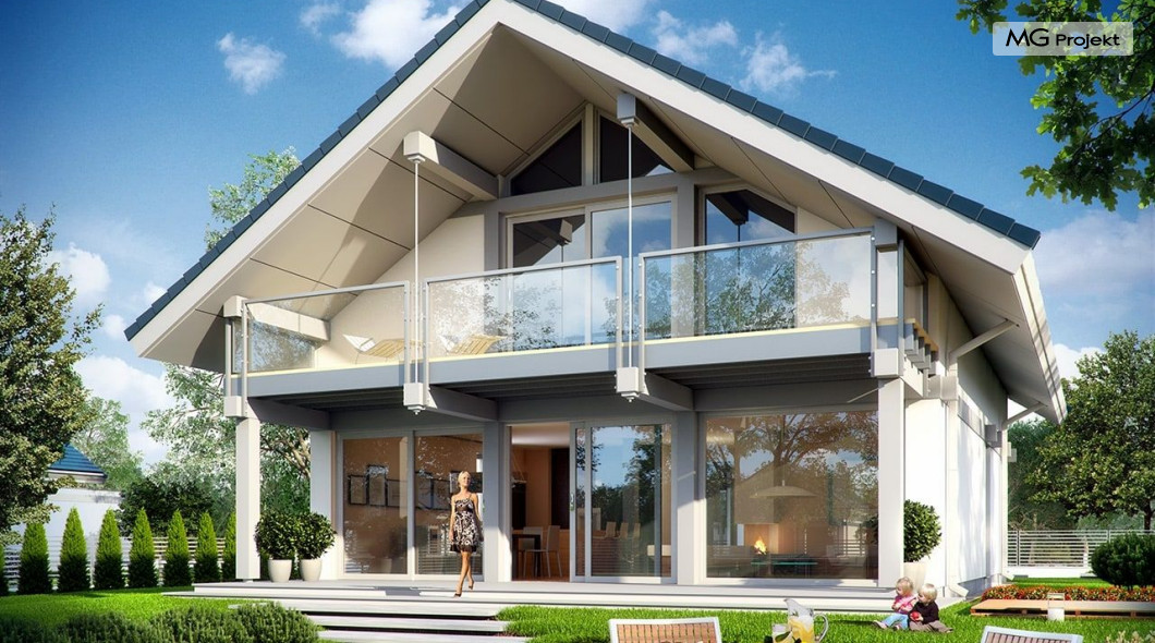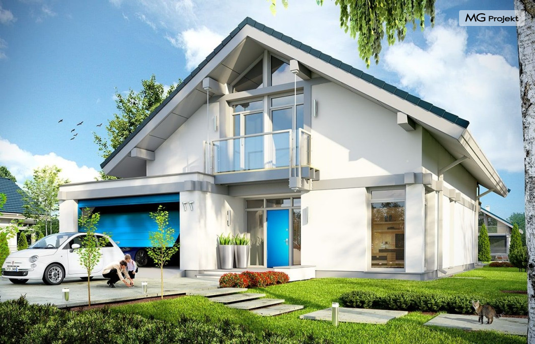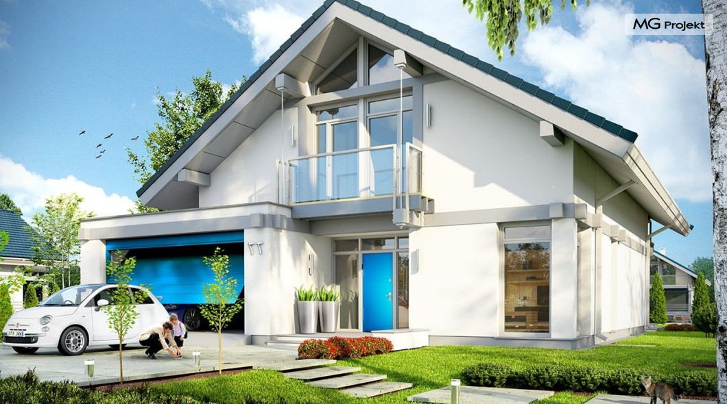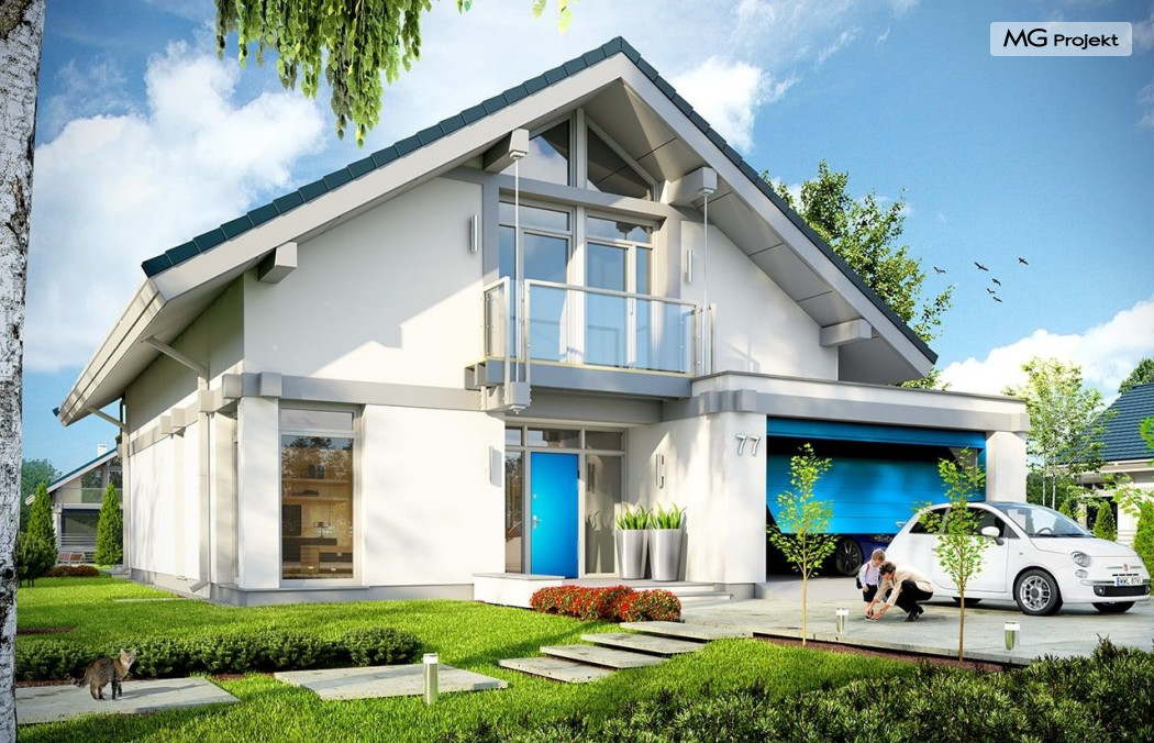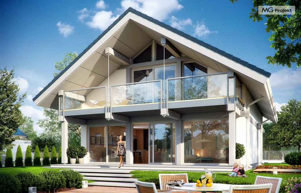Projekt domu Otwarty 2 to nowoczesny, energooszczędny dom dla cztero-sześcioosobowej rodziny - Otwarty 2 . Jest to mniejszy brat popularnego projektu Otwarty z naszej pracowni. Projekt domu Otwarty 2 to nowoczesna willa miejska, z pięknymi przeszkleniami otwierającymi wnętrze domu na otaczający ogród. Architektura budynku łączy w sobie prostotę bryły przekrytej łagodnym dwuspadowym dachem, z nowoczesnymi detalami architektonicznymi i materiałami zastosowanymi na elewacjach. W efekcie budynek jest bardzo efektowny. Prostokątną bryłę z wbudowanym garażem wieńczy symetryczny dach przekrywający poddasze użytkowe. Prosty kształt i logiczny układ konstrukcyjny budynku, pozwolą na łatwą budowę i - wbrew pozorom – niewielki koszt realizacji (biorąc pod uwagę duże przeszklenia będące wartością samą w sobie). Wnętrze Otwartego 2 podzielono na przestrzeń dzienną, z dodatkowym pokojem, garażem i kotłownią na parterze, oraz sypialnie na poddaszu. Na parterze wchodzimy do pięknego przeszklonego przedsionka, a z niego do holu z ładnymi schodami i części dziennej - połączonego salonu, jadalni i półotwartej kuchni. Przestrzeń dzienna łączy się z częściowo zadaszonym tarasem i ogrodem za pomocą szerokich przesuwnych drzwi balkonowych. Z sieni możemy przejść do dwustanowiskowego garażu, oraz przez pomieszczenie gospodarcze – do kuchni. Przy wejściu znajduje się dodatkowy pokój – gabinet, lub sypialnia. Na poddaszu mieszczą się cztery pokoje, w tym sypialnia rodziców z własną garderobą i dużym zadaszonym balkonem od strony ogrodowej , oraz bardzo ładna łazienka. Wnętrze domu jest przestronne , a poszczególne pokoje duże i kształtne. Projekt domu Otwarty 2 mimo niewielkiej powierzchni można uznać za komfortowy, wręcz luksusowy dom dla współczesnej rodziny. Projekt dostępny jest w odbiciu lustrzanym i w trzech innych wersjach: projekt bazowy (projekt domu Otwarty) mniesza wersja z garażem jednostanowiskowym (projekt domu Otwarty 3) oraz wersja ze zmienionym układem pomieszczeń na poddaszu (projekt domu Otwarty 4) oraz na węższą działkę (projekt domu Otwarty 5). Zapraszamy!