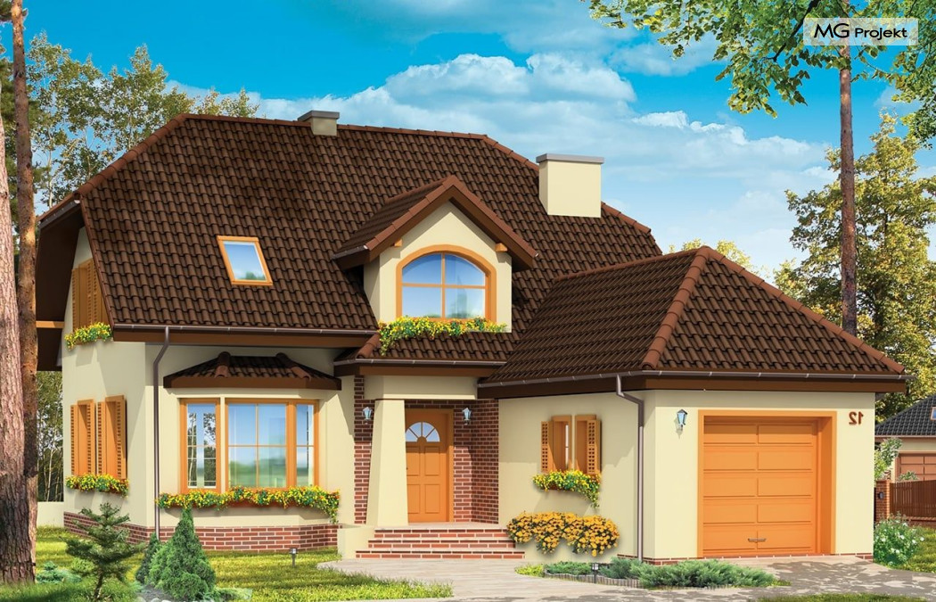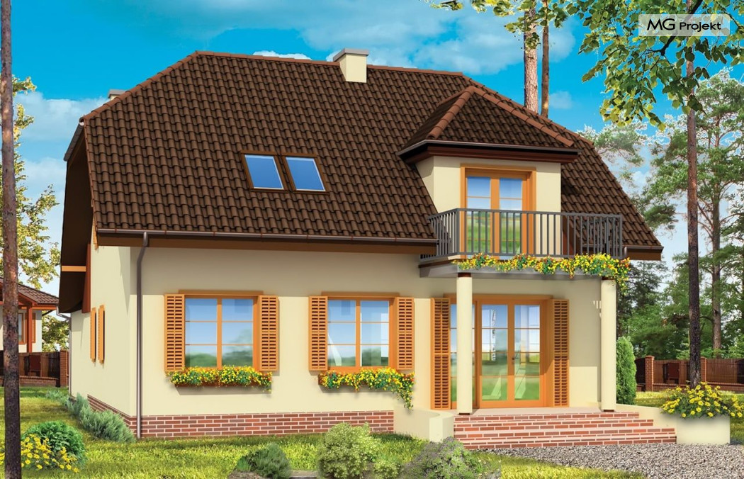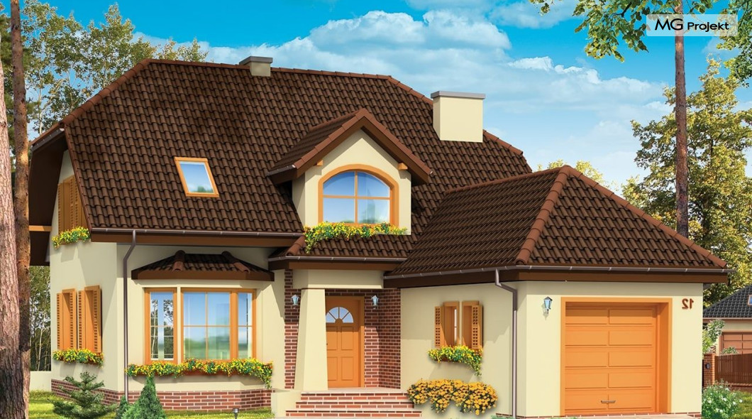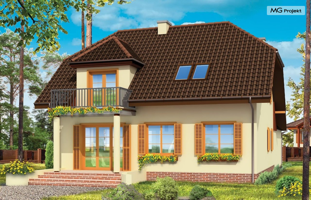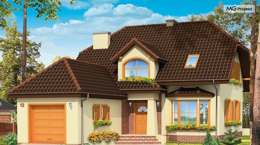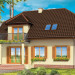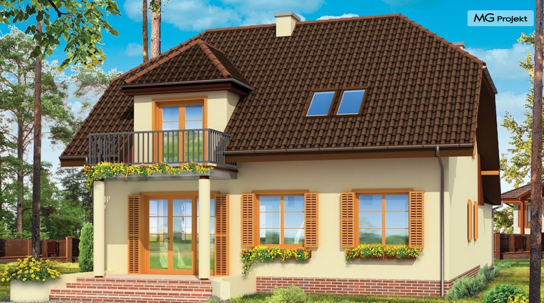 Projekt domu Pogodny 4 to kolejna odsłona projektu Pogodny. Budynek idealnie nadaje się na wąską działkę. Wnętrze zostało ukształtowane w taki sposób, aby salon był doświetlony z trzech stron. Dzięki temu dom może być posadowiony na działce z niekorzystnym nasłonecznieniem. Na parterze oprócz dużego salonu, kuchni z widokiem na ogród, obszernego holu jest dodatkowy pokój z łazienką i garaż. Na poddaszu zaprojektowano trzy sypialnie (dwie z własnymi garderobami) oraz łazienkę z garderobą (lub pralnią). Projekt domu Pogodny 4 dostępny jest także w wersji odbicia lustrzanego.