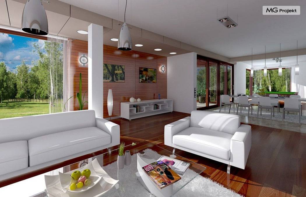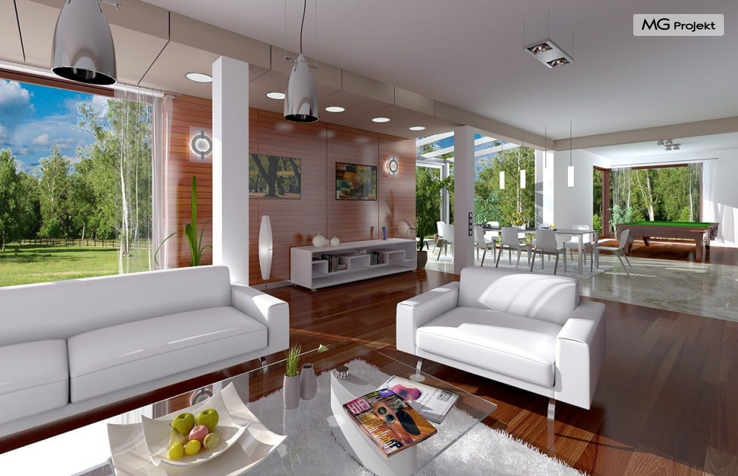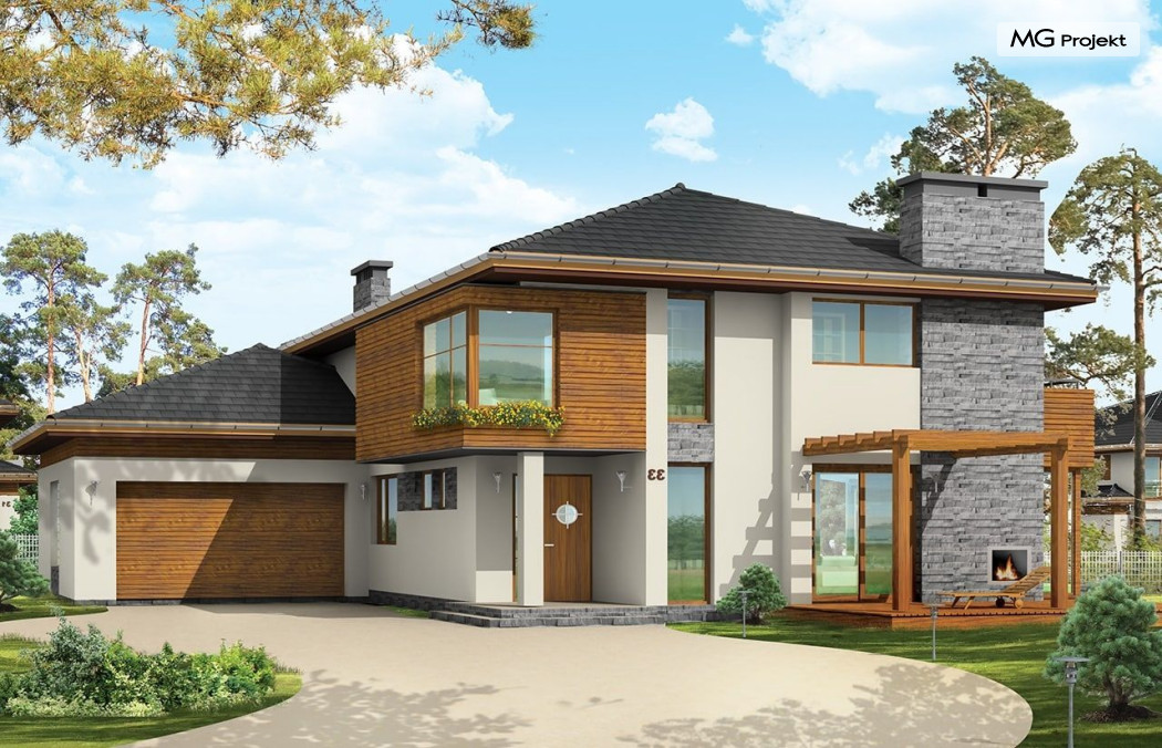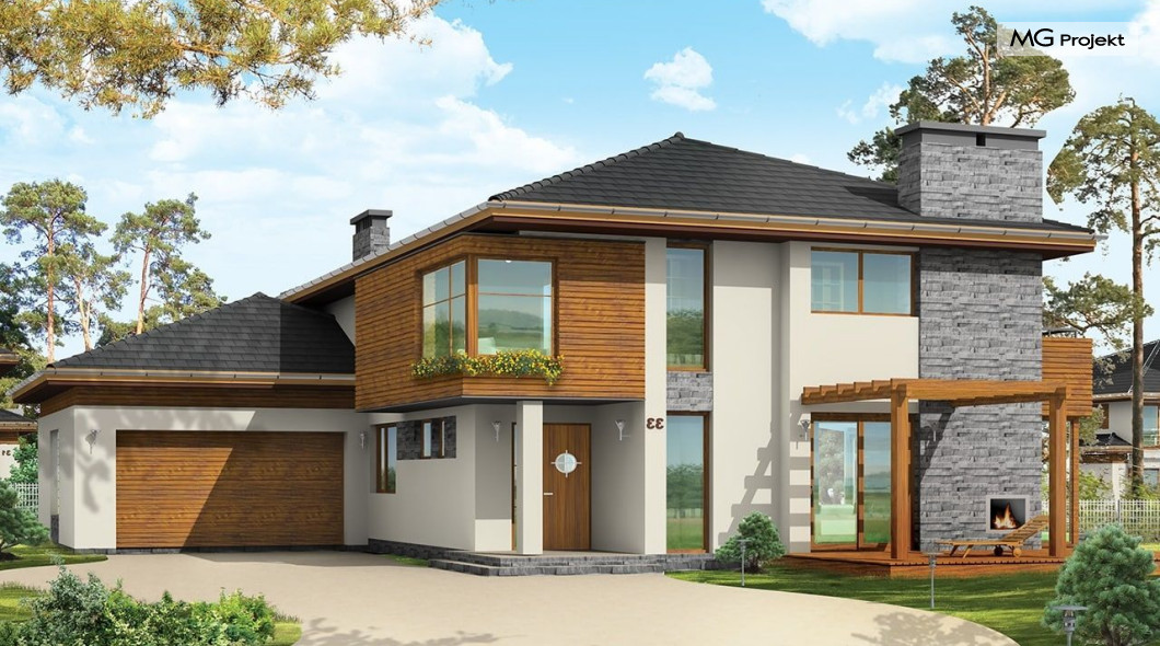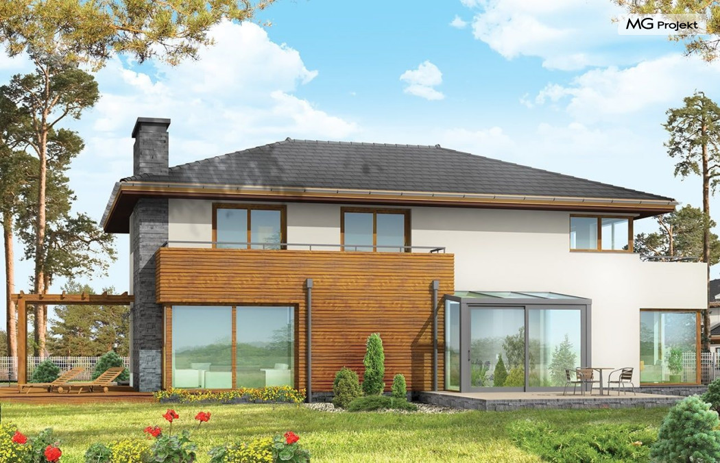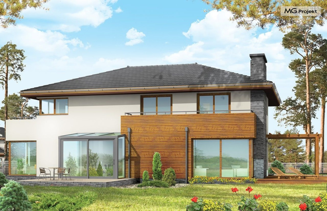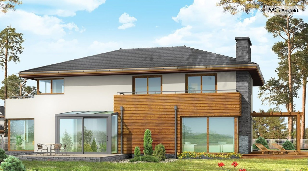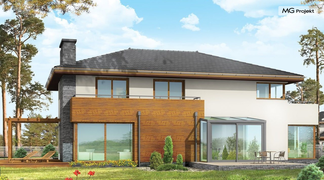 Projekt domu Południowy to komfortowy, bardzo oryginalny dom, o nowoczesnej architekturze. Zaprojektowano go z myślą o 4-5 osobowej rodzinie. Dom, dzięki otwarciu części dziennej na kilka stron świata może być adaptowany zarówno na działce z niekorzystnym wjazdem od strony południowej, jak i na działce z wjazdem od strony północnej lub bocznej (wschodniej lub zachodniej). Budynek składa się z głównej, dwukondygnacyjnej bryły oraz parterowej części garażowej. Duże przeszklenia, prostokątne wykusze, tarasy piętra - wszystkie te elementy podkreślają nowoczesność architektury domu Południowy. Prosta kubiczna bryła budynku została urozmaicona rozsądnie dobranymi detalami. Wnętrze domu na parterze to: przestrzeń dzienna łącząca salon, jadalnię z oranżerią, lub wariantowo podcienionym tarasem. Zaprojektowano tu również pomieszczenie rekreacji, które może również służyć jako biblioteka, pokój sportowy, lub ewentualnie sypialnia gościnna. Bardzo duża kuchnia z wyspą umieszczona została bliżej strefy wejściowej i garaży. Do garażu i pomieszczeń technicznych dostajemy się przez gospodarcze wejście kuchenne. Mieszczą się tam duży dwustanowiskowy garaż, pomieszczenie gospodarcze z dostępem na strych nad garażem, kotłownia-pralnia z wyjściem na ogród i spiżarnia. W projekcie domu Południowy, na piętrze zaplanowano apartament rodziców z garderobami, łazienką i własnym tarasem, dwie sypialnie dzieci z łazienką, oraz gabinet-bibliotekę z oknami widokowymi na część wejściową do domu. Pradownia dysponuje również wersją wariantową projektu domu Południowy w odbiciu lustrzanym.