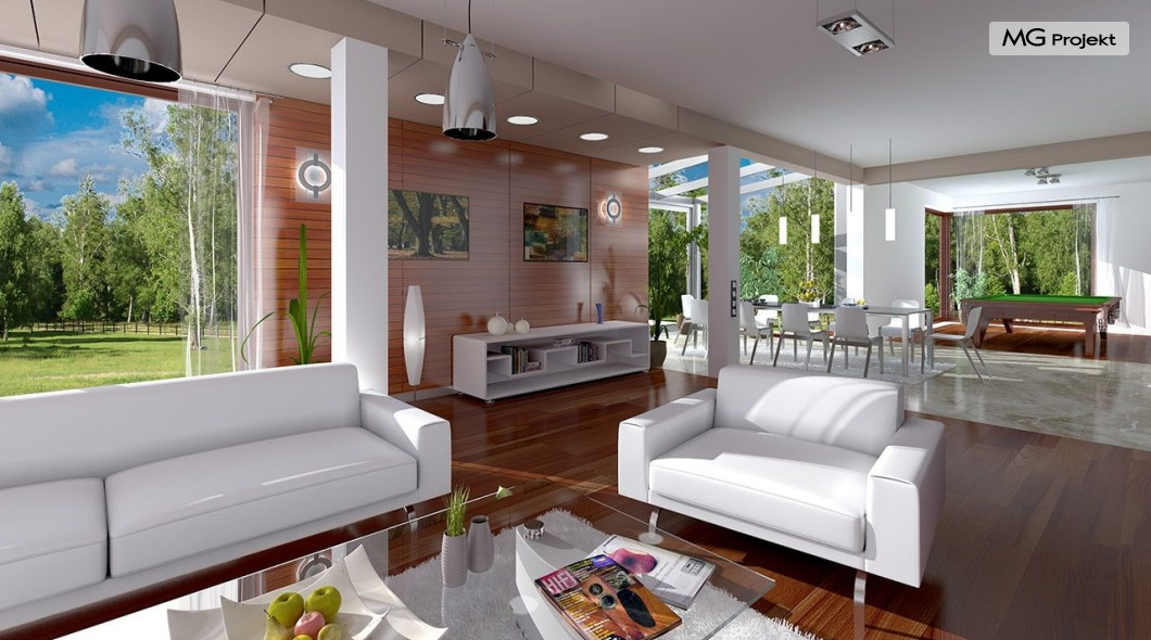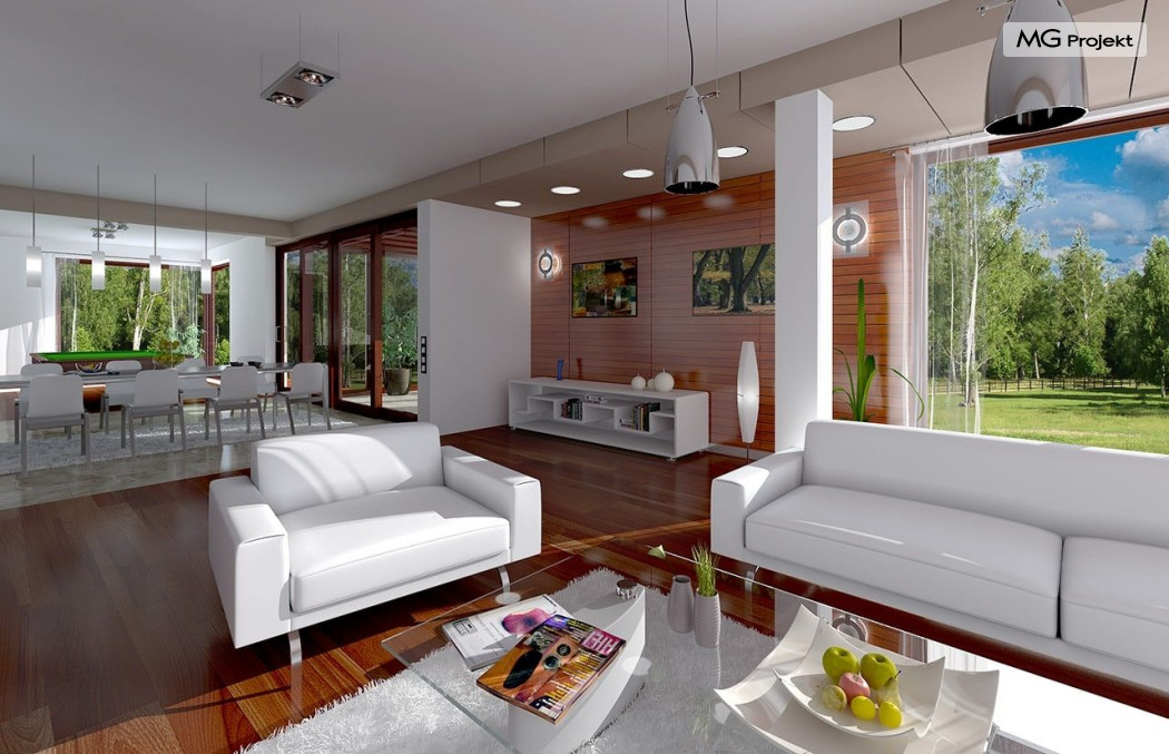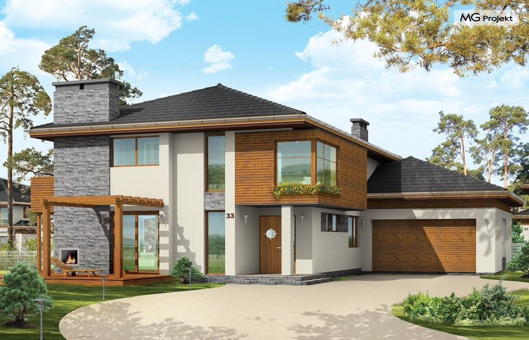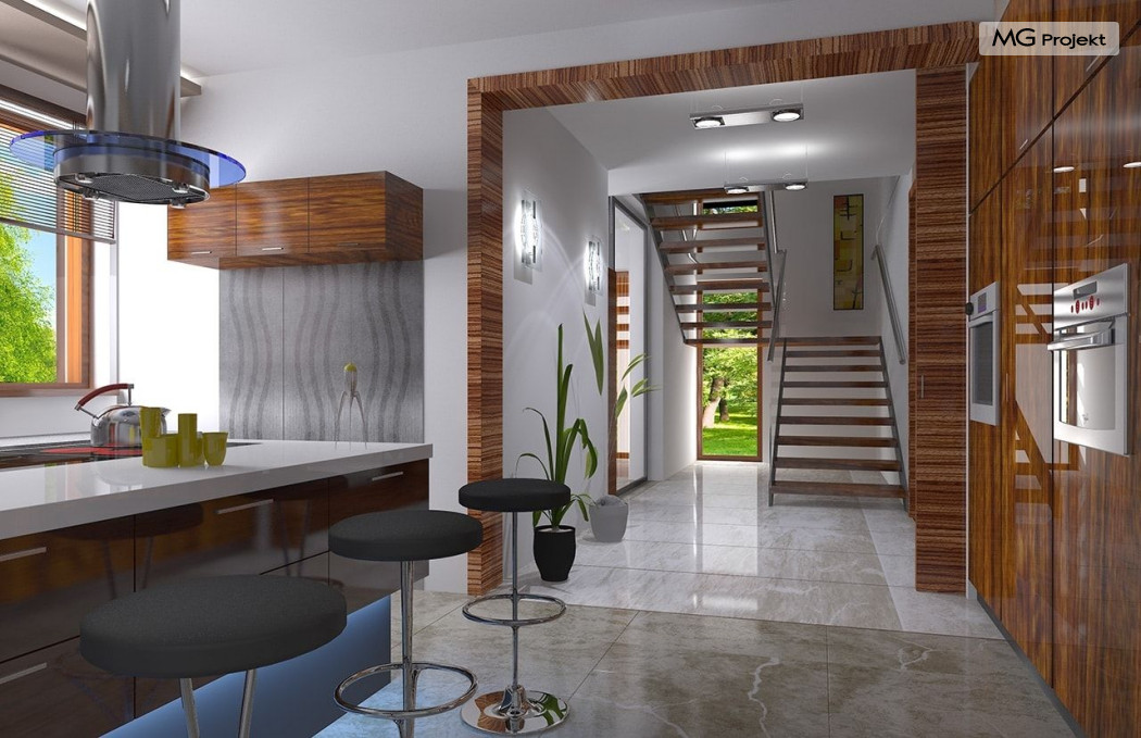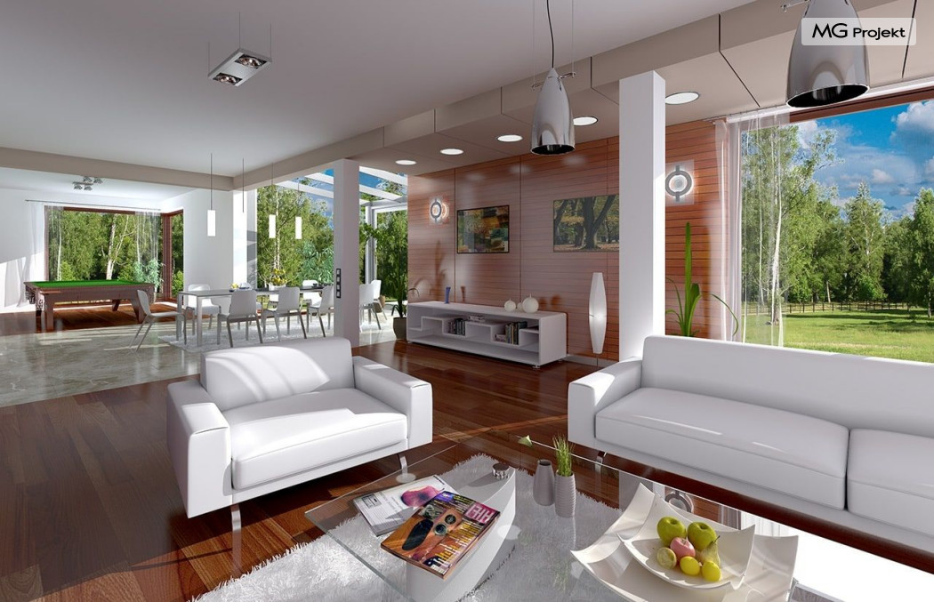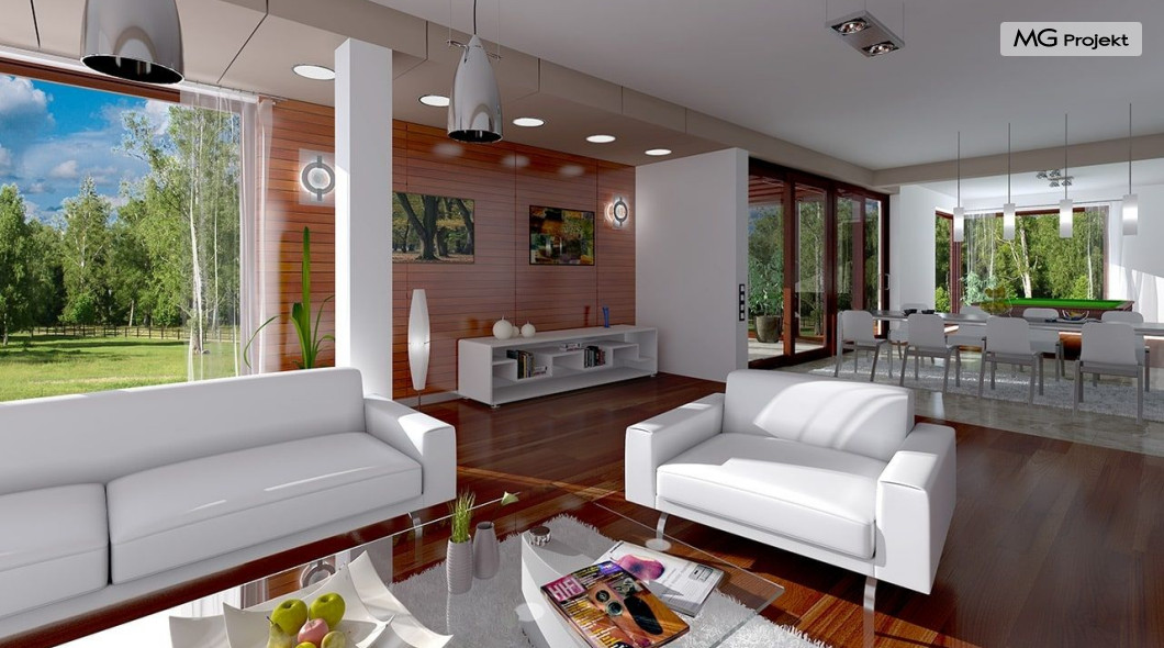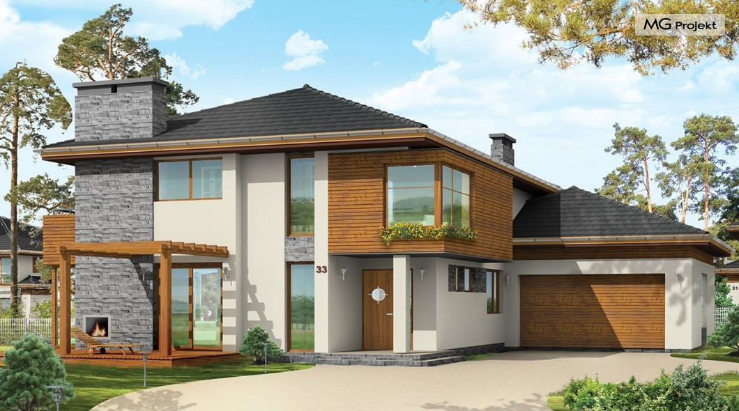 Projekt domu Południowy to komfortowy, bardzo oryginalny dom, o nowoczesnej architekturze. Zaprojektowano go z myślą o 4-5 osobowej rodzinie. Dom, dzięki otwarciu części dziennej na kilka stron świata może być adaptowany zarówno na działce z niekorzystnym wjazdem od strony południowej, jak i na działce z wjazdem od strony północnej lub bocznej (wschodniej lub zachodniej). Budynek składa się z głównej, dwukondygnacyjnej bryły oraz parterowej części garażowej. Duże przeszklenia, prostokątne wykusze, tarasy piętra - wszystkie te elementy podkreślają nowoczesność architektury domu Południowy. Prosta kubiczna bryła budynku została urozmaicona rozsądnie dobranymi detalami. Wnętrze domu na parterze to: przestrzeń dzienna łącząca salon, jadalnię z oranżerią, lub wariantowo podcienionym tarasem. Zaprojektowano tu również pomieszczenie rekreacji, które może również służyć jako biblioteka, pokój sportowy, lub ewentualnie sypialnia gościnna. Bardzo duża kuchnia z wyspą umieszczona została bliżej strefy wejściowej i garaży. Do garażu i pomieszczeń technicznych dostajemy się przez gospodarcze wejście kuchenne. Mieszczą się tam duży dwustanowiskowy garaż, pomieszczenie gospodarcze z dostępem na strych nad garażem, kotłownia-pralnia z wyjściem na ogród i spiżarnia. W projekcie domu Południowy, na piętrze zaplanowano apartament rodziców z garderobami, łazienką i własnym tarasem, dwie sypialnie dzieci z łazienką, oraz gabinet-bibliotekę z oknami widokowymi na część wejściową do domu. Pradownia dysponuje również wersją wariantową projektu domu Południowy w odbiciu lustrzanym.