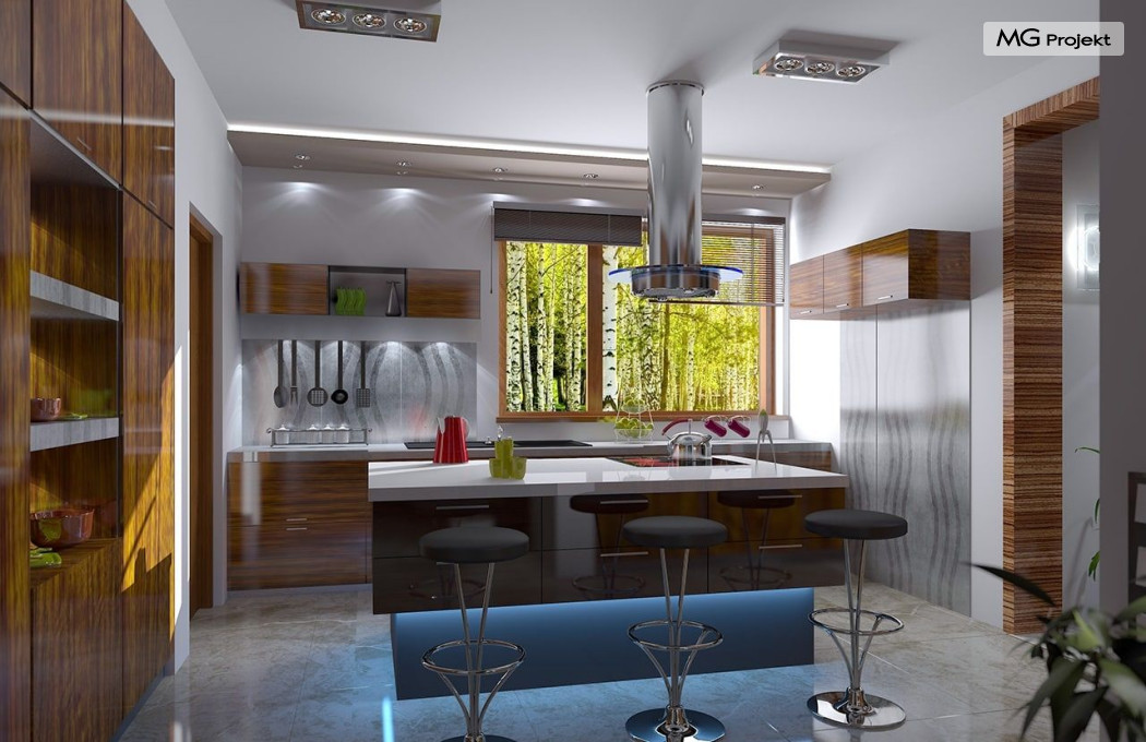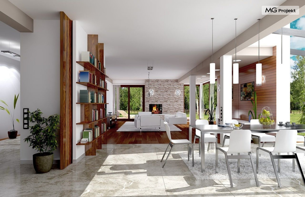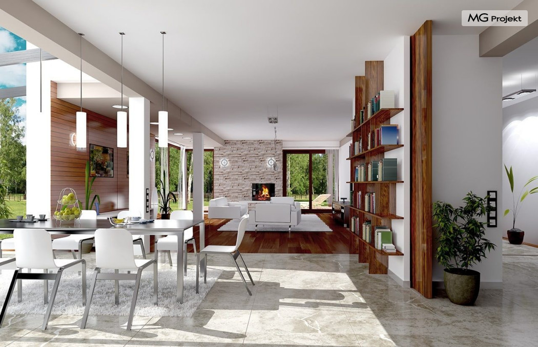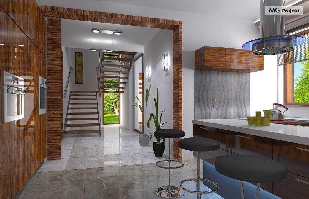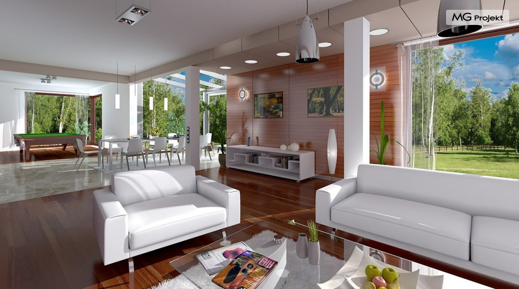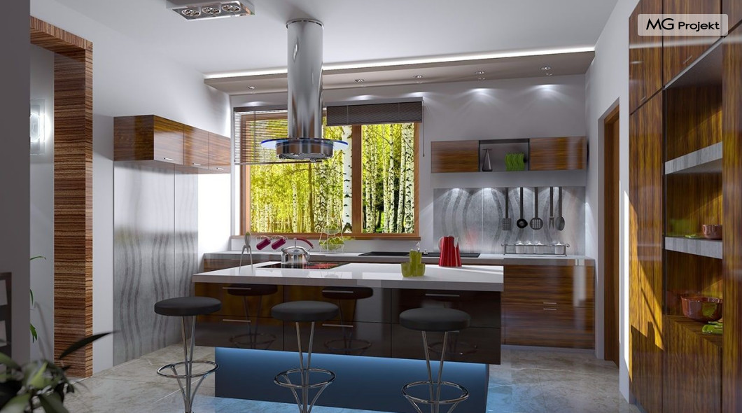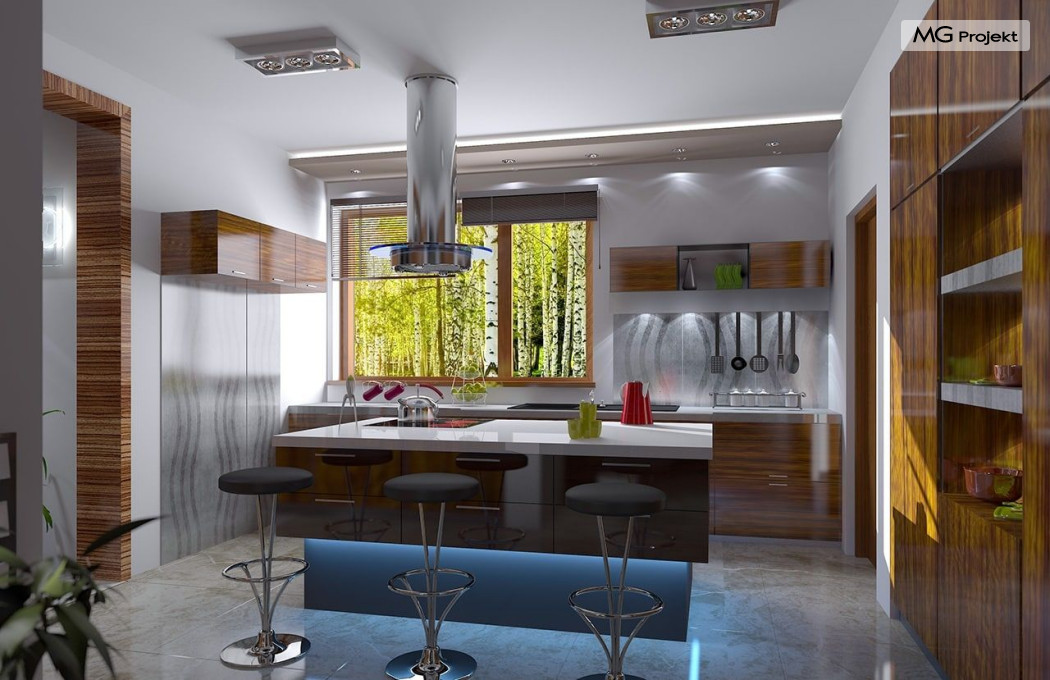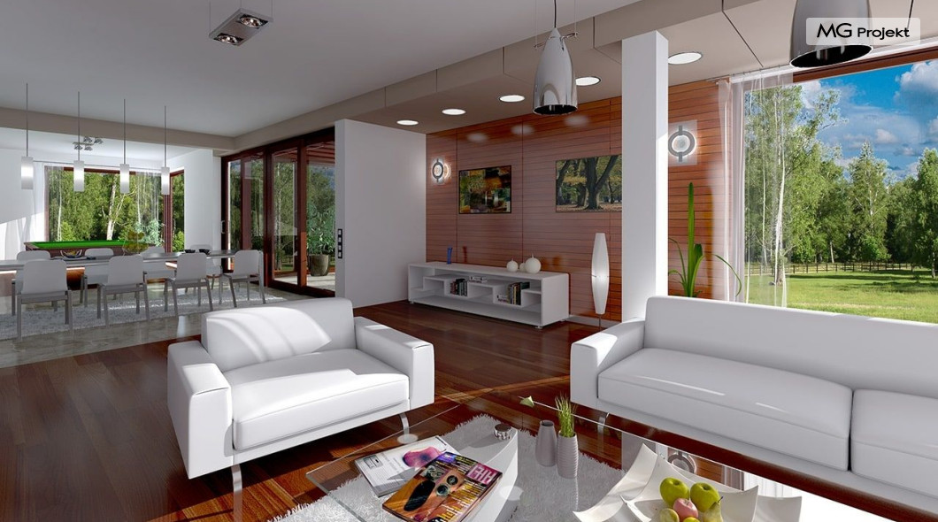 Projekt domu Południowy to komfortowy, bardzo oryginalny dom, o nowoczesnej architekturze. Zaprojektowano go z myślą o 4-5 osobowej rodzinie. Dom, dzięki otwarciu części dziennej na kilka stron świata może być adaptowany zarówno na działce z niekorzystnym wjazdem od strony południowej, jak i na działce z wjazdem od strony północnej lub bocznej (wschodniej lub zachodniej). Budynek składa się z głównej, dwukondygnacyjnej bryły oraz parterowej części garażowej. Duże przeszklenia, prostokątne wykusze, tarasy piętra - wszystkie te elementy podkreślają nowoczesność architektury domu Południowy. Prosta kubiczna bryła budynku została urozmaicona rozsądnie dobranymi detalami. Wnętrze domu na parterze to: przestrzeń dzienna łącząca salon, jadalnię z oranżerią, lub wariantowo podcienionym tarasem. Zaprojektowano tu również pomieszczenie rekreacji, które może również służyć jako biblioteka, pokój sportowy, lub ewentualnie sypialnia gościnna. Bardzo duża kuchnia z wyspą umieszczona została bliżej strefy wejściowej i garaży. Do garażu i pomieszczeń technicznych dostajemy się przez gospodarcze wejście kuchenne. Mieszczą się tam duży dwustanowiskowy garaż, pomieszczenie gospodarcze z dostępem na strych nad garażem, kotłownia-pralnia z wyjściem na ogród i spiżarnia. W projekcie domu Południowy, na piętrze zaplanowano apartament rodziców z garderobami, łazienką i własnym tarasem, dwie sypialnie dzieci z łazienką, oraz gabinet-bibliotekę z oknami widokowymi na część wejściową do domu. Pradownia dysponuje również wersją wariantową projektu domu Południowy w odbiciu lustrzanym.