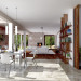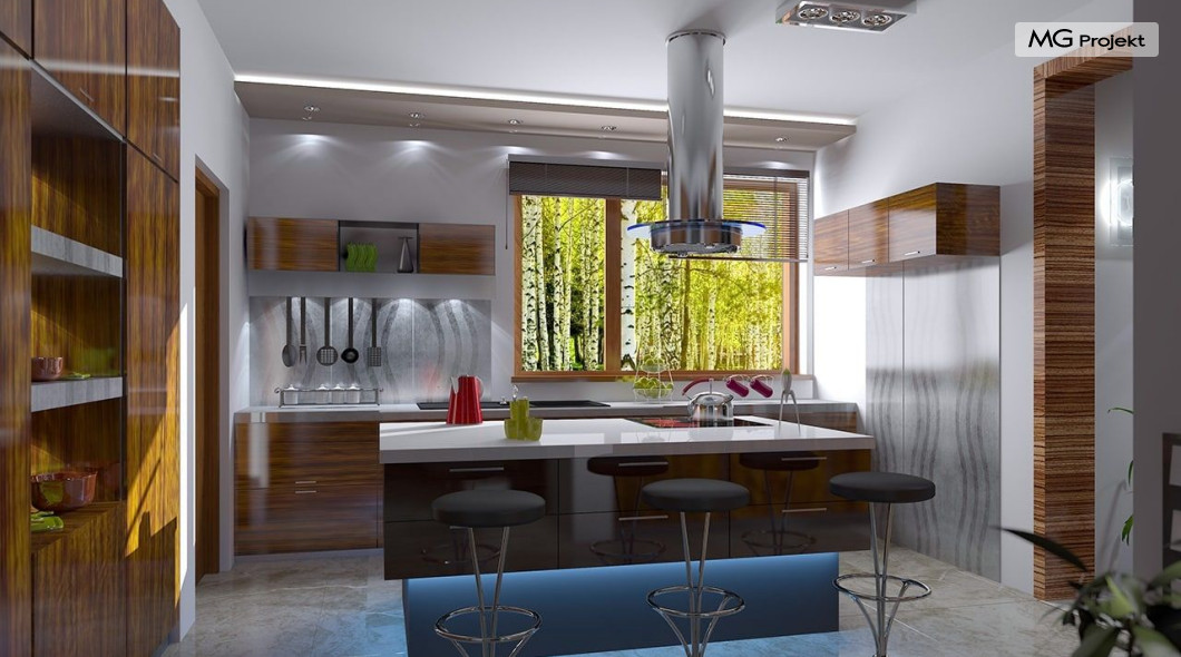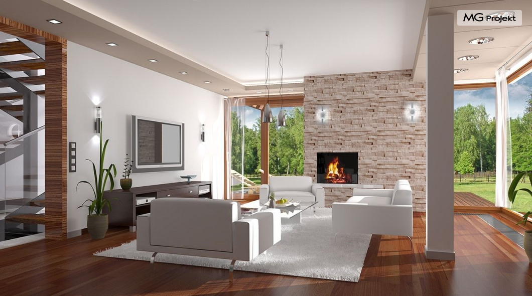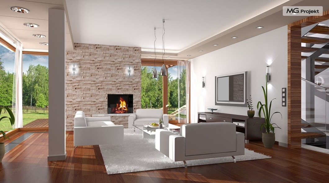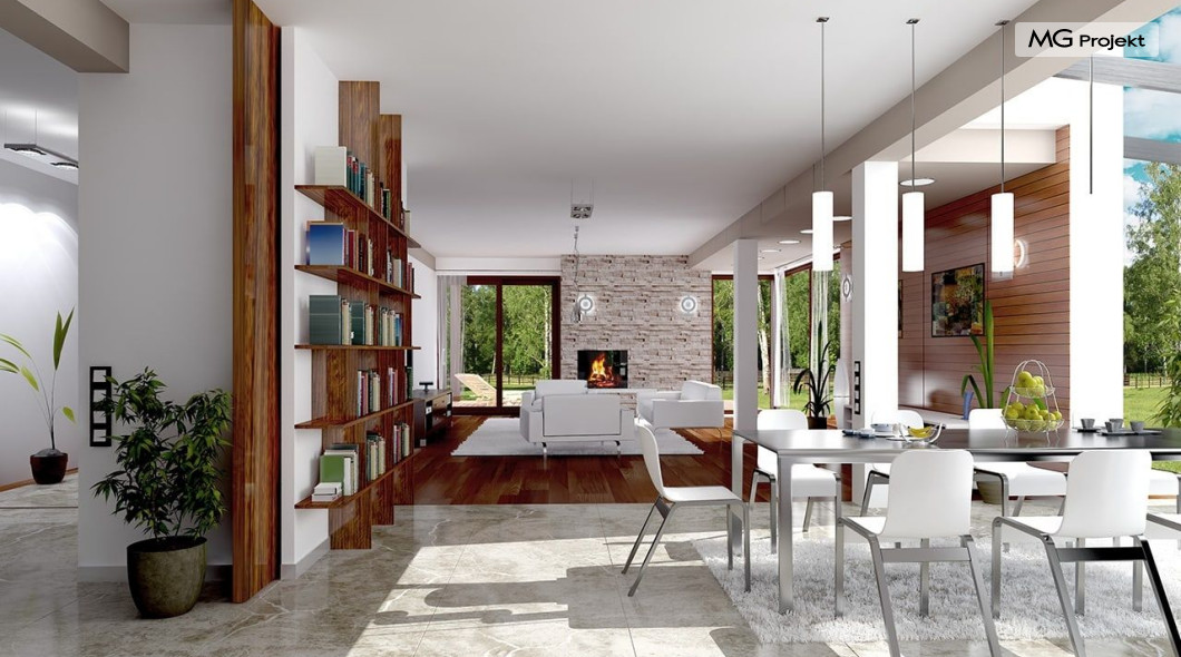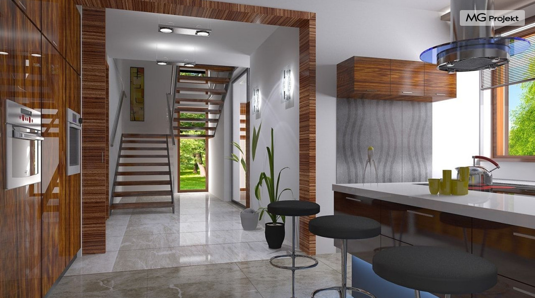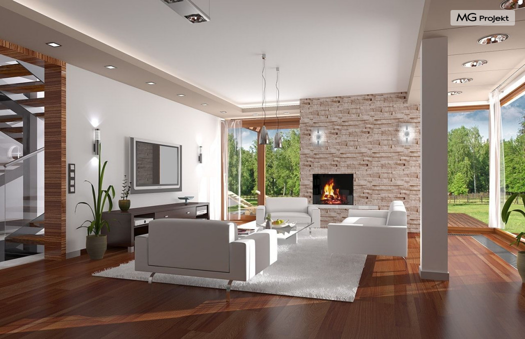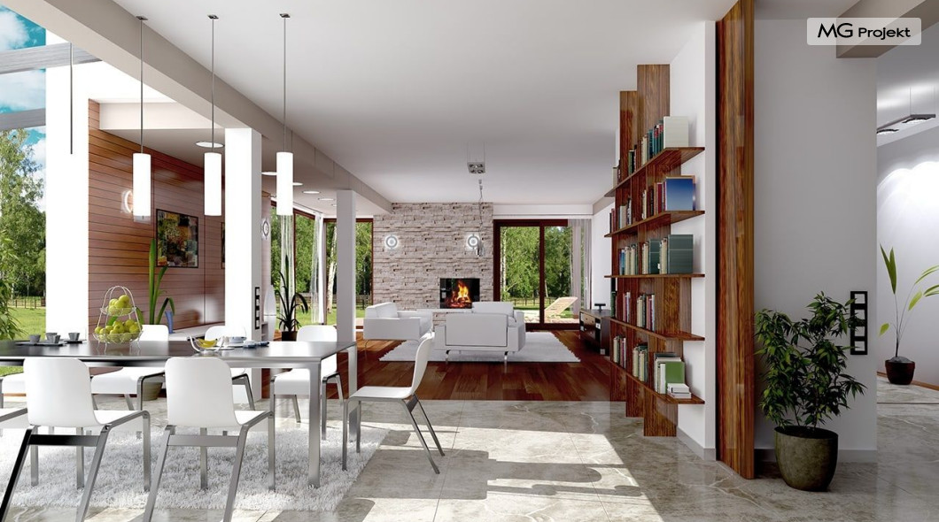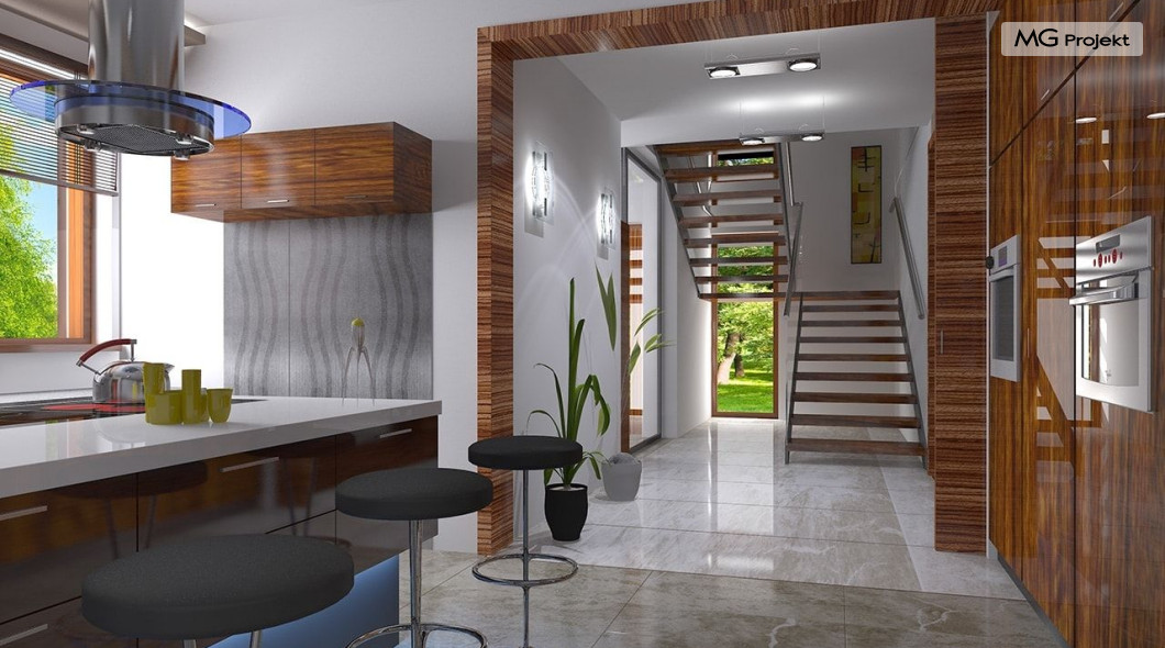 Projekt domu Południowy to komfortowy, bardzo oryginalny dom, o nowoczesnej architekturze. Zaprojektowano go z myślą o 4-5 osobowej rodzinie. Dom, dzięki otwarciu części dziennej na kilka stron świata może być adaptowany zarówno na działce z niekorzystnym wjazdem od strony południowej, jak i na działce z wjazdem od strony północnej lub bocznej (wschodniej lub zachodniej). Budynek składa się z głównej, dwukondygnacyjnej bryły oraz parterowej części garażowej. Duże przeszklenia, prostokątne wykusze, tarasy piętra - wszystkie te elementy podkreślają nowoczesność architektury domu Południowy. Prosta kubiczna bryła budynku została urozmaicona rozsądnie dobranymi detalami. Wnętrze domu na parterze to: przestrzeń dzienna łącząca salon, jadalnię z oranżerią, lub wariantowo podcienionym tarasem. Zaprojektowano tu również pomieszczenie rekreacji, które może również służyć jako biblioteka, pokój sportowy, lub ewentualnie sypialnia gościnna. Bardzo duża kuchnia z wyspą umieszczona została bliżej strefy wejściowej i garaży. Do garażu i pomieszczeń technicznych dostajemy się przez gospodarcze wejście kuchenne. Mieszczą się tam duży dwustanowiskowy garaż, pomieszczenie gospodarcze z dostępem na strych nad garażem, kotłownia-pralnia z wyjściem na ogród i spiżarnia. W projekcie domu Południowy, na piętrze zaplanowano apartament rodziców z garderobami, łazienką i własnym tarasem, dwie sypialnie dzieci z łazienką, oraz gabinet-bibliotekę z oknami widokowymi na część wejściową do domu. Pradownia dysponuje również wersją wariantową projektu domu Południowy w odbiciu lustrzanym.