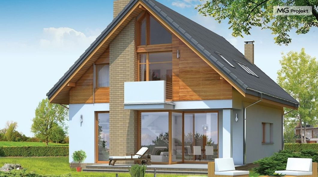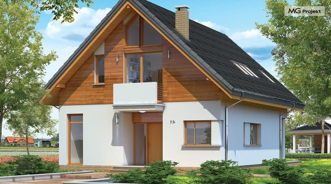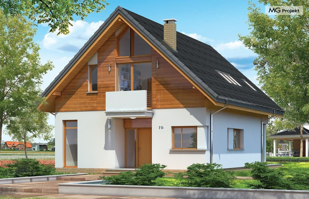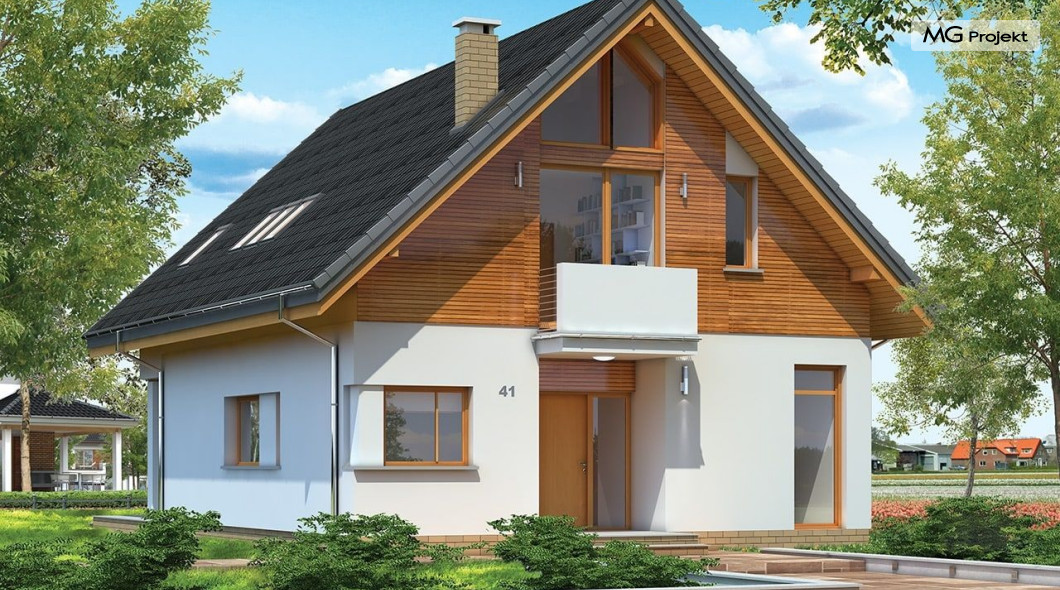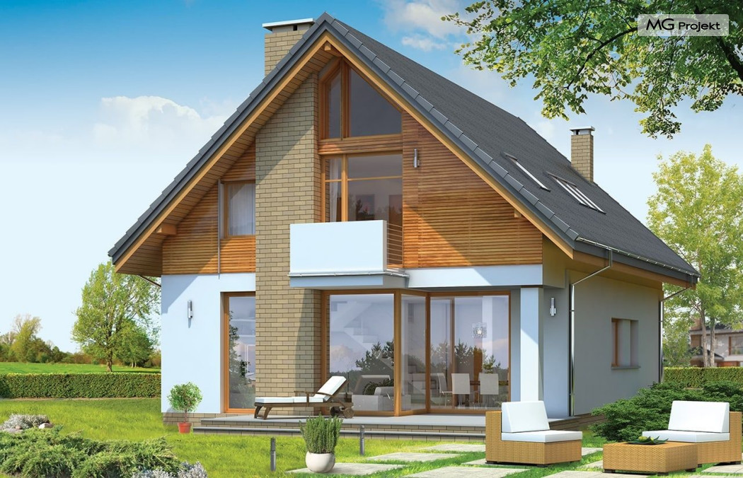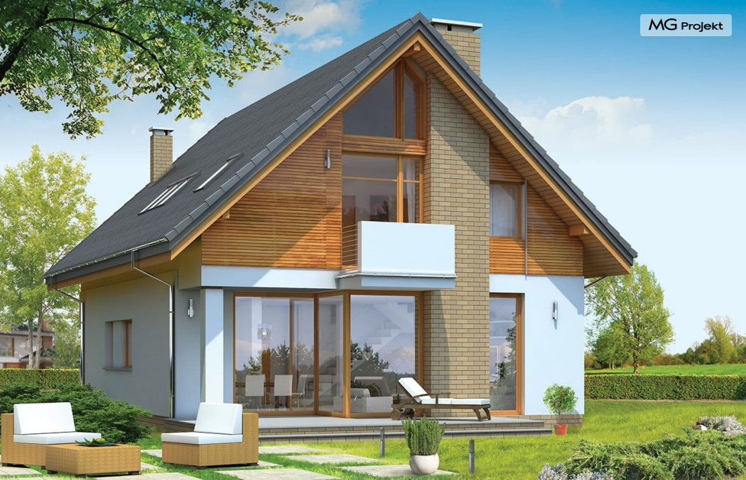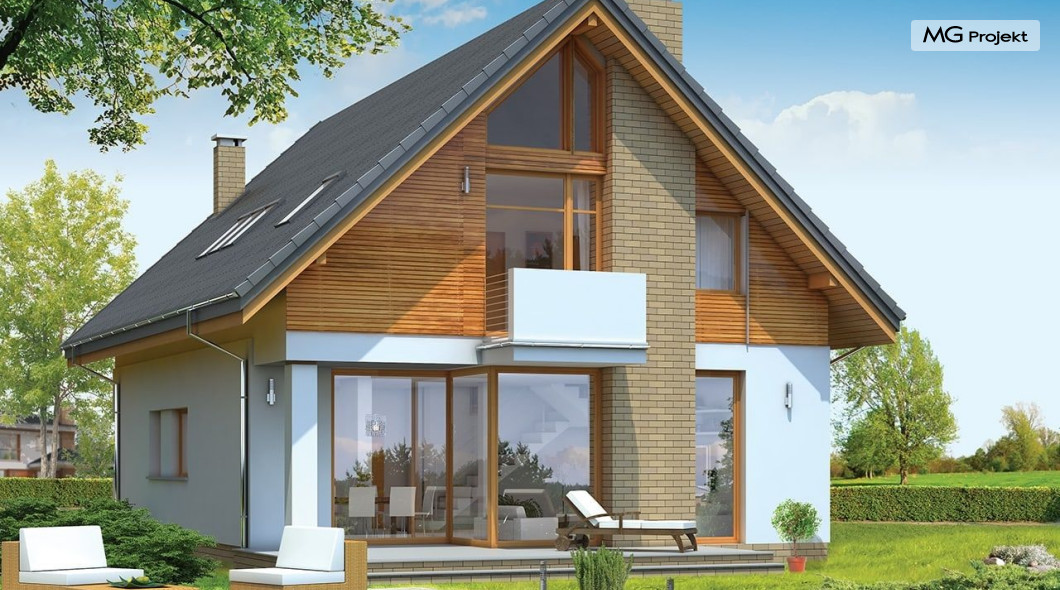 Projekt domu Prosty to dom jednorodzinny dla rodziny cztero-sześcioosobowej, przykryty dwuspadowym dachem. Dom jest podmiejską willą o nowoczesnej ale spokojnej architekturze. Zwarta bryła budynku z dużym zadaszonym podcieniem z tyłu domu, została ciekawie ozdobiona klinkierowymi i drewnianymi okładzinami elewacji, oraz loggiami i podcieniem wejściowym. Masywny ozdobny komin kominka wewnętrznego, czy narożne okna - to dodatkowe ozdoby bryły. Wszystkie elementy tworzą spójną, spokojną kompozycyjnie projektu domu. W projekcie domu Prosty, na parterze znajduje się duży salon z jadalnią i holem, z częściowo otwartą kuchnią, oraz dodatkowy pokój - gabinet lub sypialnią gościnna. Na poddaszu zaprojektowano sypialnie, z odrębnym apartamentem rodziców, z własną łazienką, garderobą i balkonem z widokiem na ogród. Na parterze przez szerokie przeszklenia z salonu zaplanowano wyjście do dużego podcienia i na taras ogrodowy. Pracownia posiada wersję odbicia lustrzanego projektu Prosty.