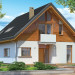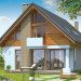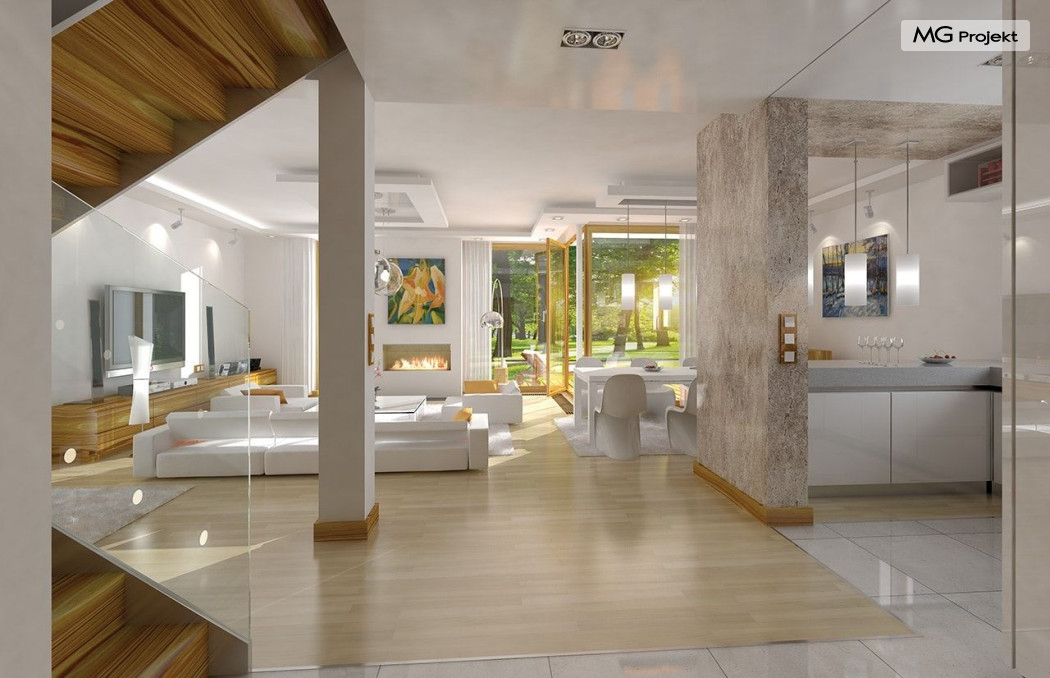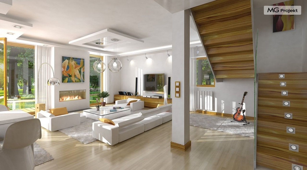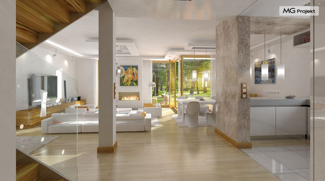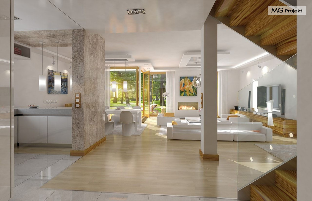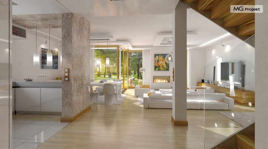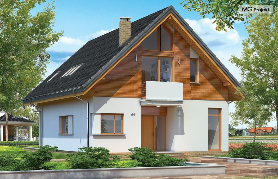 Projekt domu Prosty to dom jednorodzinny dla rodziny cztero-sześcioosobowej, przykryty dwuspadowym dachem. Dom jest podmiejską willą o nowoczesnej ale spokojnej architekturze. Zwarta bryła budynku z dużym zadaszonym podcieniem z tyłu domu, została ciekawie ozdobiona klinkierowymi i drewnianymi okładzinami elewacji, oraz loggiami i podcieniem wejściowym. Masywny ozdobny komin kominka wewnętrznego, czy narożne okna - to dodatkowe ozdoby bryły. Wszystkie elementy tworzą spójną, spokojną kompozycyjnie projektu domu. W projekcie domu Prosty, na parterze znajduje się duży salon z jadalnią i holem, z częściowo otwartą kuchnią, oraz dodatkowy pokój - gabinet lub sypialnią gościnna. Na poddaszu zaprojektowano sypialnie, z odrębnym apartamentem rodziców, z własną łazienką, garderobą i balkonem z widokiem na ogród. Na parterze przez szerokie przeszklenia z salonu zaplanowano wyjście do dużego podcienia i na taras ogrodowy. Pracownia posiada wersję odbicia lustrzanego projektu Prosty.