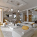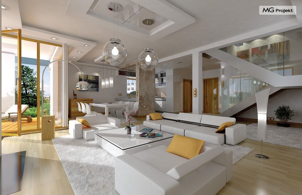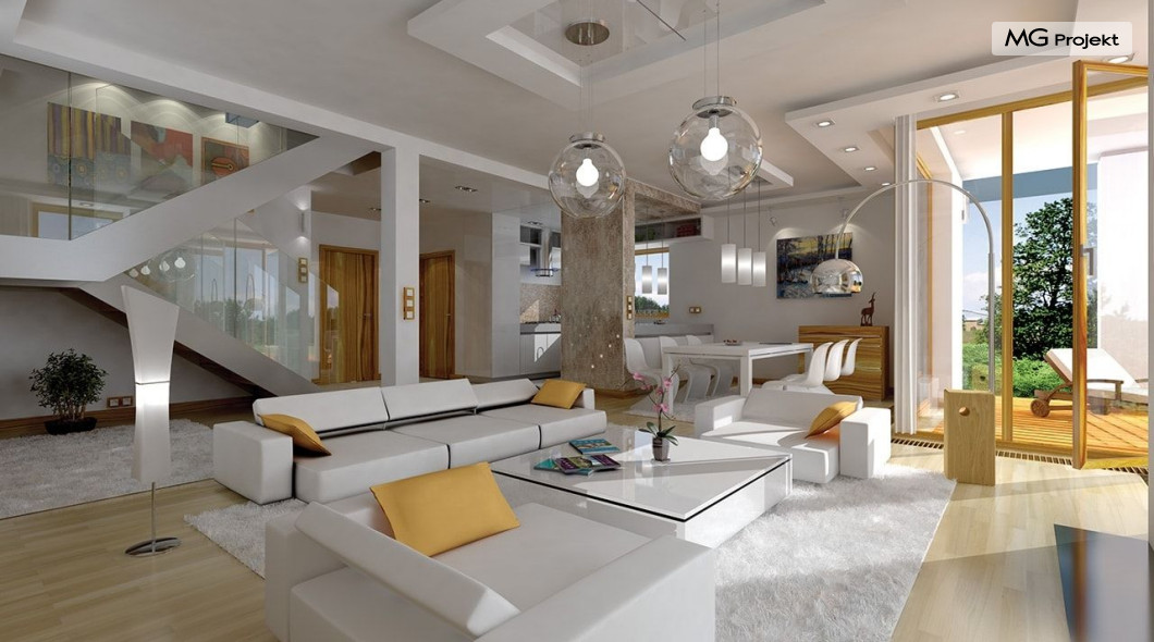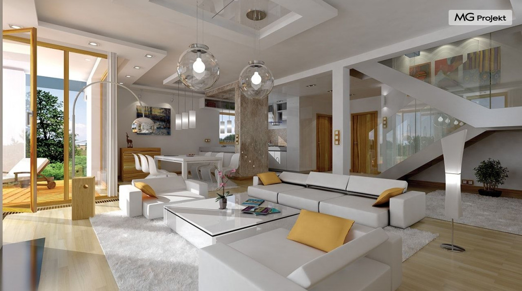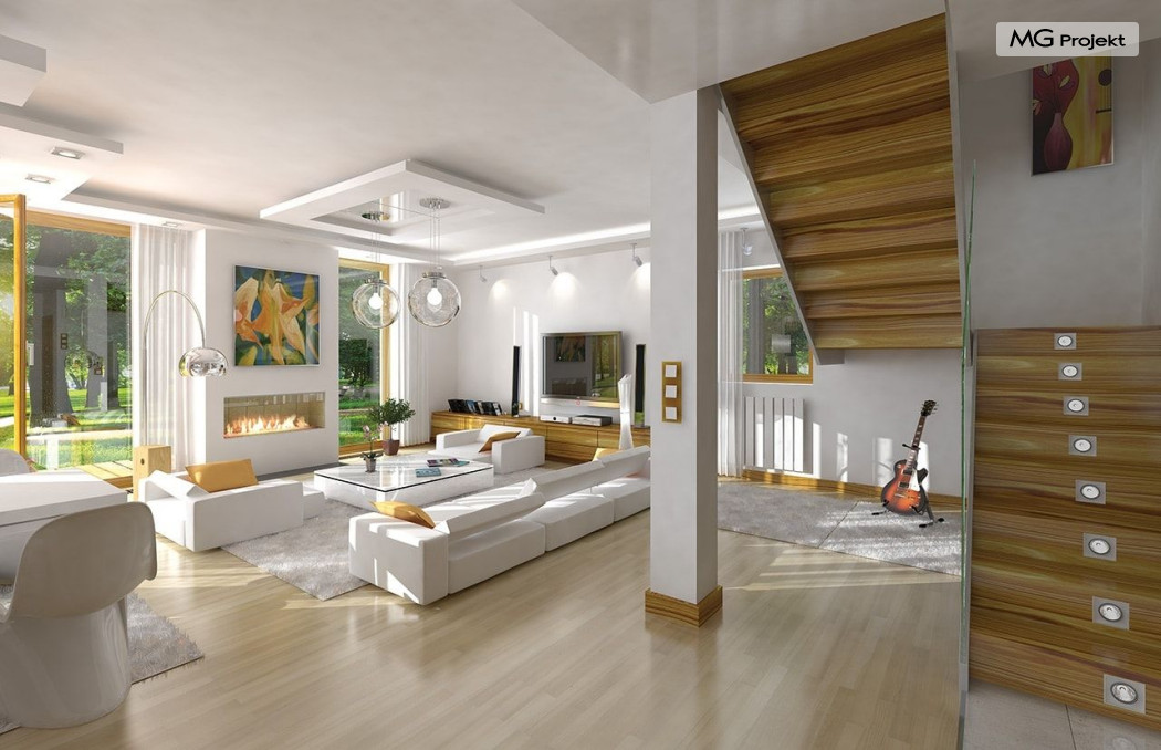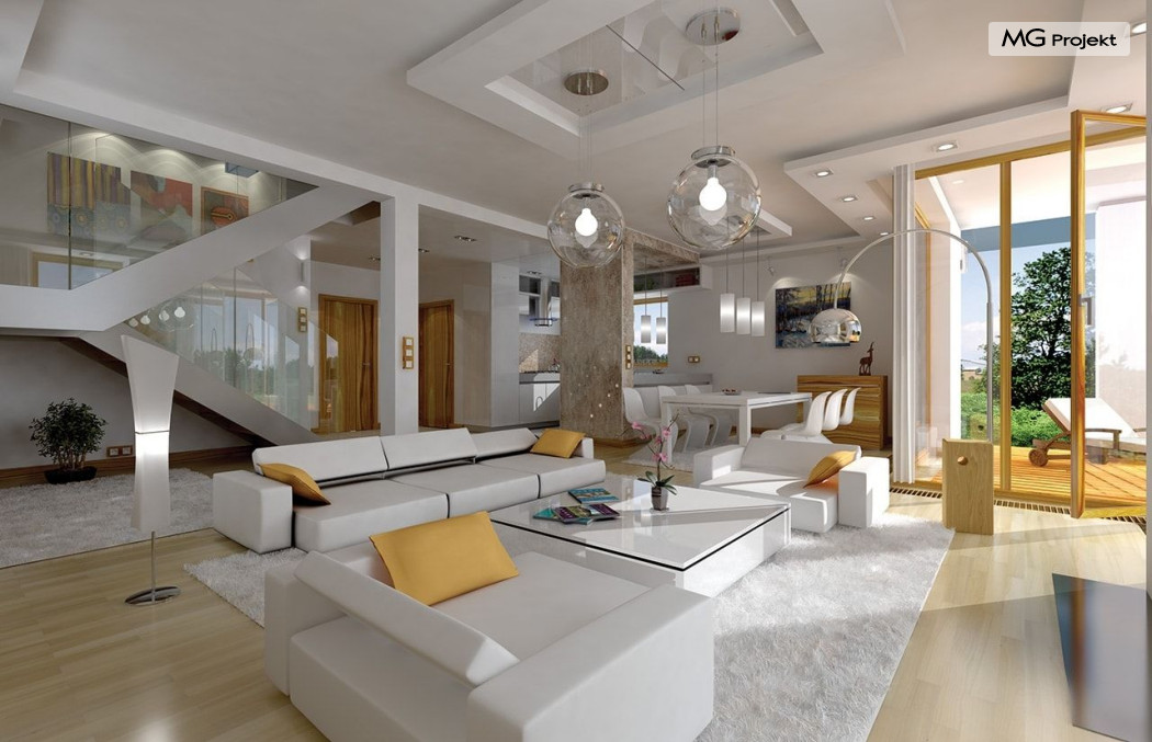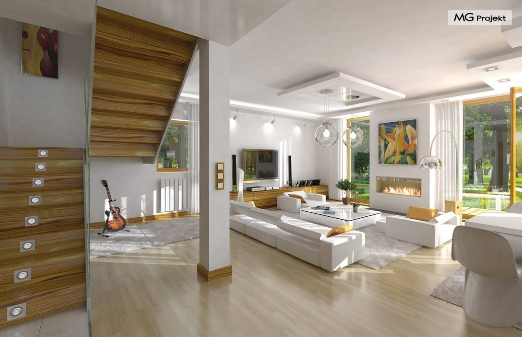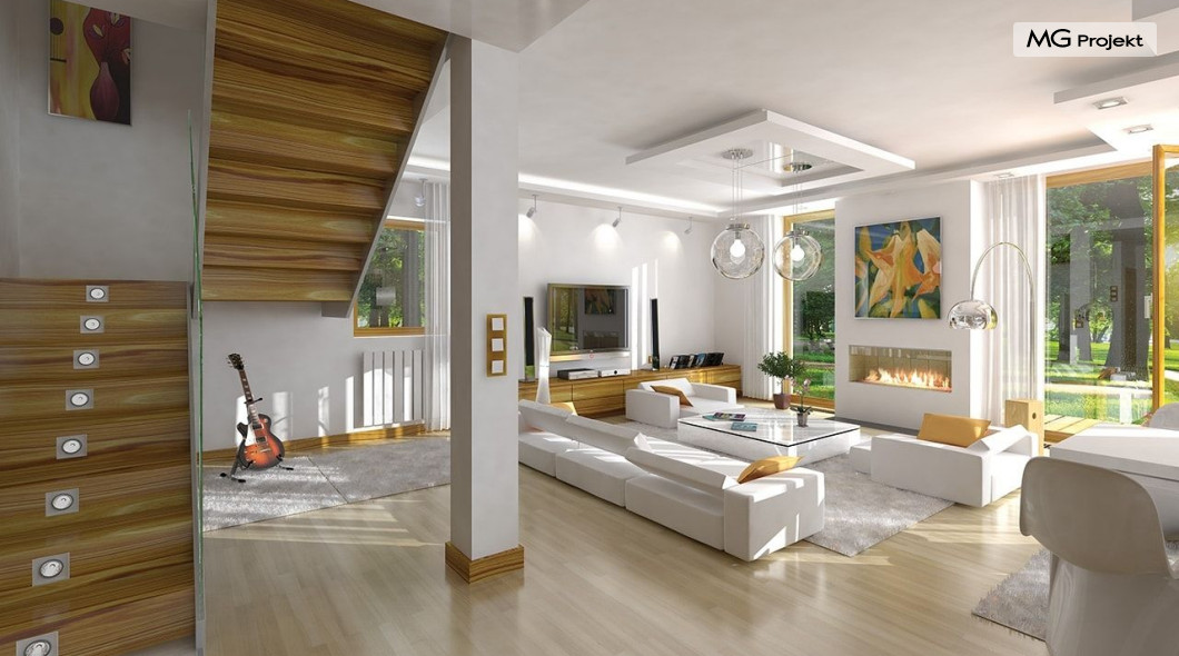 Projekt domu Prosty to dom jednorodzinny dla rodziny cztero-sześcioosobowej, przykryty dwuspadowym dachem. Dom jest podmiejską willą o nowoczesnej ale spokojnej architekturze. Zwarta bryła budynku z dużym zadaszonym podcieniem z tyłu domu, została ciekawie ozdobiona klinkierowymi i drewnianymi okładzinami elewacji, oraz loggiami i podcieniem wejściowym. Masywny ozdobny komin kominka wewnętrznego, czy narożne okna - to dodatkowe ozdoby bryły. Wszystkie elementy tworzą spójną, spokojną kompozycyjnie projektu domu. W projekcie domu Prosty, na parterze znajduje się duży salon z jadalnią i holem, z częściowo otwartą kuchnią, oraz dodatkowy pokój - gabinet lub sypialnią gościnna. Na poddaszu zaprojektowano sypialnie, z odrębnym apartamentem rodziców, z własną łazienką, garderobą i balkonem z widokiem na ogród. Na parterze przez szerokie przeszklenia z salonu zaplanowano wyjście do dużego podcienia i na taras ogrodowy. Pracownia posiada wersję odbicia lustrzanego projektu Prosty.