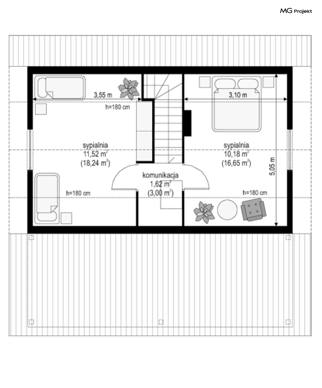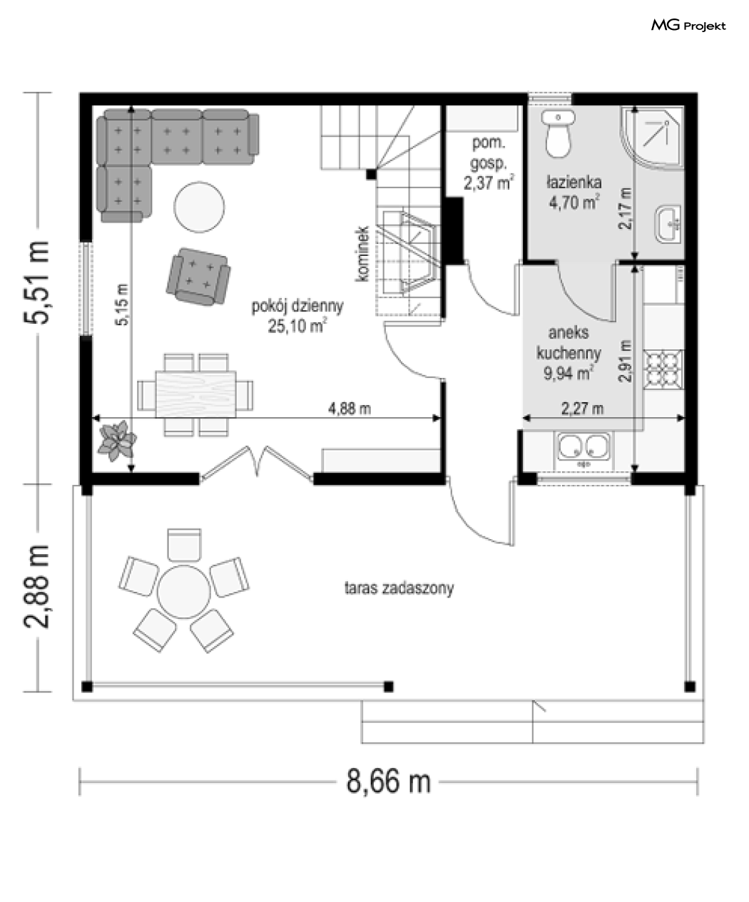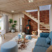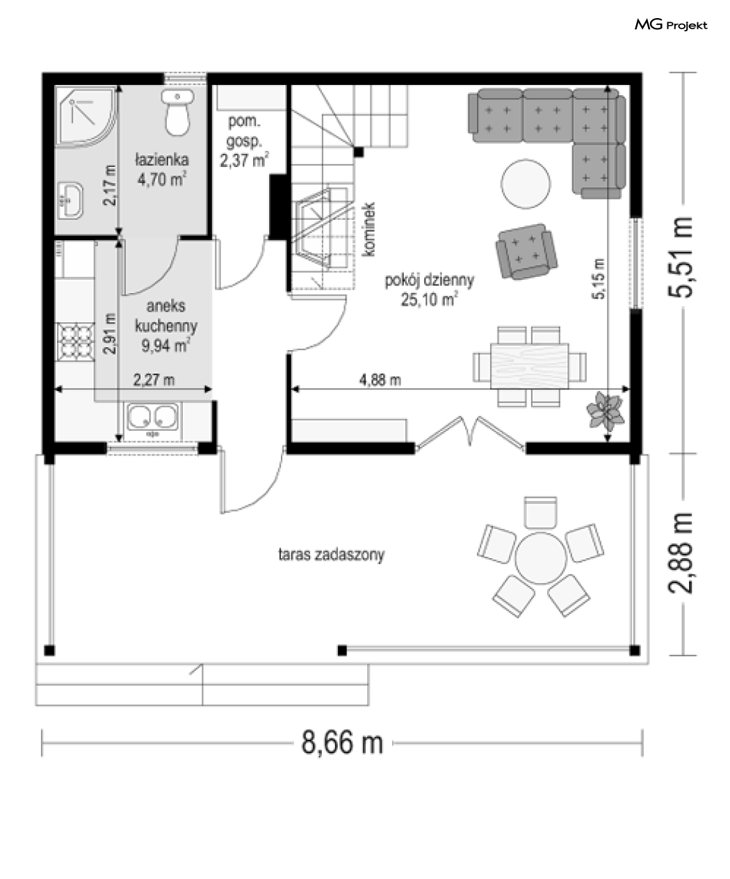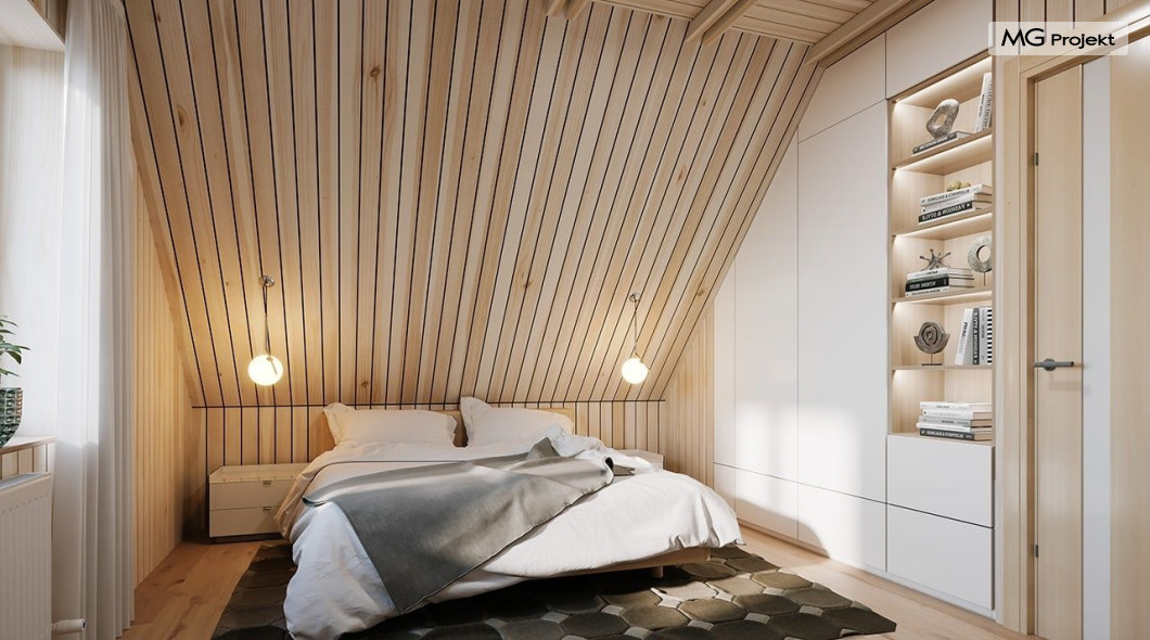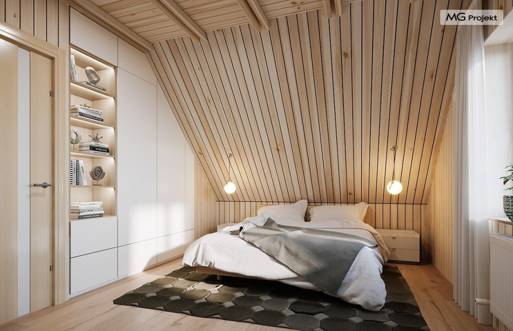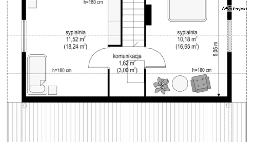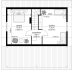 Projekt domu Przepiórka składa się z pokoju dziennego na parterze, oraz łazienki, pomieszczenia gospodarczego i kuchni. Na poddaszu natomiast - z dwóch pokoi sypialnych. Atutem projektu domu Przepiórka jest wielka zadaszona weranda, gdzie można schronić się przed słońcem lub deszczem. Weranda w projekcie domku Przepiórka połączona jest z salonem podwójnymi balkonowymi drzwiami, oraz drzwiami wejściowymi.