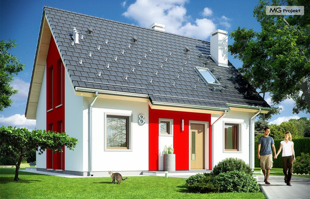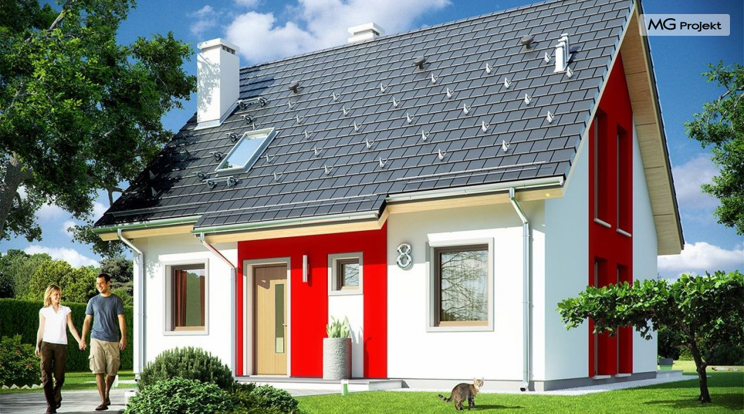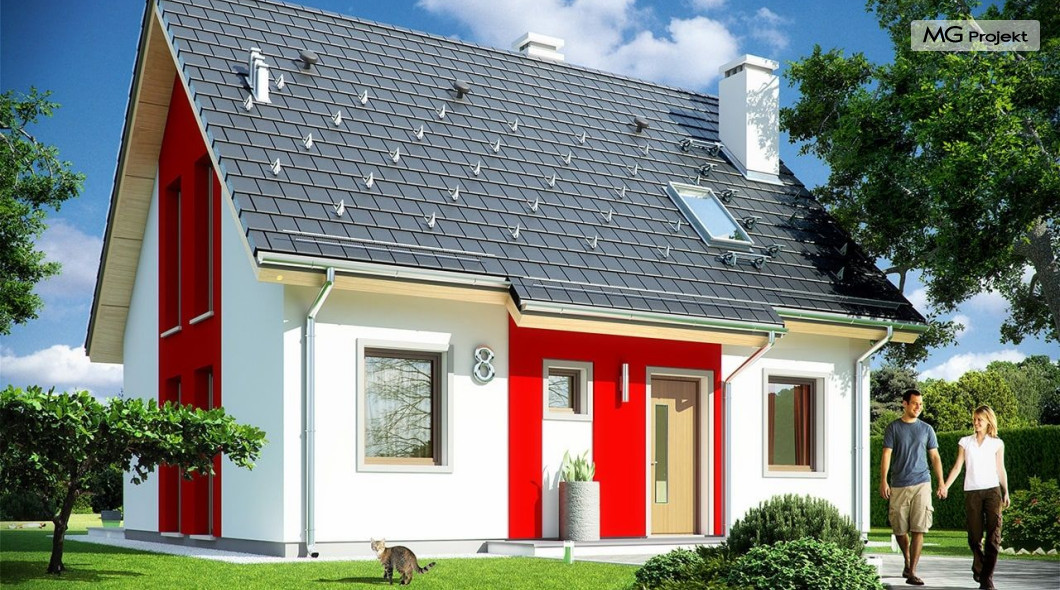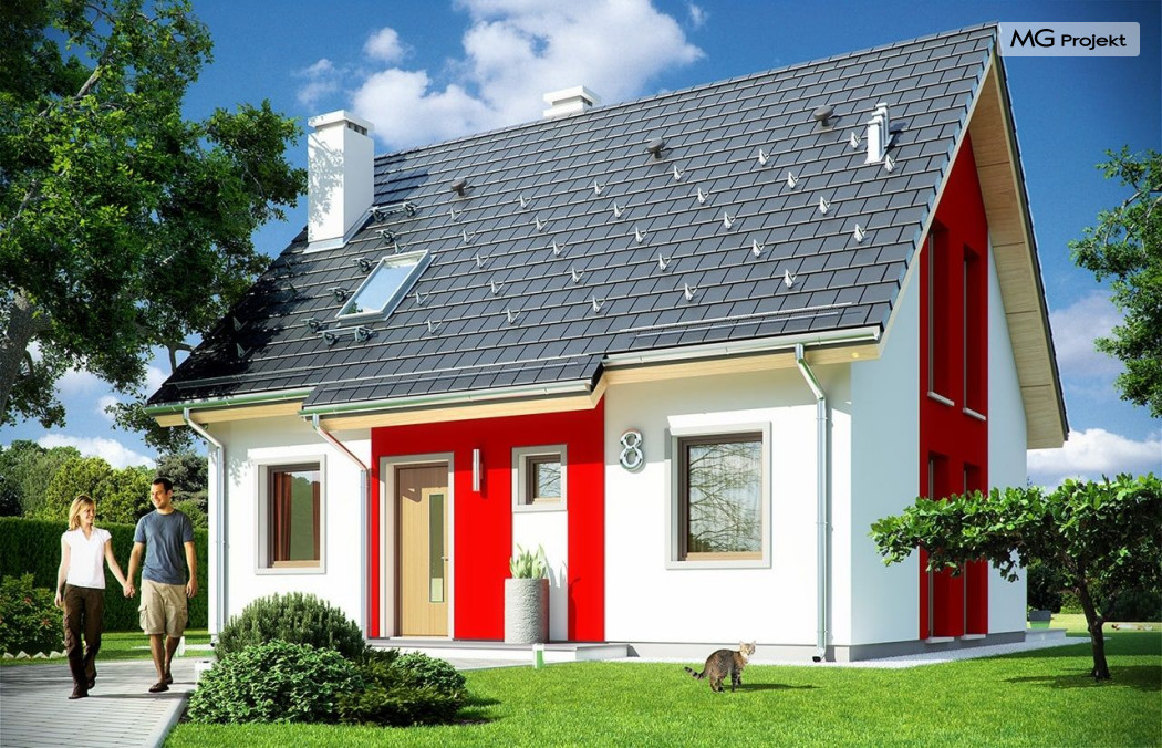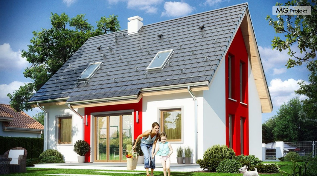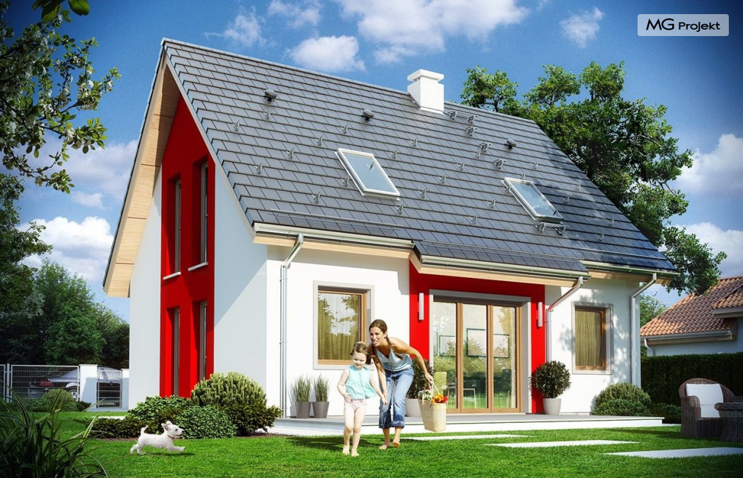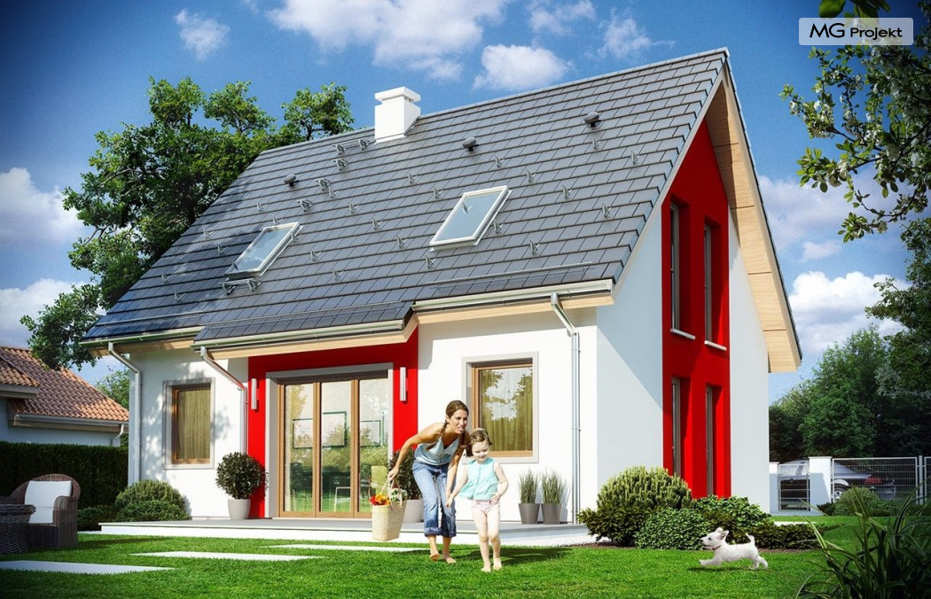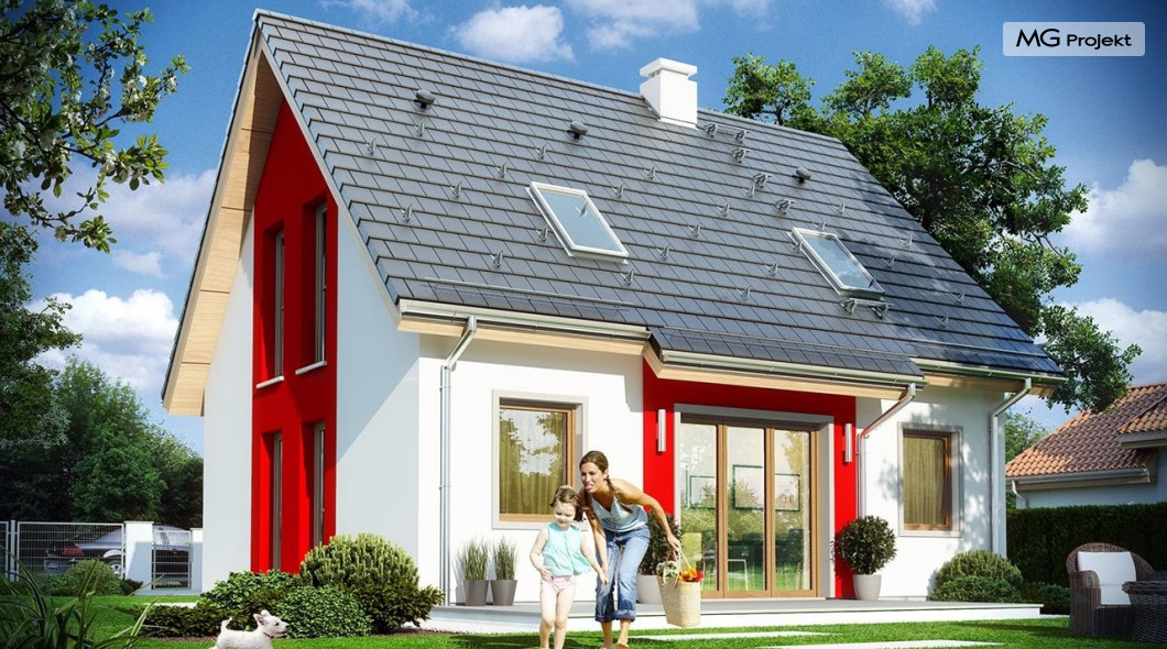 Projekt domu Przygoda to uroczy dom dla cztero-pięcioosobowej rodziny - parterowy, z poddaszem użytkowym, o zwartej prostokątnej bryle przykrytej dwuspadowym dachem. Prosta elegancja domu i jego funkcjonalność idą w parze z energooszczędnością i nowoczesnością. Kształt domu, jego proporcje od razu przywołują obraz „małego białego domku”, takiego domku z kominem - z dziecięcych wyobrażeń. Budowa domu to wielka przygoda. Dlaczego nie zdecydować się na nią z naszą „Przygodą” ;). Proporcjonalna symetryczna bryła wpasuje się w każde otoczenie. Nowoczesne materiały i kolorystyka budynku dodają domowi sznytu. Wnętrze domu mieści w sobie pięć pokoi, dwie łazienki i oddzielną kotłownię - wiele, jak na niespełna stumetrową powierzchnię. Na parterze mamy przestrzeń dzienną połączonego salonu, holu i kuchni, oraz dodatkowy pokój. Na poddaszu natomiast – trzy sypianie z łazienką. Projekt domu Przygoda ma wnętrze ustawne i funkcjonalne. Konstrukcja domu jest bardzo prosta i przejrzysta - będzie łatwa w budowie i – co najważniejsze - rozsądna kosztowo. Bardzo dobre ocieplenia ścian, podłóg i dachu powodują, że dom jest energooszczędny. W łatwy sposób można go dostosować do standardu NF40. Powierzchnia domu pozwala na zaliczenie projektu do programu MDM. Zapraszamy również do obejrzenia drugiego projektu tej serii: projekt domu Przygoda 2.