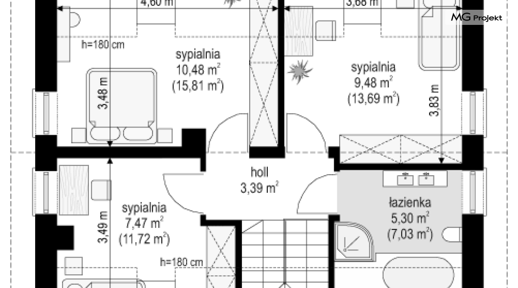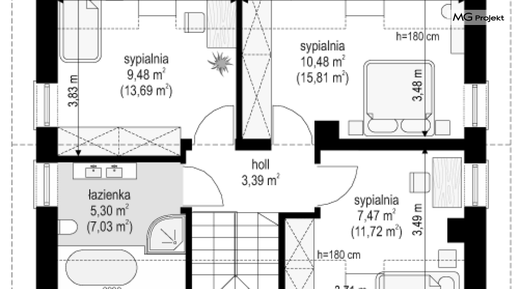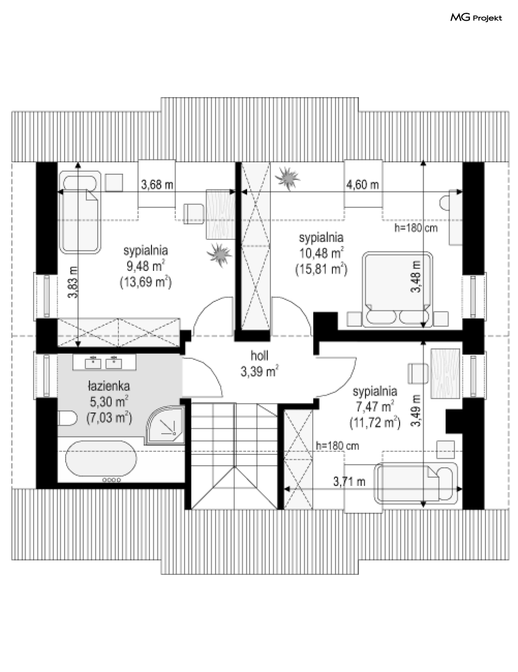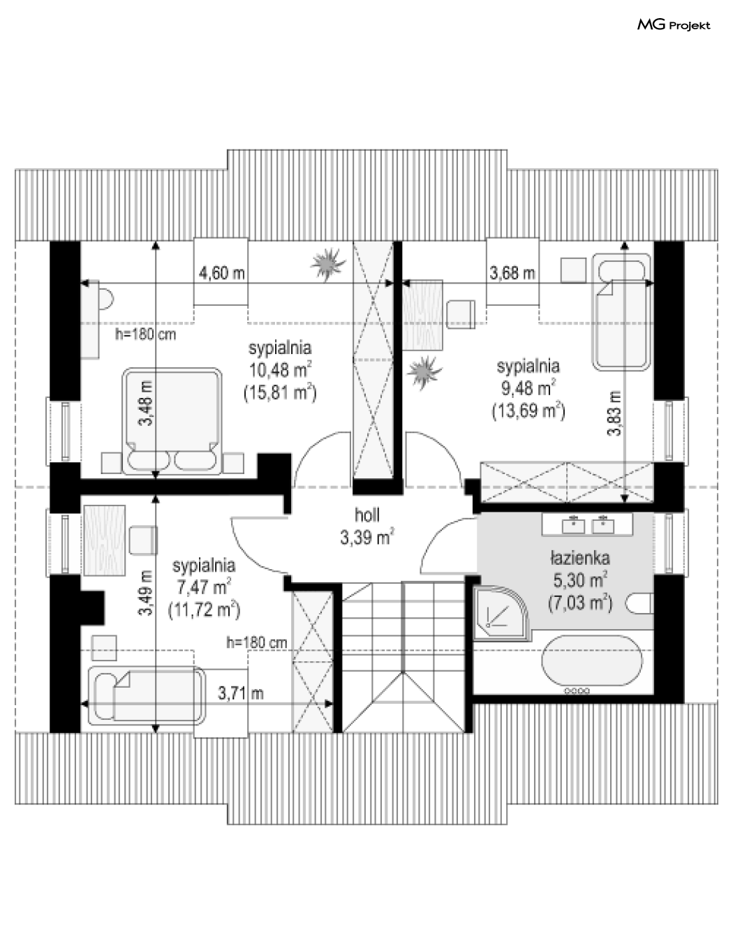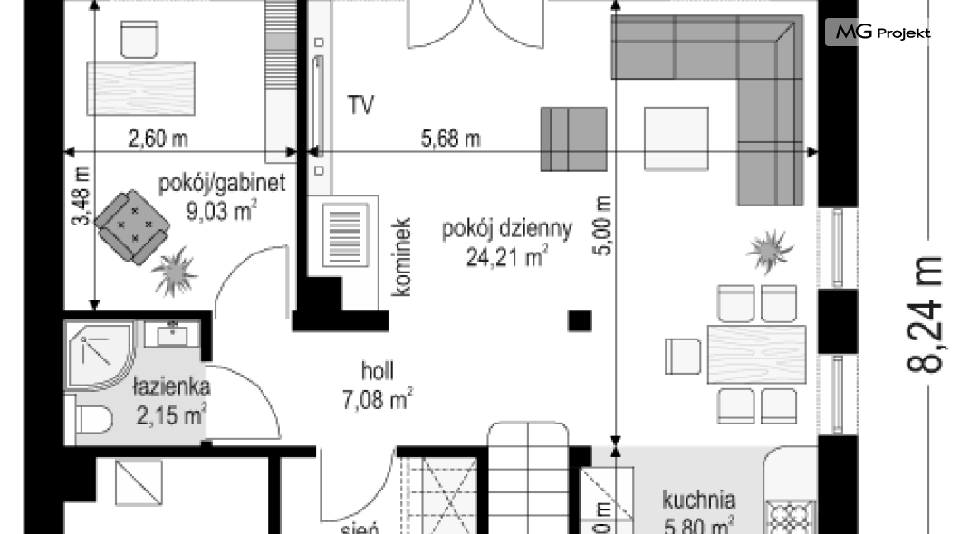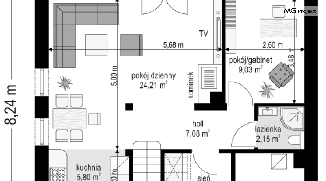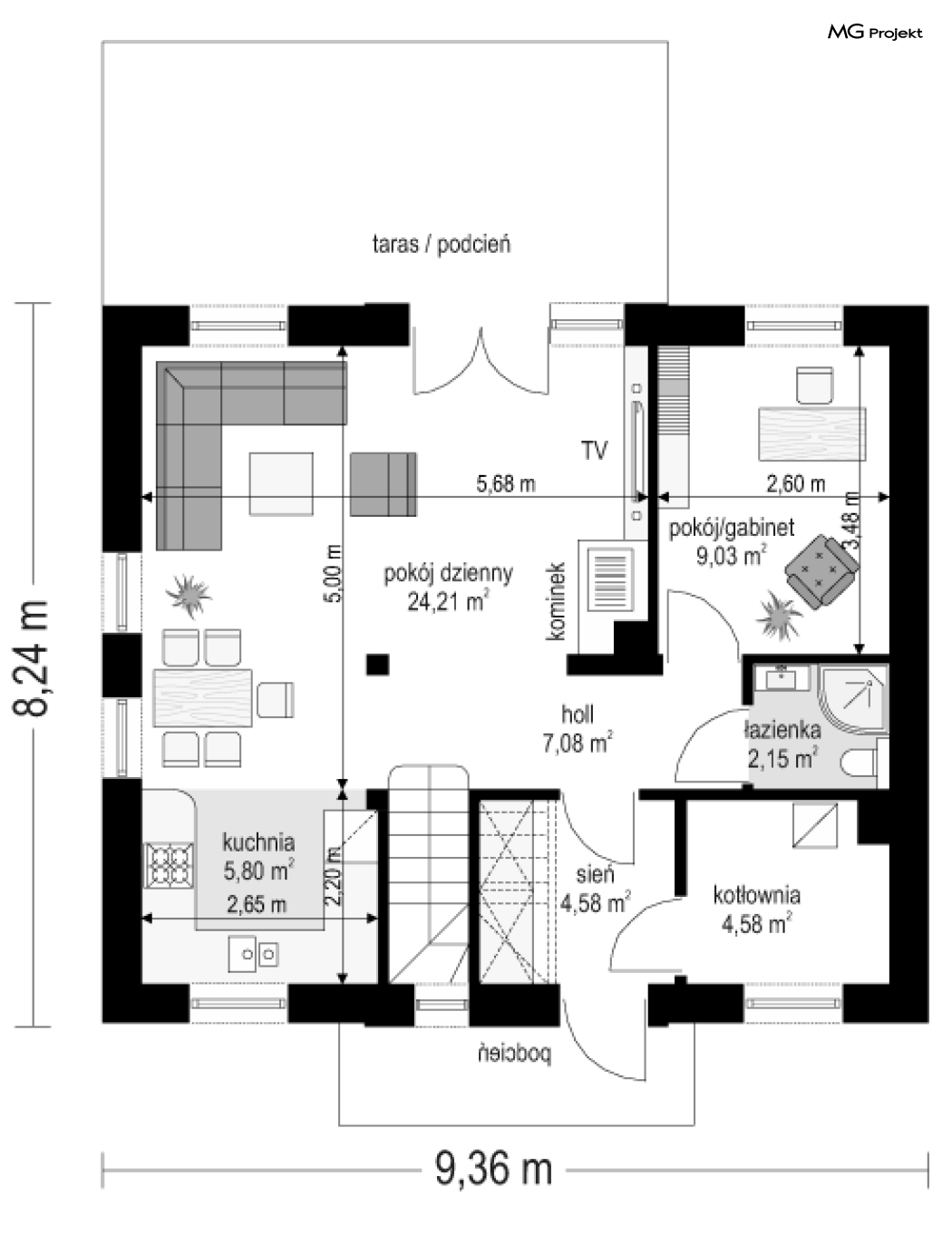 Projekt domu Przygoda to uroczy dom dla cztero-pięcioosobowej rodziny - parterowy, z poddaszem użytkowym, o zwartej prostokątnej bryle przykrytej dwuspadowym dachem. Prosta elegancja domu i jego funkcjonalność idą w parze z energooszczędnością i nowoczesnością. Kształt domu, jego proporcje od razu przywołują obraz „małego białego domku”, takiego domku z kominem - z dziecięcych wyobrażeń. Budowa domu to wielka przygoda. Dlaczego nie zdecydować się na nią z naszą „Przygodą” ;). Proporcjonalna symetryczna bryła wpasuje się w każde otoczenie. Nowoczesne materiały i kolorystyka budynku dodają domowi sznytu. Wnętrze domu mieści w sobie pięć pokoi, dwie łazienki i oddzielną kotłownię - wiele, jak na niespełna stumetrową powierzchnię. Na parterze mamy przestrzeń dzienną połączonego salonu, holu i kuchni, oraz dodatkowy pokój. Na poddaszu natomiast – trzy sypianie z łazienką. Projekt domu Przygoda ma wnętrze ustawne i funkcjonalne. Konstrukcja domu jest bardzo prosta i przejrzysta - będzie łatwa w budowie i – co najważniejsze - rozsądna kosztowo. Bardzo dobre ocieplenia ścian, podłóg i dachu powodują, że dom jest energooszczędny. W łatwy sposób można go dostosować do standardu NF40. Powierzchnia domu pozwala na zaliczenie projektu do programu MDM. Zapraszamy również do obejrzenia drugiego projektu tej serii: projekt domu Przygoda 2.