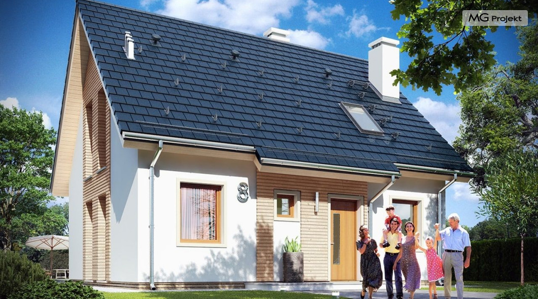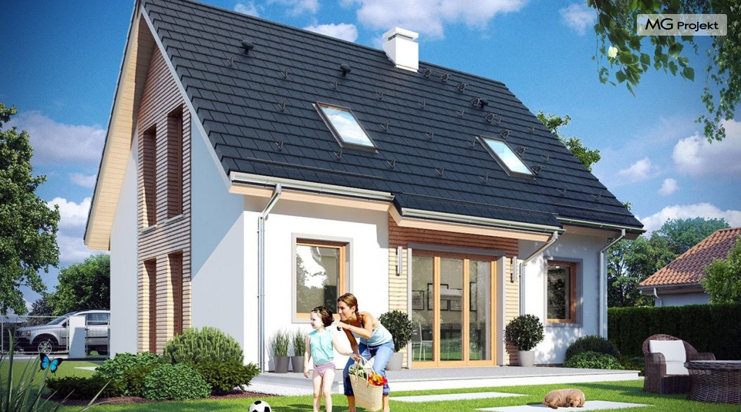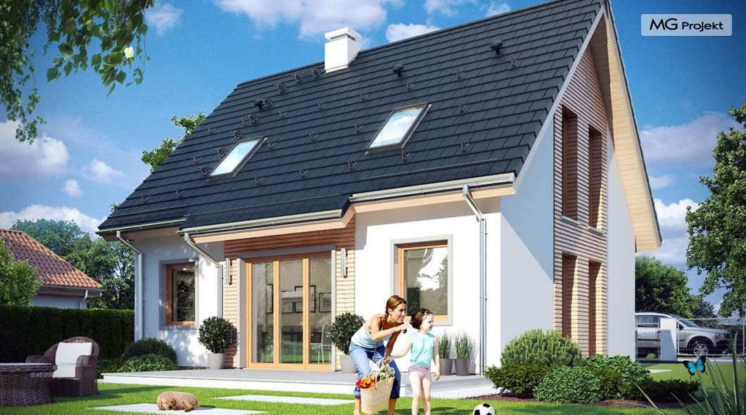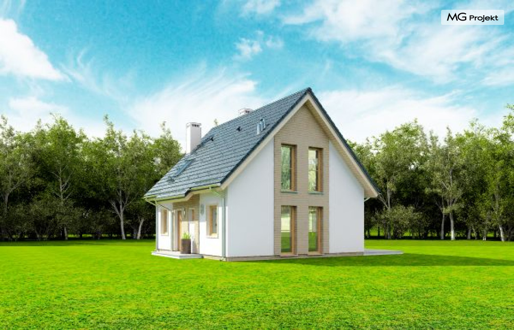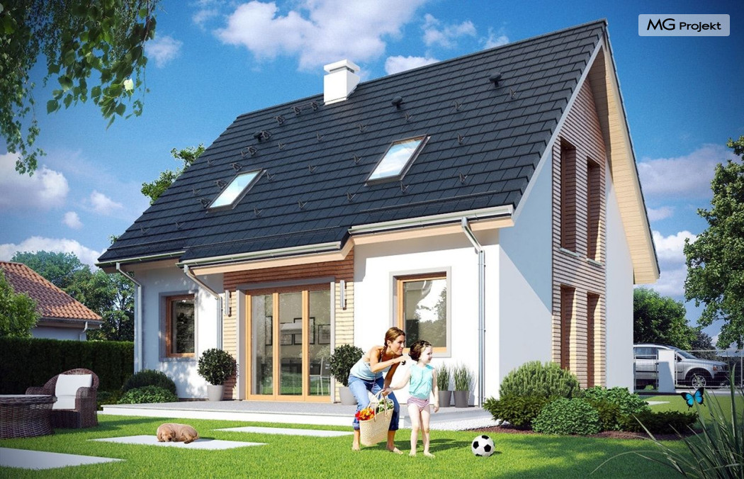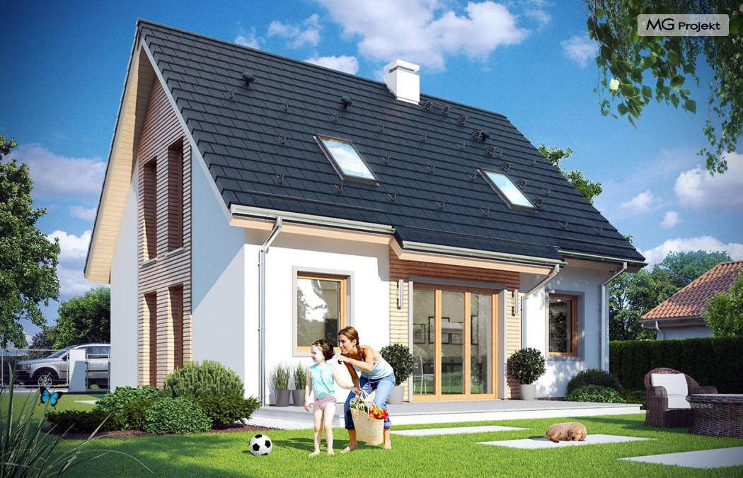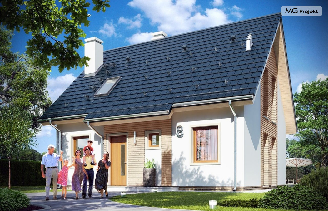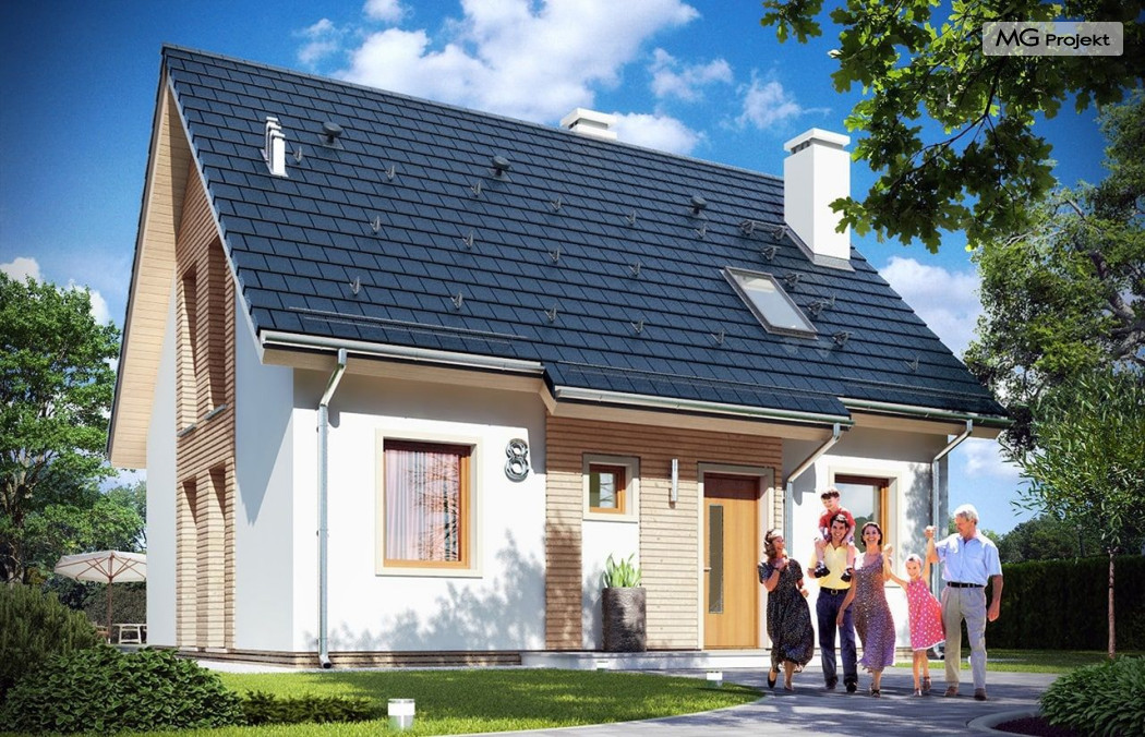 Projekt domu Przygoda 2 to sympatyczny dom dla cztero-pięcioosobowej rodziny - parterowy, z poddaszem użytkowym, o zwartej prostokątnej bryle przykrytej dwuspadowym dachem. Prosta elegancja domu i jego funkcjonalność idą w parze z energooszczędnością i nowoczesnością. Kształt domu, jego proporcje od razu przywołują obraz „małego białego domku”, takiego domku z kominem - z dziecięcych wyobrażeń. Budowa domu to wielka przygoda. Dlaczego nie zdecydować się na nią z naszą „Przygodą” ;). Proporcjonalna symetryczna bryła wpasuje się w każde otoczenie. Nowoczesne materiały i kolorystyka budynku dodają domowi sznytu. Wnętrze domu mieści w sobie cztery pokoje, dwie łazienki i oddzielną kotłownię - wiele, jak na niespełna stumetrową powierzchnię. Na parterze, w tej wersji projektu mamy mamy dużą przestrzeń dzienną połączonego salonu, holu i kuchni. Na poddaszu natomiast – trzy sypianie z łazienką. Projekt domu Przygoda 2 ma wnętrze ustawne i funkcjonalne. Konstrukcja domu jest bardzo prosta i przejrzysta - będzie łatwa w budowie i – co najważniejsze - rozsądna kosztowo. Bardzo dobre ocieplenia ścian, podłóg i dachu powodują, że dom jest energooszczędny. W łatwy sposób można go dostosować do standardu NF40. Niewielka powierzchnia użytkowa domu pozwala na zaliczenie projektu do programu MDM. Zapraszamy również do obejrzenia pierwszego projektu tej serii: projekt domu Przygoda.