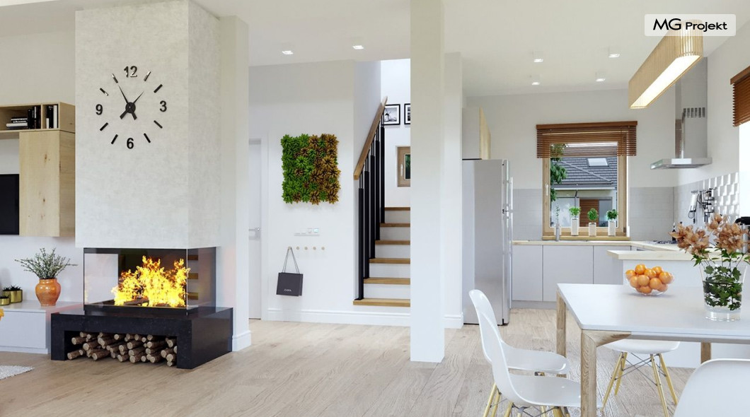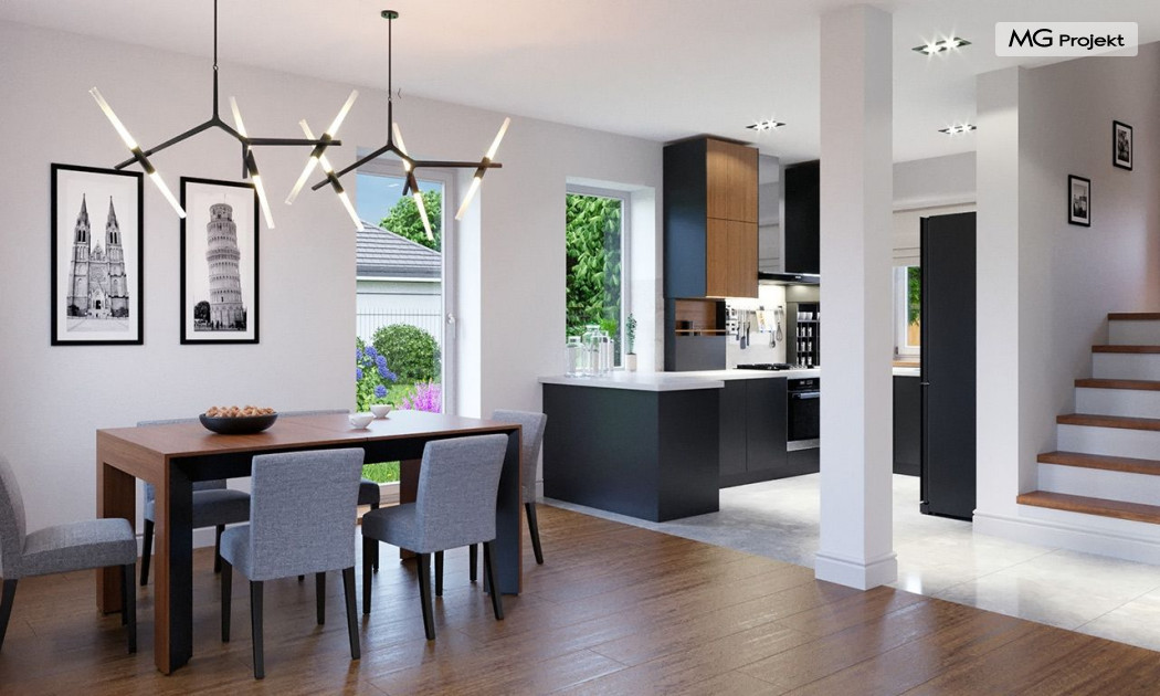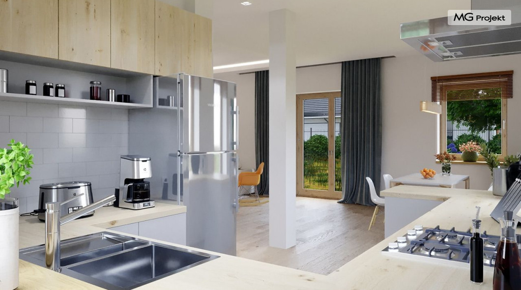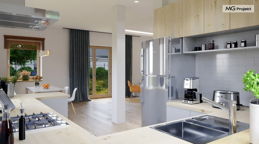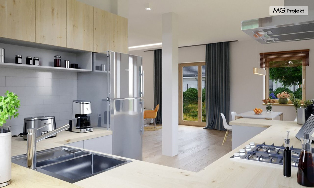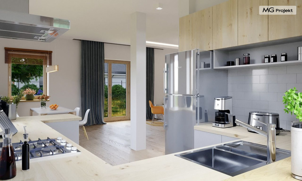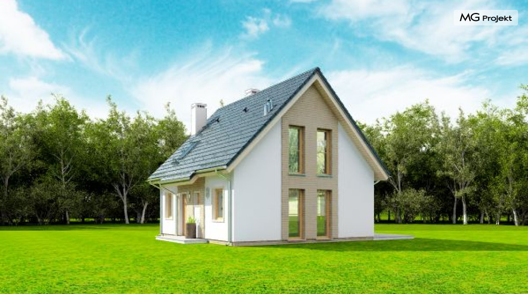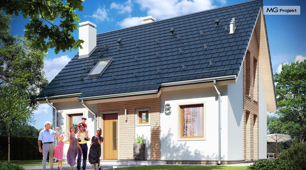 Projekt domu Przygoda 2 to sympatyczny dom dla cztero-pięcioosobowej rodziny - parterowy, z poddaszem użytkowym, o zwartej prostokątnej bryle przykrytej dwuspadowym dachem. Prosta elegancja domu i jego funkcjonalność idą w parze z energooszczędnością i nowoczesnością. Kształt domu, jego proporcje od razu przywołują obraz „małego białego domku”, takiego domku z kominem - z dziecięcych wyobrażeń. Budowa domu to wielka przygoda. Dlaczego nie zdecydować się na nią z naszą „Przygodą” ;). Proporcjonalna symetryczna bryła wpasuje się w każde otoczenie. Nowoczesne materiały i kolorystyka budynku dodają domowi sznytu. Wnętrze domu mieści w sobie cztery pokoje, dwie łazienki i oddzielną kotłownię - wiele, jak na niespełna stumetrową powierzchnię. Na parterze, w tej wersji projektu mamy mamy dużą przestrzeń dzienną połączonego salonu, holu i kuchni. Na poddaszu natomiast – trzy sypianie z łazienką. Projekt domu Przygoda 2 ma wnętrze ustawne i funkcjonalne. Konstrukcja domu jest bardzo prosta i przejrzysta - będzie łatwa w budowie i – co najważniejsze - rozsądna kosztowo. Bardzo dobre ocieplenia ścian, podłóg i dachu powodują, że dom jest energooszczędny. W łatwy sposób można go dostosować do standardu NF40. Niewielka powierzchnia użytkowa domu pozwala na zaliczenie projektu do programu MDM. Zapraszamy również do obejrzenia pierwszego projektu tej serii: projekt domu Przygoda.