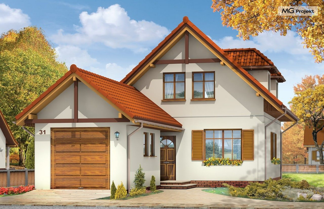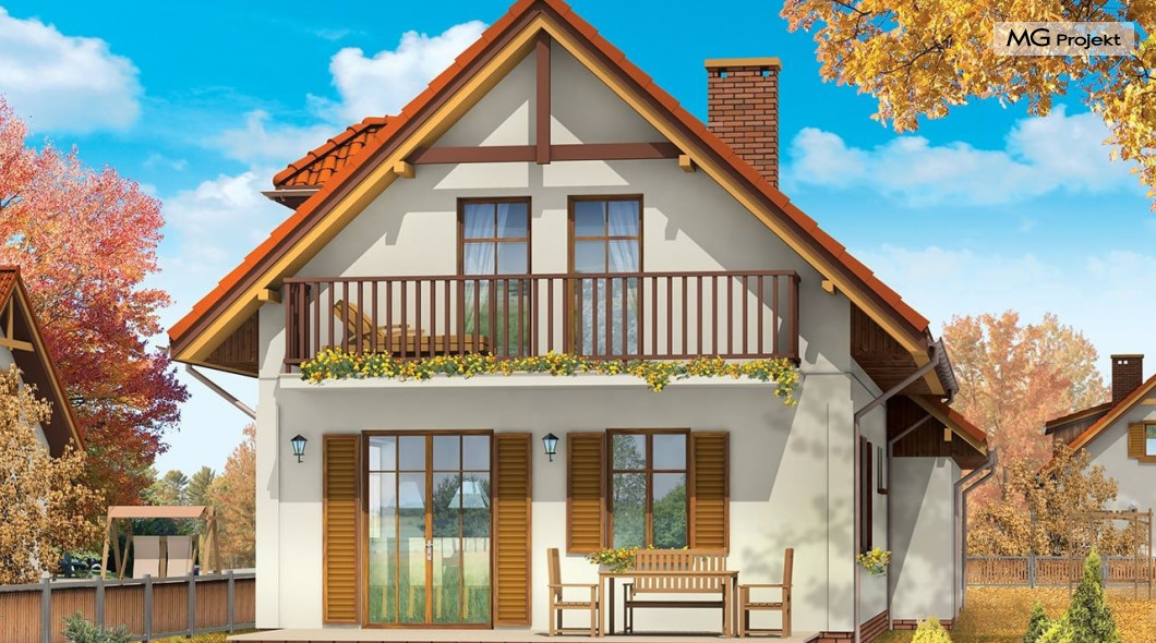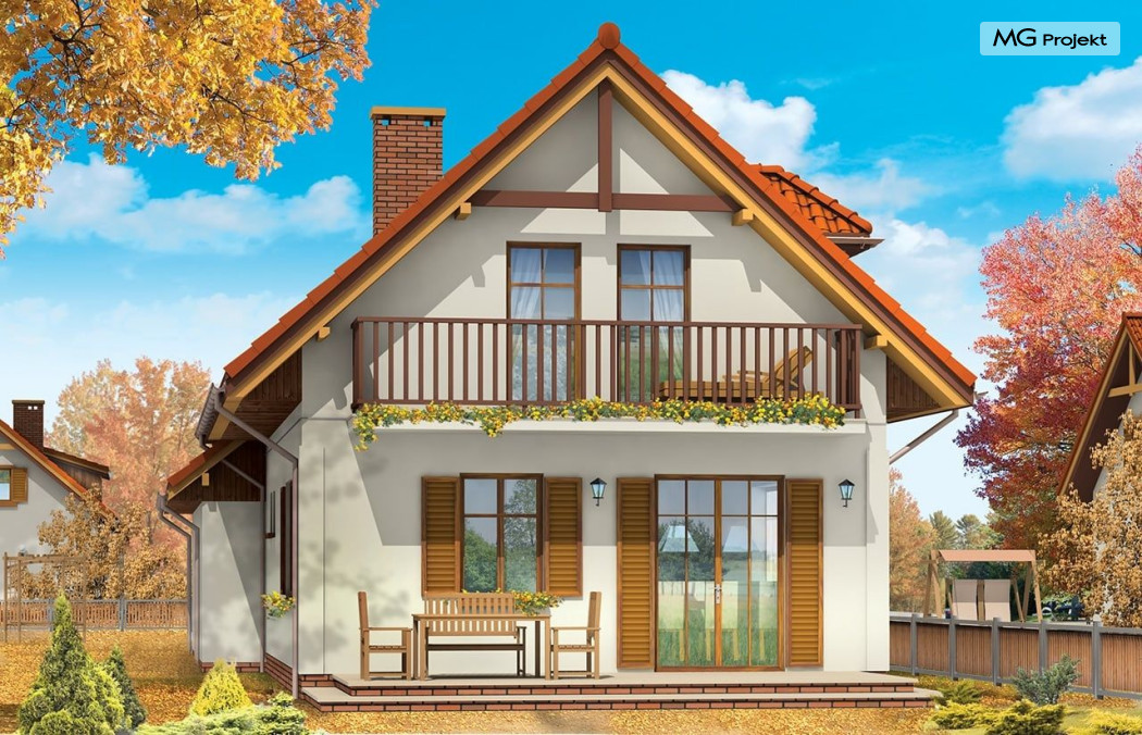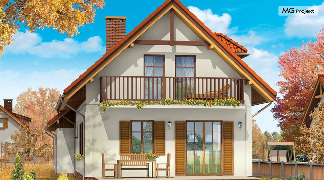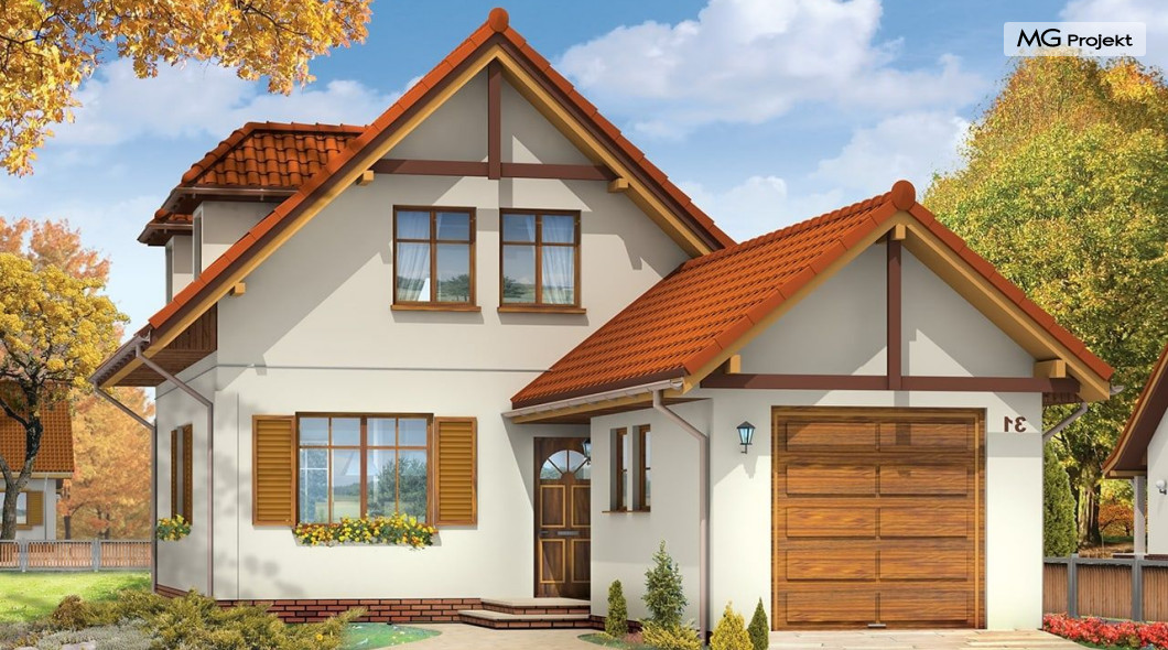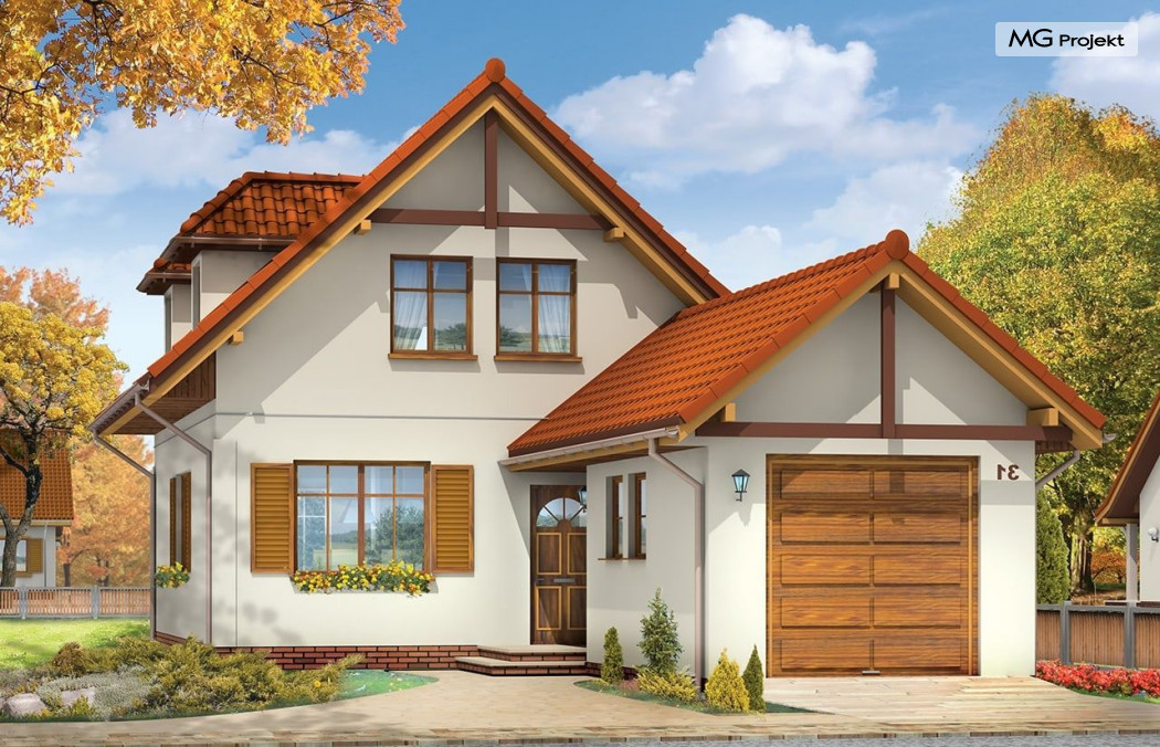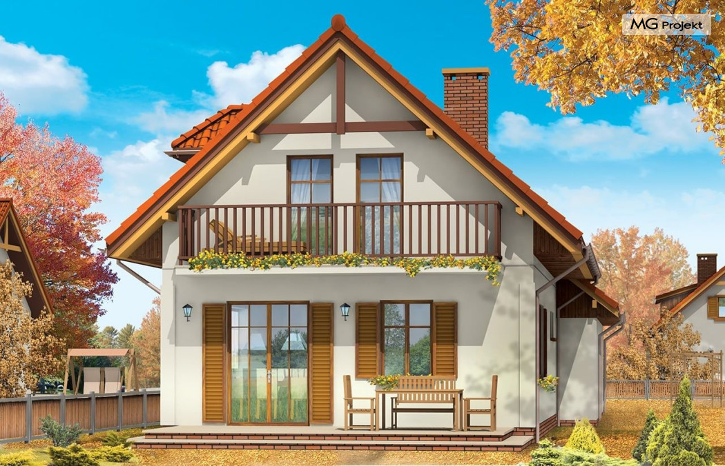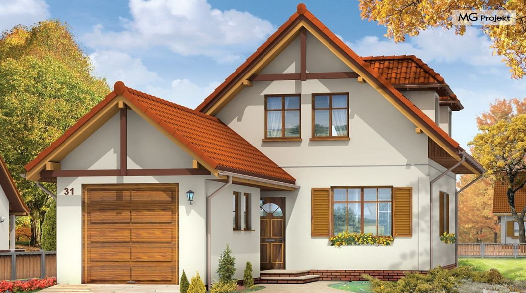 Projekt domu Puchatek to domek jednorodzinny z poddaszem użytkowym dla rodziny 4-5 osobowej. Dom z garażem wysuniętym przed ścianę frontową budynku idealnie pasuje na wąską działkę, lub na działkę przy ruchliwej ulicy, gdzie inwestor chce akustycznie i wizualnie odgrodzić się od drogi. Projekt domu Puchatek, chociaż jest niewielki ma na parterze przestronny salon z kominkiem, z aneksem jadalnym, otwarty na kuchnię i hol, z widocznymi schodami. Na poddaszu zaprojektowano trzy sypialnie i łazienkę. Dom jest prosty w konstrukcji, łatwy w budowie. Sympatyczny, pełen wdzięku wygląd idzie tu w parze z wygodnym i funkcjonalnym wnętrzem. Pracownia posiada również projekt domu Puchatek w odbiciu lustrzanym.