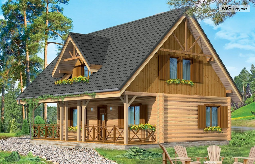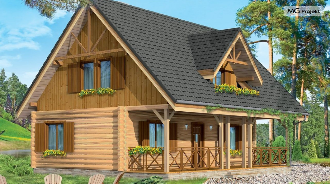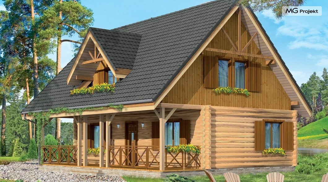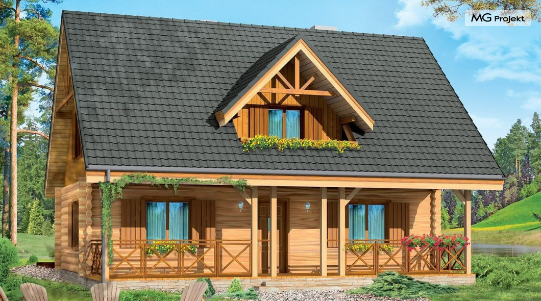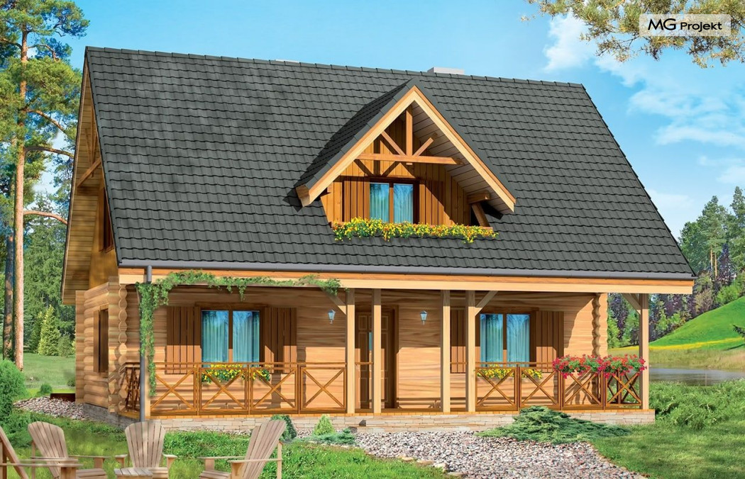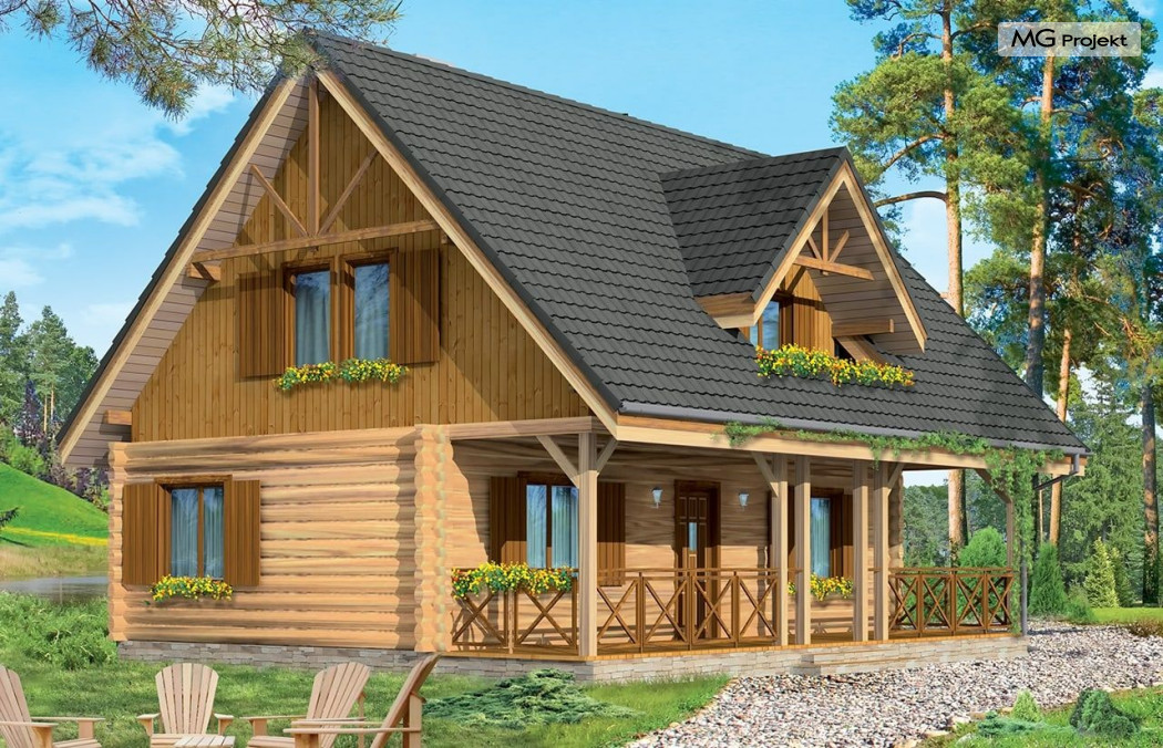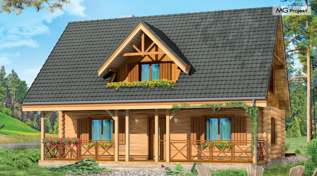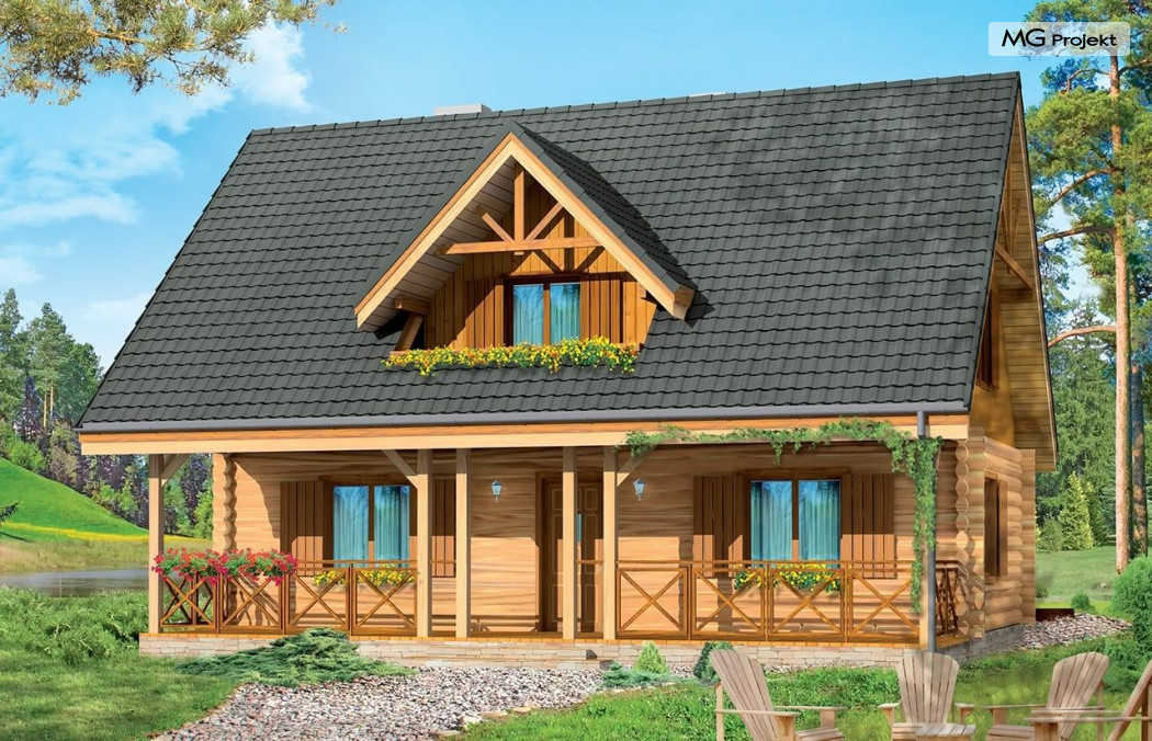 Projekt domu Ranczo to budynek z litego bala, ocieplony od wewnątrz. Projekt domu parterowego z poddaszem użytkowym, przeznaczony dla 4-6ciu osób. Projekt domu Ranczo może być wykorzystany jako całoroczny budynek mieszkalny, ale również jako dom letniskowy. Budynek, dzięki swojej prostocie, przypomina wiejskie chaty. Jednocześnie jego architektura nie nawiązuje do żadnego ludowego regionalnego wzoru, forma jest więc uniwersalna. Duży dwuspadowy dach z okapami, osadzona na środku frontowej elewacji lukarna z balkonikiem, weranda o szerokości całego domu podparta na słupach z zastrzałami - te elementy łatwo skojarzą się z sielskim wiejskim siedliskiem. Dom skierowano w jedną stronę - elewacja frontowa jest jednocześnie ogrodową. Przy działkach rekreacyjnych to często spotykany układ. Podział wnętrza domu jest również bardzo tradycyjny i przypomina stare wiejskie chaty lub dworki: środkowa część to hol z przedsionkiem i schodami, po bokach natomiast mieszczą się salon i kuchnia, oraz pomieszczenie gospodarcze. Wielki zadaszony taras - weranda z przodu da cień przed słońcem i schronienie przed deszczem. Na poddaszu zaprojektowano trzy sypialnie i bardzo ładną łazienkę. Ponadto z holu można wyjść na malowniczy balkonik. Projekt domku Ranczo dostępny jest też w odbiciu lustrzanym.