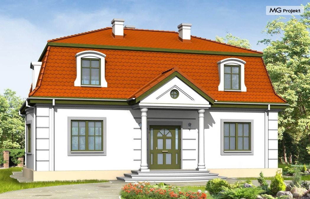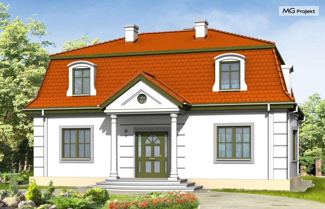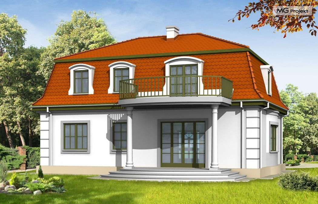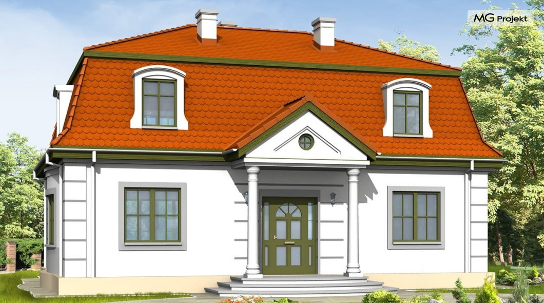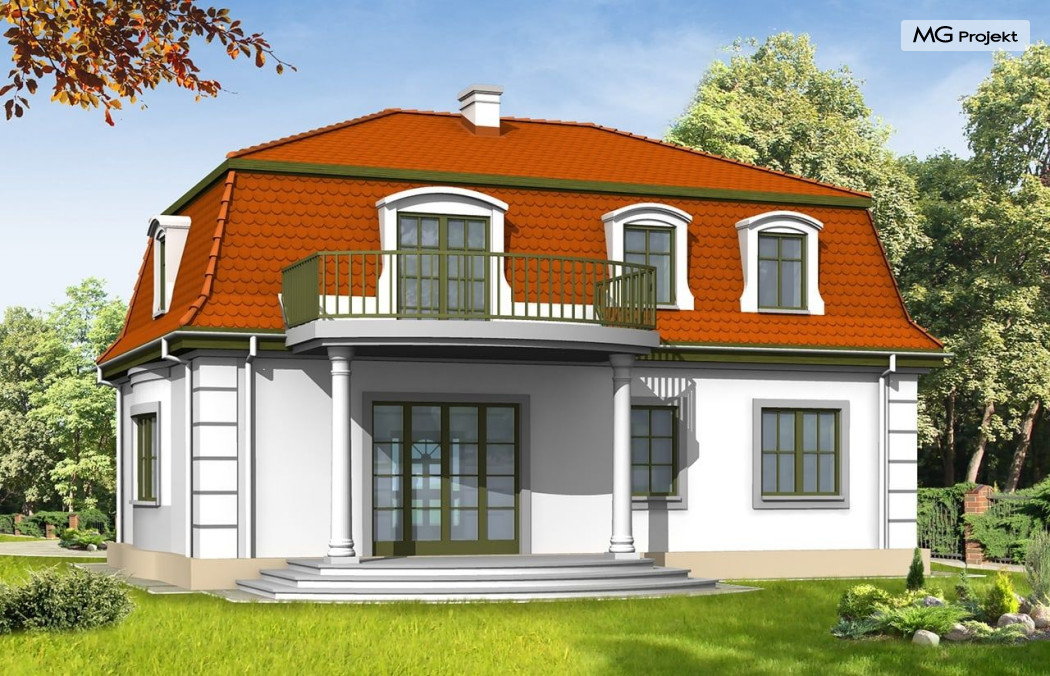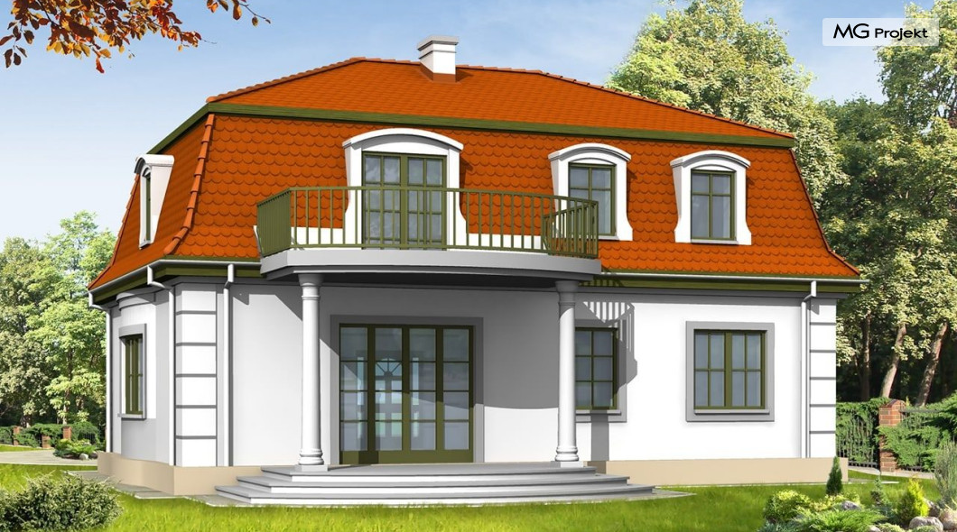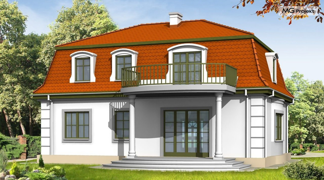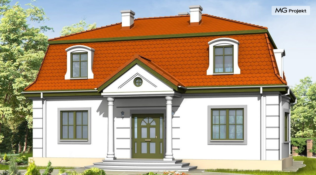Projekt domu Retro to stylowa willa z dachem mansardowym, zaprojektowana z myślą o Inwestorach doceniających klasyczne formy. Zewnętrzna szata kontrastuje z funkcjonalnie zaprojektowanym wnętrzem. Parter projektu domu Retro mieści przestronny salon, kuchnię (zamykaną drzwiami przesuwnymi), gabinet do pracy z oknem na ogród oraz sypialnię rodziców. Na poddaszu znajdują się cztery sypialnie i łazienka - może być ono osobnym mieszkaniem. Do ściany bocznej można dostawić garaż. Projekt domu Retro dostępny jest również w odbiciu lustrzanym.