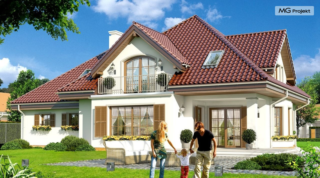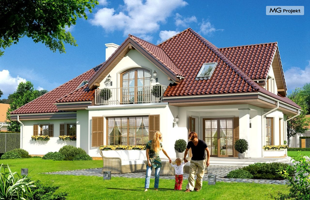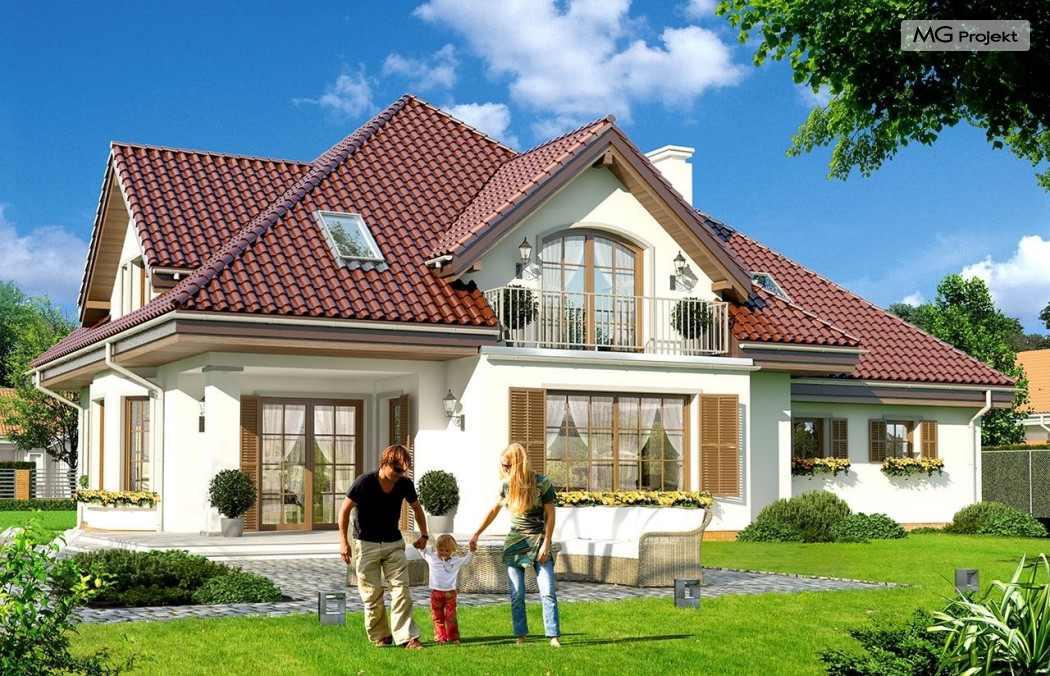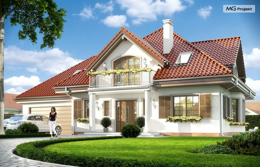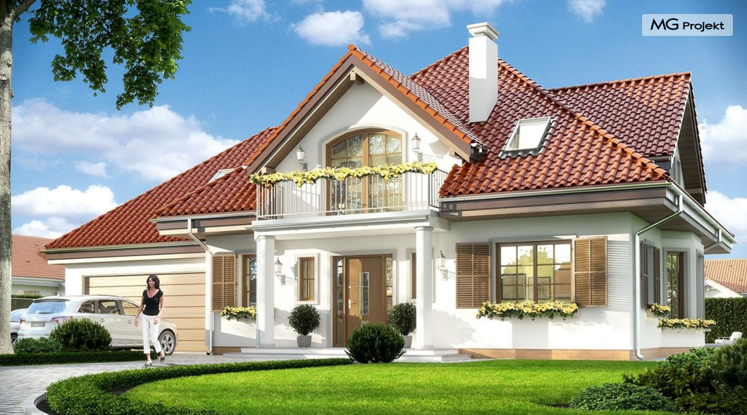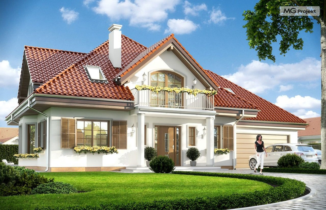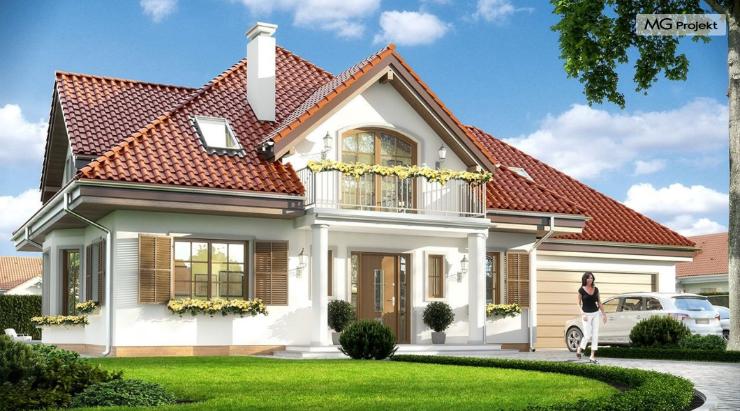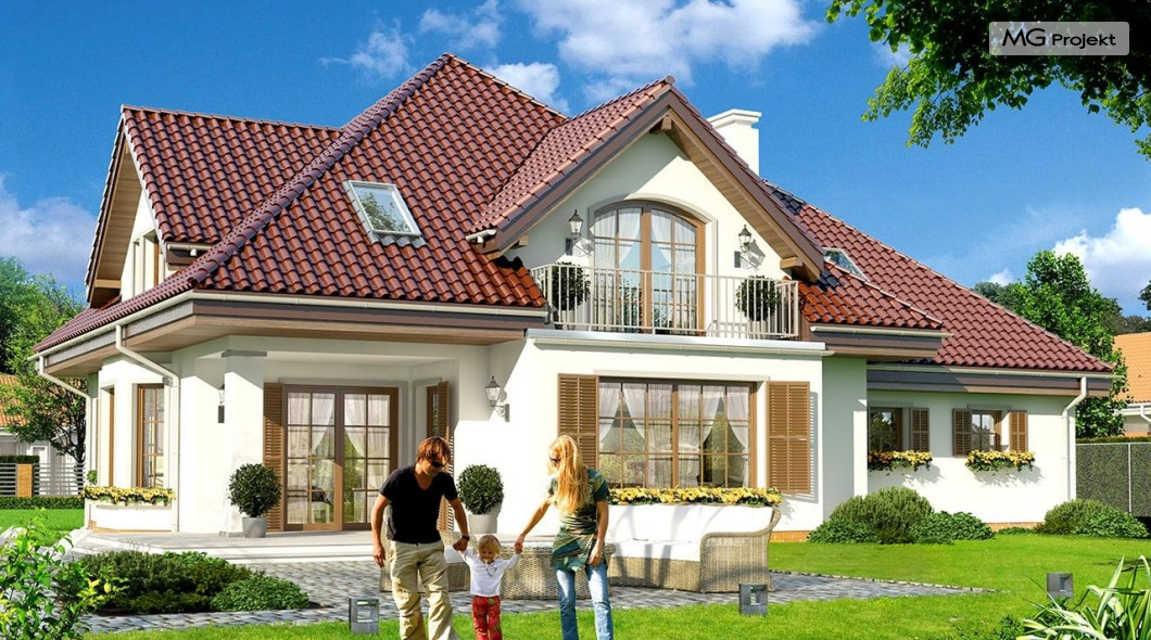 Projekt domu Romeo to komfortowy dom jednorodzinny, dla 4-6 osobowej rodziny, parterowy z poddaszem użytkowym. Budynek ma zwartą bryłę, zaprojektowaną na planie kwadratu, z dobudowaną częścią garażowo-gospodarczą. Jest wariantem projektu Julka- jej większym bratem. Architektonicznie domek nawiązuje do tradycji polskiego dworku i przedwojennych willi, ale we współczesnym duchu – z wykorzystaniem nowoczesnych materiałów i technologii. Dom jest bardzo dobrze izolowany – w łatwy sposób może stać się budynkiem energooszczędnym. Elewację frontową ozdobiono podestem wejściowym, nad którym na dwóch kolumnach wsparto balkonik. Szerokie drzwi z bocznymi naświetlami zapraszają nas do wnętrza. Elewację ogrodową z kolei ozdabiają: wykusz salonu z pięknym szerokim oknem, oraz podcień, przez który szerokimi drzwiami balkonowymi wychodzimy z pokoju dziennego na taras i do ogrodu. Wnętrze domu podzielono na część dzienną na parterze, część nocną – z sypialniami na poddaszu, oraz część gospodarczą w dobudowanej bryle garażu. Piękny, bardzo duży salon, połączony z holem i półotwartą kuchnią tworzy komfortową i reprezentacyjną przestrzeń dzienną, dla której przyjęcie, czy uroczysty obiad nie będzie wyzwaniem. W środku przestrzeni znajdują się reprezentacyjne schody na poddasze, ozdabiające hol. Obok kuchni znajduje się potrzebna spiżarka. Po drugiej stronie przedsionka – dodatkowy pokój (gabinet lub sypialnia gościnna). Z holu przechodzimy do dwustanowiskowego garażu i dużej kotłowni. Na poddaszu mieszczą się trzy wygodne sypialnie i przestronna łazienka. Sypialnia rodziców – z własną garderobą. Nad garażem znajduje się wolna przestrzeń strychu, który można łatwo zaadaptować na cele użytkowe. Projekt domu Romeo to dobrze przemyślany, funkcjonalny i wygodny budynek, w pięknym „opakowaniu”. Pracownia posiada także odbicie lustrzane projektu.