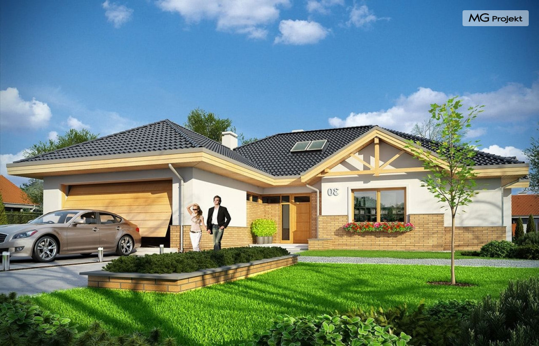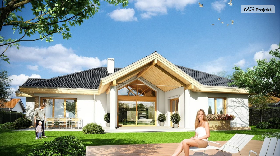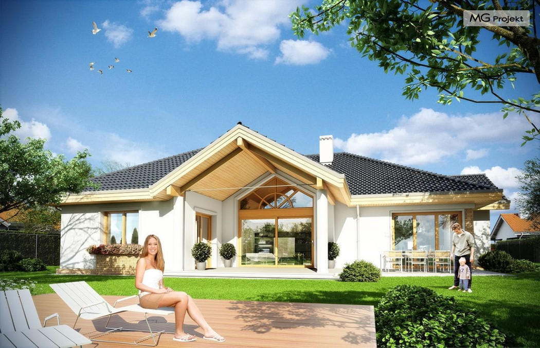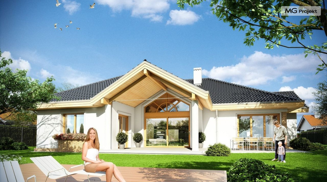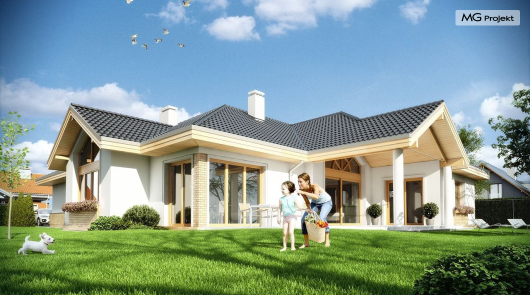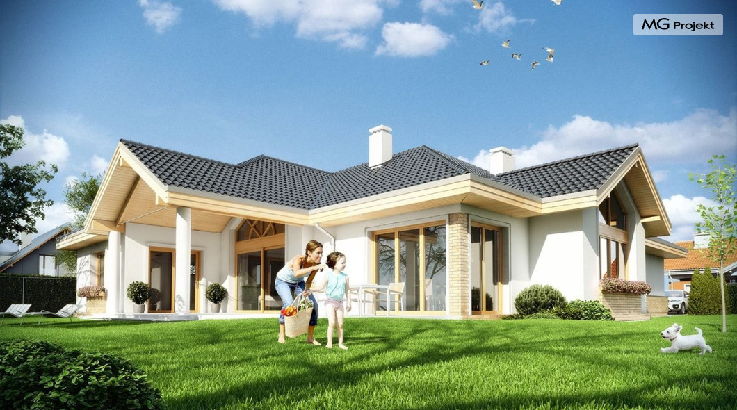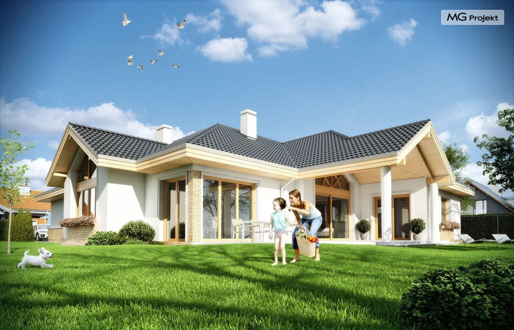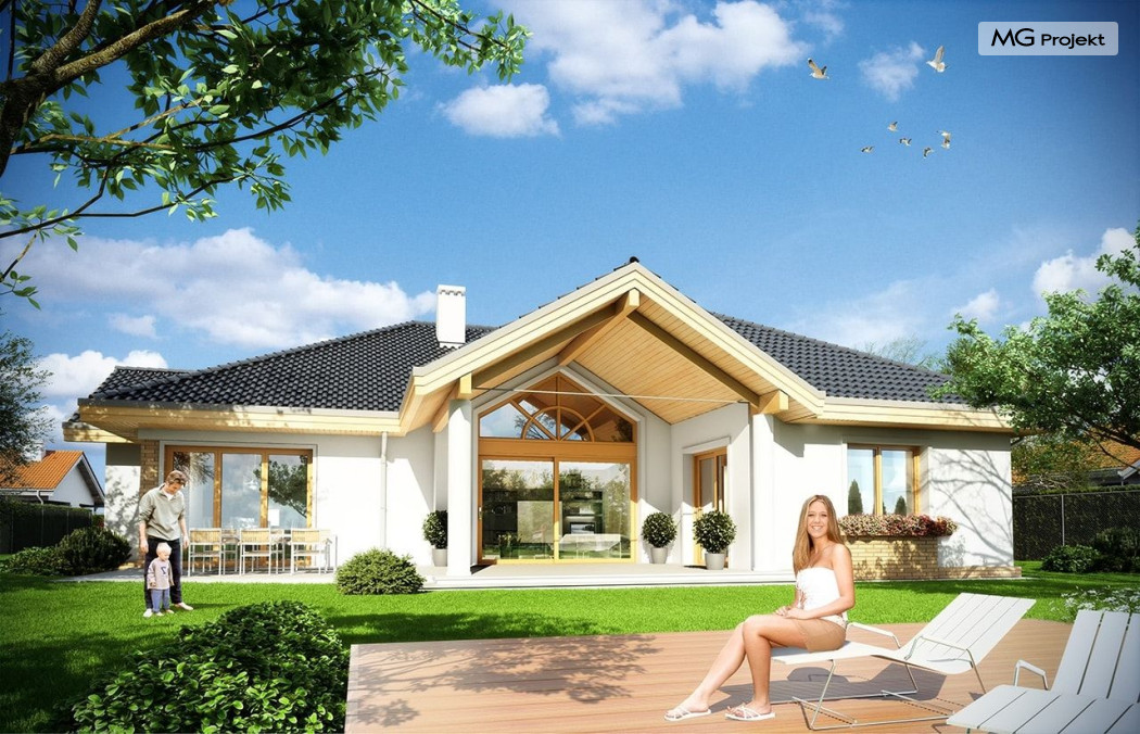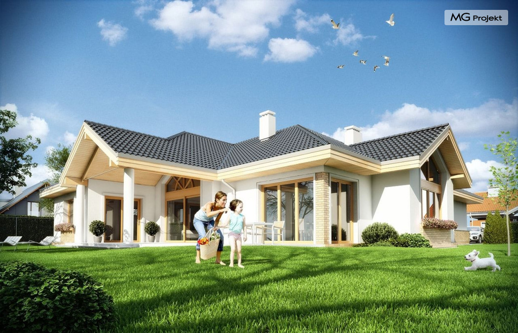 Projekt domu Rozłożysty to fantastyczna komfortowa willa, łącząca w sobie elementy nowoczesności i tradycyjnej formy. Dom jednorodzinny przeznaczony dla 4-5 osobowej rodziny. Parterowy układ funkcjonalny, gdzie wszystkie pomieszczenia dostępne są z jednego poziomu, rozczłonkowana bryła przykryta łagodnymi dachami, część dzienna z wysokimi sufitami sięgającymi dachu, bliskość wnętrza z otaczającym ogrodem - to wszystko powoduje, że dom będzie wspaniałym miejscem do życia. Każda elewacja jest ciekawa i oryginalna. Front domu, z wykuszem zakończonym daszkiem, oraz mini-dziedzińcem wejściowym, z eleganckimi drzwiami z naświetlem. Elewacja ogrodowa z pięknym zadaszonym tarasem i przeszkleniami salonu. Nawet elewacje boczne – z dodatkowymi wykuszami są interesujące. W elewacjach zastosowano tradycyjne elementy z użyciem współczesnych detali. Dom Rozłożysty ma solidny wygląd, a jednocześnie jest bardzo świeży i nowoczesny. Budynek doskonale wpasuje się w niemal każdy teren - najlepiej będzie wyglądał na większej działce, w otoczeniu rzadszej zabudowy. Projekt domu Rozłożysty obejmuje – na parterze: część dzienną – z salonem, jadalnią, kuchnią i holem, część nocną – z czterema pokojami, oraz część gospodarczą - z garażem i kotłownią. Prócz tego można dowolnie wykorzystać przestrzeń strychu - jako zamknięty magazyn, lub jako otwartą na salon antresolę (na przykład pokój sportowy, czy hobby). Fenomenalną przestrzeń dzienną, z pustką nad salonem i kuchnią zobaczyć można na naszych wizualizacjach wnętrz. Budynek przez rozległy plan i spory dach nie będzie z pewnością najtańszy w realizacji, ale na pewno wart jest szaleństwa. Szczególnie jeśli już mieszkało się wcześniej w domu i spędziło pół życia biegając po schodach i nie wykorzystując w pełni wyższych kondygnacji. Zastosowane energooszczędne materiały, izolacje i instalacje sprawią, że dom nie będzie drogi w utrzymaniu. Pracownia posiada odbicie lustrzane projektu domu Rozłożysty oraz wersję o większej powierzchni 182.75 m2 ze zmienionym układem pomieszczeń (projekt domu Rozłożysty 2).