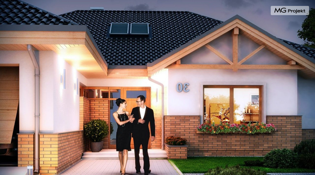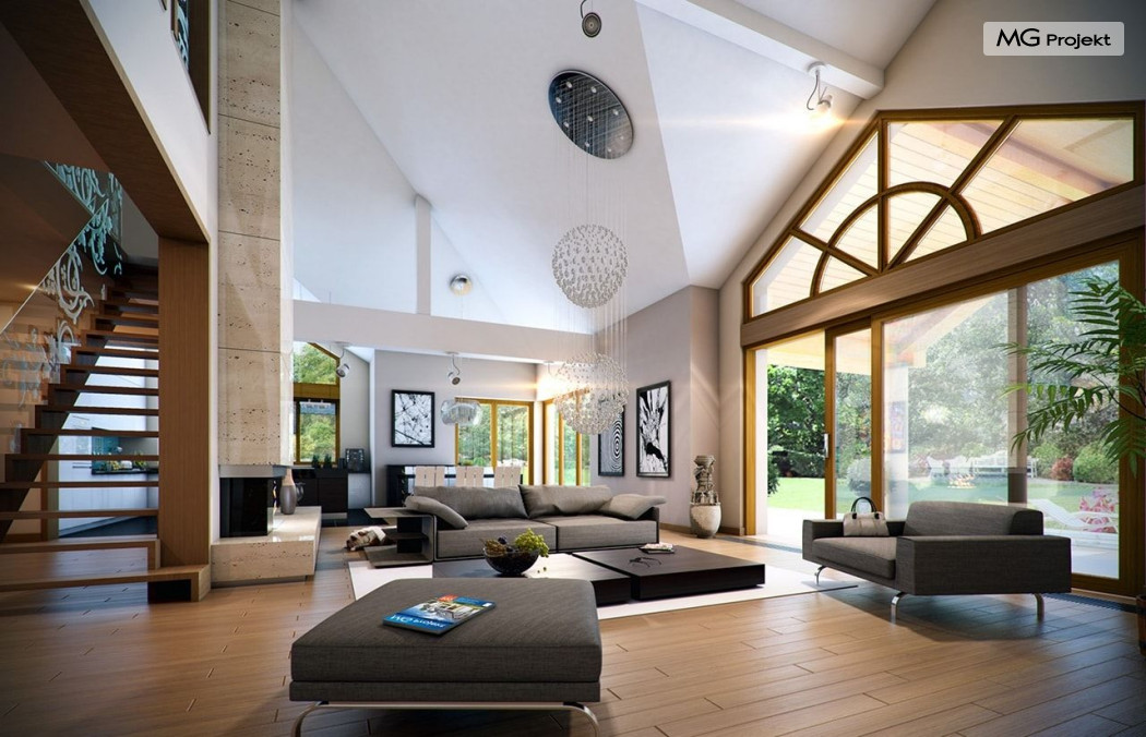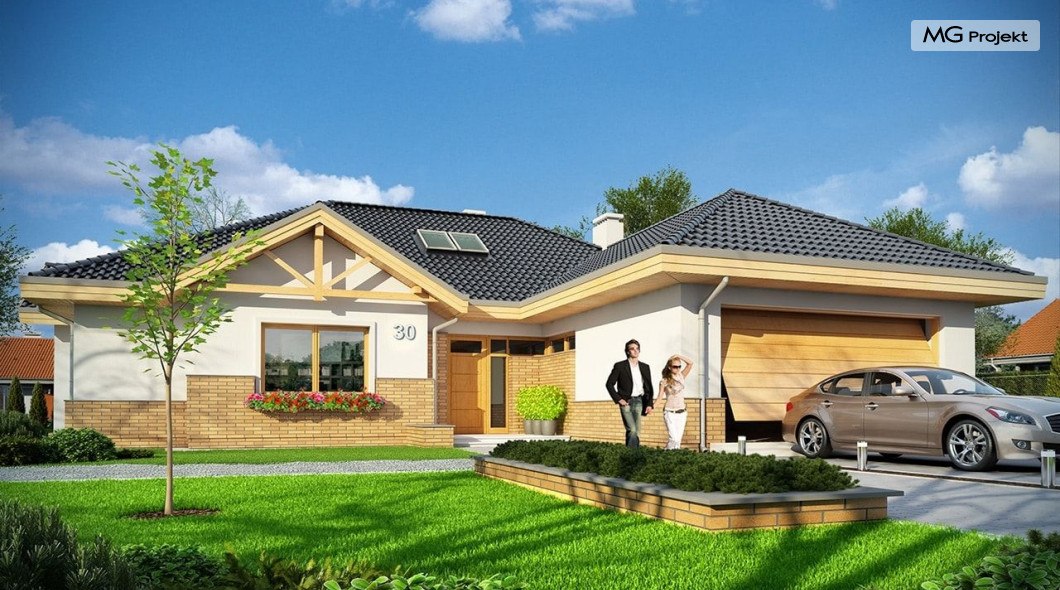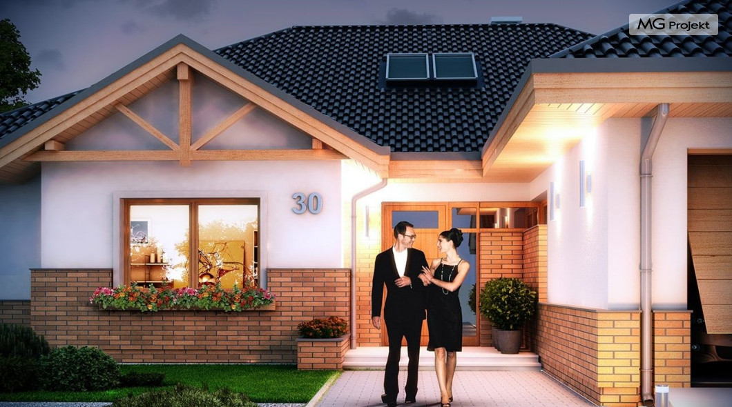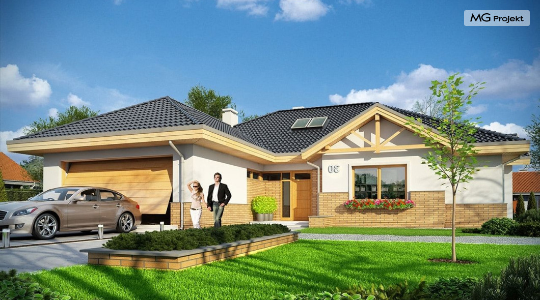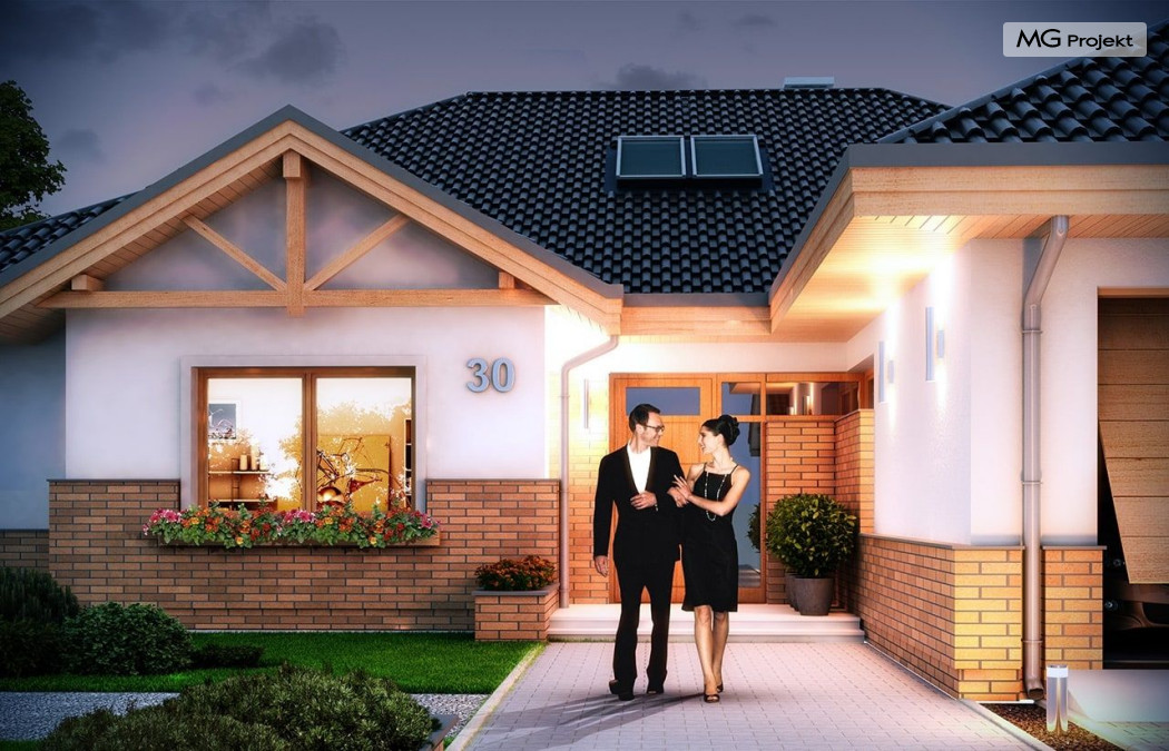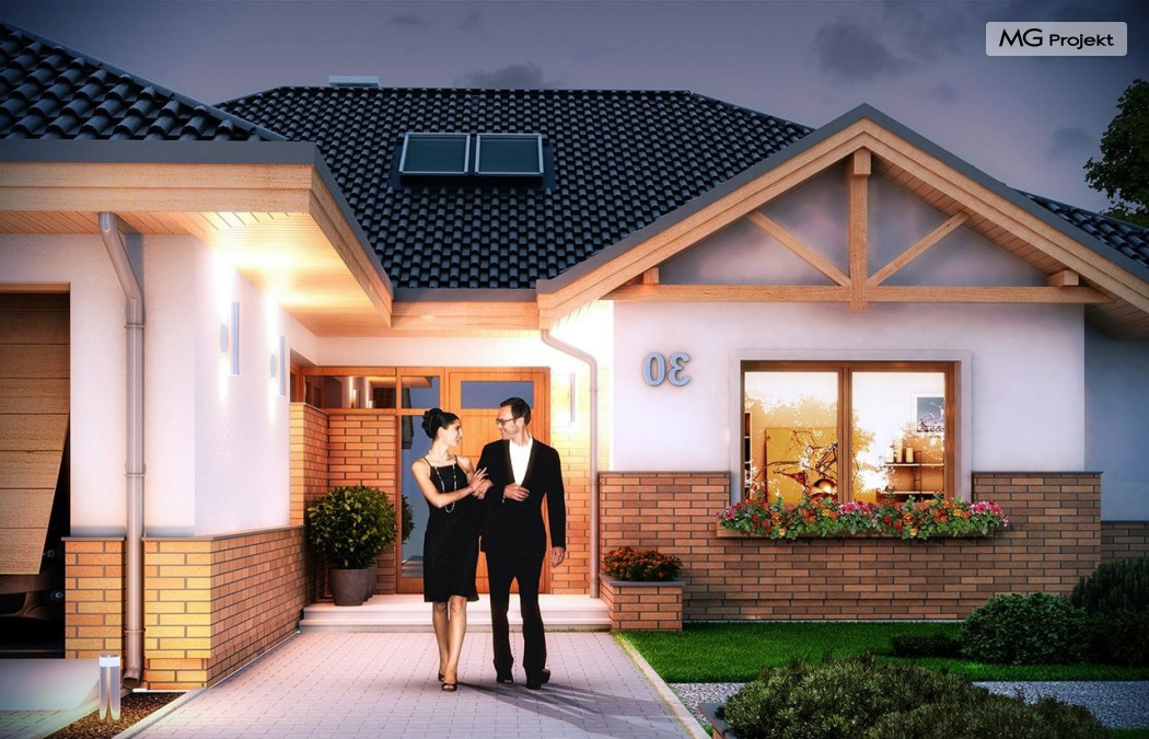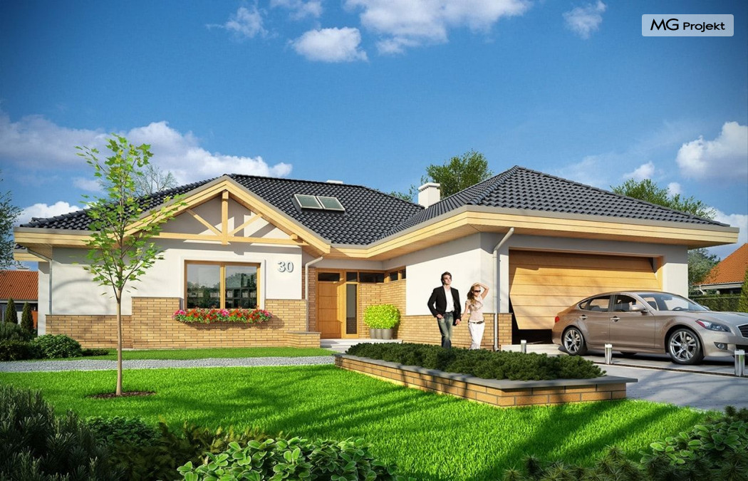 Projekt domu Rozłożysty to fantastyczna komfortowa willa, łącząca w sobie elementy nowoczesności i tradycyjnej formy. Dom jednorodzinny przeznaczony dla 4-5 osobowej rodziny. Parterowy układ funkcjonalny, gdzie wszystkie pomieszczenia dostępne są z jednego poziomu, rozczłonkowana bryła przykryta łagodnymi dachami, część dzienna z wysokimi sufitami sięgającymi dachu, bliskość wnętrza z otaczającym ogrodem - to wszystko powoduje, że dom będzie wspaniałym miejscem do życia. Każda elewacja jest ciekawa i oryginalna. Front domu, z wykuszem zakończonym daszkiem, oraz mini-dziedzińcem wejściowym, z eleganckimi drzwiami z naświetlem. Elewacja ogrodowa z pięknym zadaszonym tarasem i przeszkleniami salonu. Nawet elewacje boczne – z dodatkowymi wykuszami są interesujące. W elewacjach zastosowano tradycyjne elementy z użyciem współczesnych detali. Dom Rozłożysty ma solidny wygląd, a jednocześnie jest bardzo świeży i nowoczesny. Budynek doskonale wpasuje się w niemal każdy teren - najlepiej będzie wyglądał na większej działce, w otoczeniu rzadszej zabudowy. Projekt domu Rozłożysty obejmuje – na parterze: część dzienną – z salonem, jadalnią, kuchnią i holem, część nocną – z czterema pokojami, oraz część gospodarczą - z garażem i kotłownią. Prócz tego można dowolnie wykorzystać przestrzeń strychu - jako zamknięty magazyn, lub jako otwartą na salon antresolę (na przykład pokój sportowy, czy hobby). Fenomenalną przestrzeń dzienną, z pustką nad salonem i kuchnią zobaczyć można na naszych wizualizacjach wnętrz. Budynek przez rozległy plan i spory dach nie będzie z pewnością najtańszy w realizacji, ale na pewno wart jest szaleństwa. Szczególnie jeśli już mieszkało się wcześniej w domu i spędziło pół życia biegając po schodach i nie wykorzystując w pełni wyższych kondygnacji. Zastosowane energooszczędne materiały, izolacje i instalacje sprawią, że dom nie będzie drogi w utrzymaniu. Pracownia posiada odbicie lustrzane projektu domu Rozłożysty oraz wersję o większej powierzchni 182.75 m2 ze zmienionym układem pomieszczeń (projekt domu Rozłożysty 2).