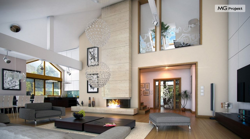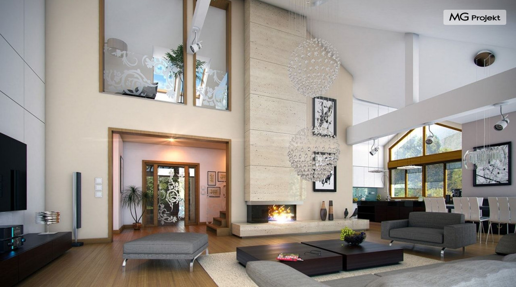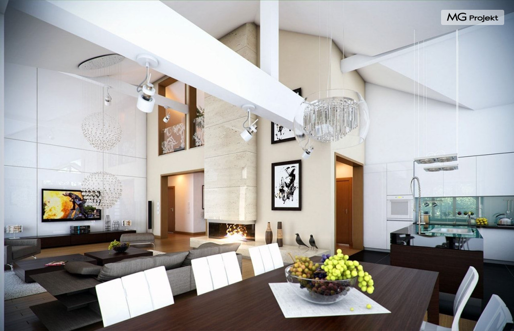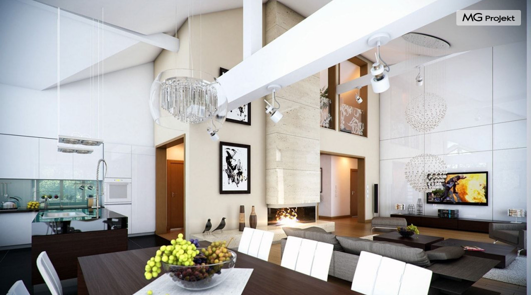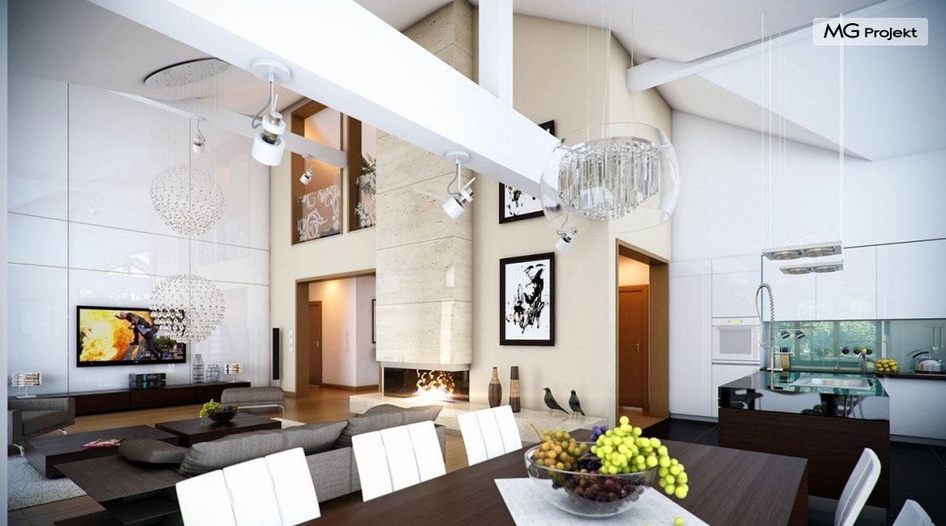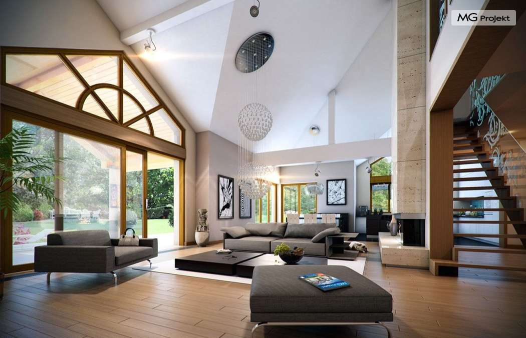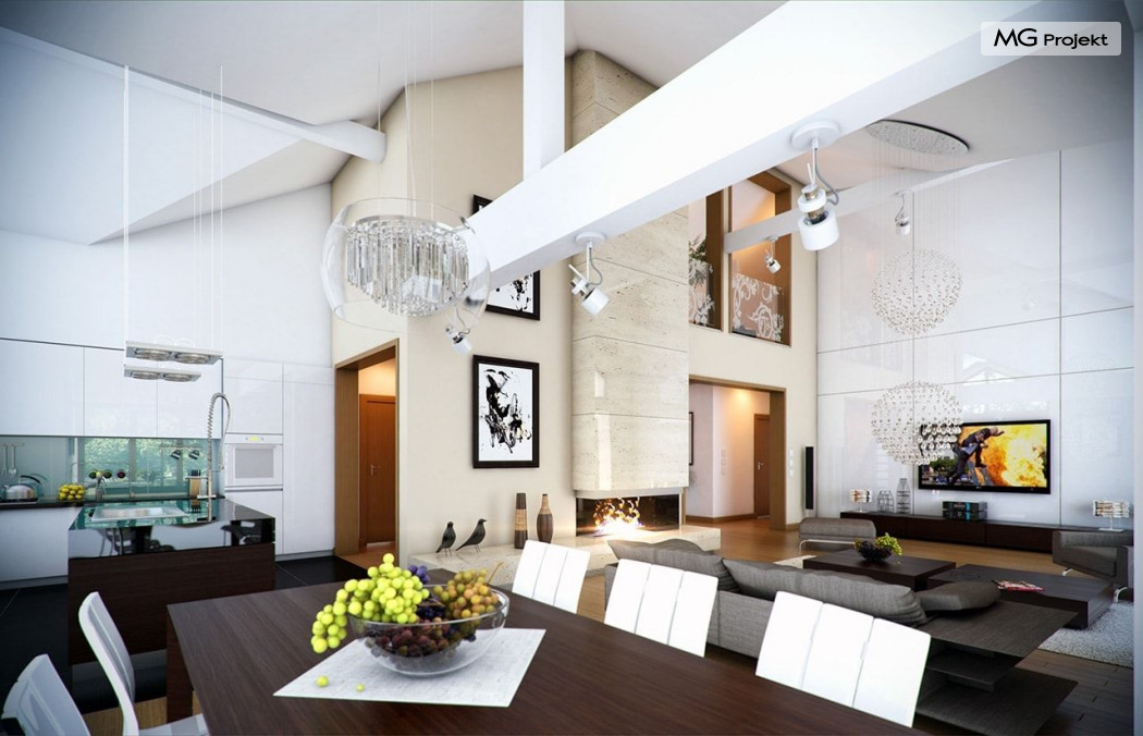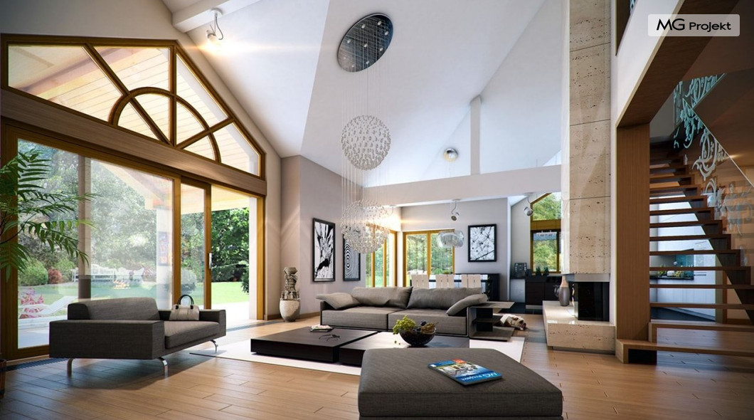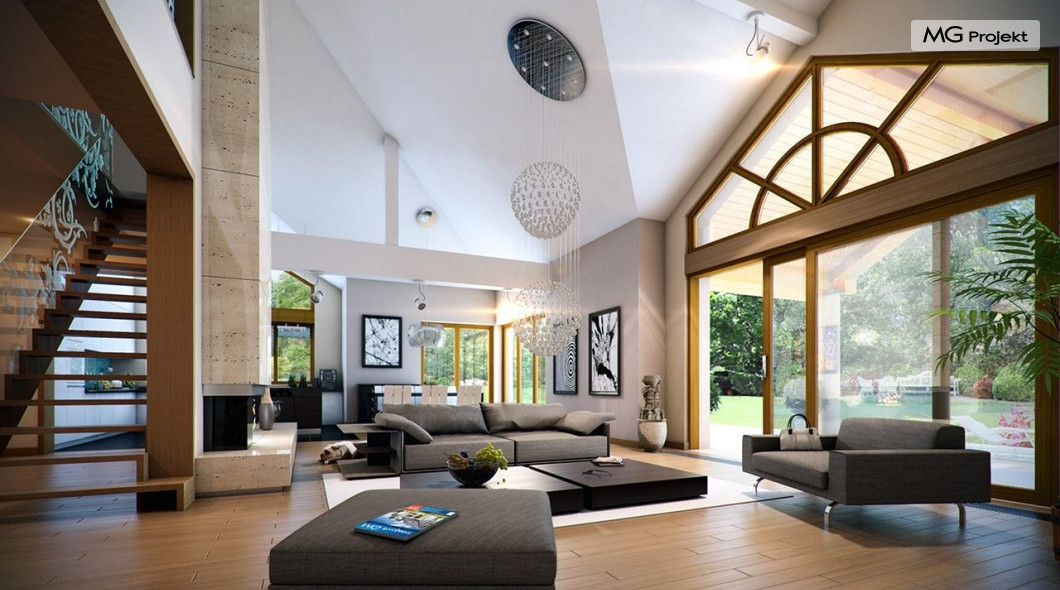 Projekt domu Rozłożysty to fantastyczna komfortowa willa, łącząca w sobie elementy nowoczesności i tradycyjnej formy. Dom jednorodzinny przeznaczony dla 4-5 osobowej rodziny. Parterowy układ funkcjonalny, gdzie wszystkie pomieszczenia dostępne są z jednego poziomu, rozczłonkowana bryła przykryta łagodnymi dachami, część dzienna z wysokimi sufitami sięgającymi dachu, bliskość wnętrza z otaczającym ogrodem - to wszystko powoduje, że dom będzie wspaniałym miejscem do życia. Każda elewacja jest ciekawa i oryginalna. Front domu, z wykuszem zakończonym daszkiem, oraz mini-dziedzińcem wejściowym, z eleganckimi drzwiami z naświetlem. Elewacja ogrodowa z pięknym zadaszonym tarasem i przeszkleniami salonu. Nawet elewacje boczne – z dodatkowymi wykuszami są interesujące. W elewacjach zastosowano tradycyjne elementy z użyciem współczesnych detali. Dom Rozłożysty ma solidny wygląd, a jednocześnie jest bardzo świeży i nowoczesny. Budynek doskonale wpasuje się w niemal każdy teren - najlepiej będzie wyglądał na większej działce, w otoczeniu rzadszej zabudowy. Projekt domu Rozłożysty obejmuje – na parterze: część dzienną – z salonem, jadalnią, kuchnią i holem, część nocną – z czterema pokojami, oraz część gospodarczą - z garażem i kotłownią. Prócz tego można dowolnie wykorzystać przestrzeń strychu - jako zamknięty magazyn, lub jako otwartą na salon antresolę (na przykład pokój sportowy, czy hobby). Fenomenalną przestrzeń dzienną, z pustką nad salonem i kuchnią zobaczyć można na naszych wizualizacjach wnętrz. Budynek przez rozległy plan i spory dach nie będzie z pewnością najtańszy w realizacji, ale na pewno wart jest szaleństwa. Szczególnie jeśli już mieszkało się wcześniej w domu i spędziło pół życia biegając po schodach i nie wykorzystując w pełni wyższych kondygnacji. Zastosowane energooszczędne materiały, izolacje i instalacje sprawią, że dom nie będzie drogi w utrzymaniu. Pracownia posiada odbicie lustrzane projektu domu Rozłożysty oraz wersję o większej powierzchni 182.75 m2 ze zmienionym układem pomieszczeń (projekt domu Rozłożysty 2).