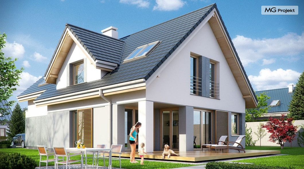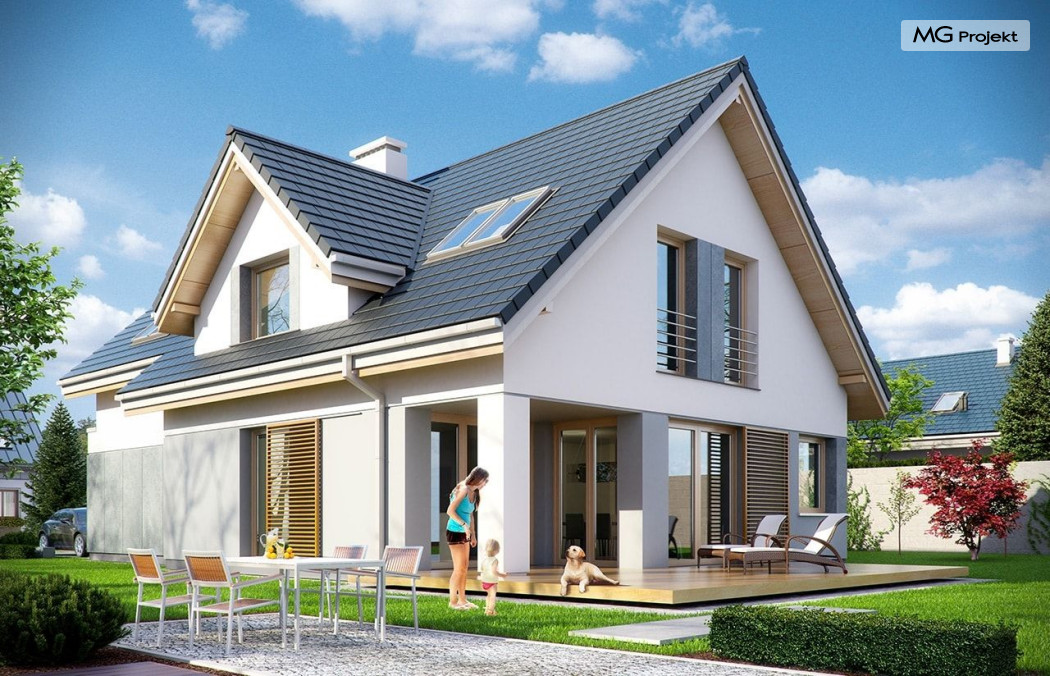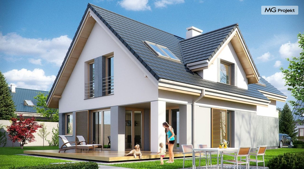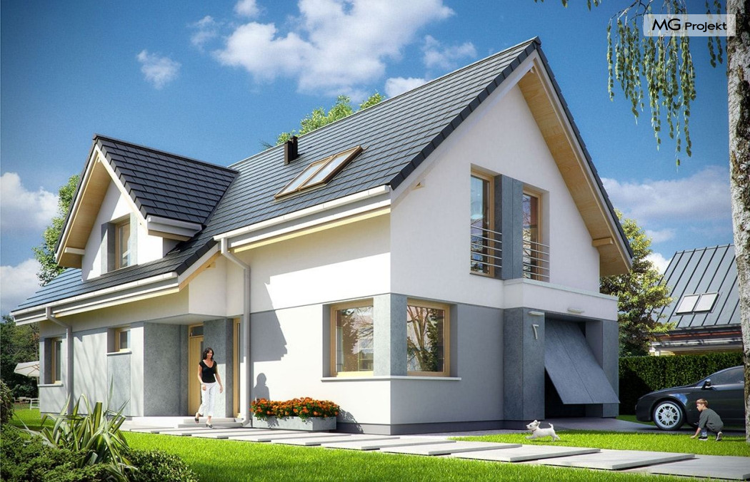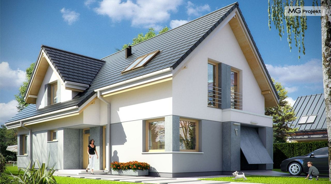 Projekt domu Rozsądny to dom jednorodzinny dla rodziny 4-5 osobowej, z gabinetem na parterze, który może służyć jako firmowe biuro (łatwo jest zapewnić osobne wejście z przedsionka, przesuwając łazienkę). Budynek zaprojektowano jako podłużny prostokąt, przykryty dwuspadowym dachem. Domek Rozsądny, dzięki niedużej szerokości frontu, może być posadowiony na wąskiej działce. Nowoczesna architektura, łączy w sobie prostotę geometrii budynku, z zastosowanymi ciekawymi materiałami i kolorystyką. Właściwe proporcje domu zostały dodatkowo podkreślone oddzieleniem pasa ścian parteru, od ścian szczytowych, kolankowych i samego dachu. Bryła zewnętrzna jest spokojna i uporządkowana. Ma jednocześnie nowoczesny sznyt. Wnętrze domu Rozsądny dzieli się na część dzienną i techniczną na parterze, oraz sypialnie na poddaszu. Na parterze zaprojektowano jednoprzestrzenne wnętrze połączonego salonu, jadalni, holu i kuchni. Wszystkie te pomieszczenia mają – dzięki dużym przeszkleniom - piękną ekspozycję na ogród. Na lewo od wejścia mieszczą się: garaż, kotłownia, oraz gabinet z łazienką. Gabiet może być dostępny z holu, a można go też przystosować jako miejsce prowadzenia domowego biznesu (biuro, gabinet lekarski). Na poddaszu, dzięki wysokim ścianom kolankowym, udało się zmieścić cztery wygodne sypialnie, piękną łazienkę i garderobę. Dwa pokoje nad garażem i gabinetem można łatwo inaczej podzielić – na przykład zaprojektować tam apartament rodziców z dodatkową łazienką i garderobą. Prosta bryła i konstrukcja budynku pozwoli ograniczyć koszty budowy. Dobre materiały izolacyjne z kolei i właściwa proporcja powierzchni do kubatury pomogą zminimalizować wydatki na późniejsze utrzymanie domu. Projekt domu Rozsądny to właściwy projekt dla rozsądnych :) Inwestorów, którzy chcą wycisnąć z wydanych na budowę pieniędzy maksymalnie jak najwięcej pożytku. Pracownia posiada odbicie lustrzane projektu.