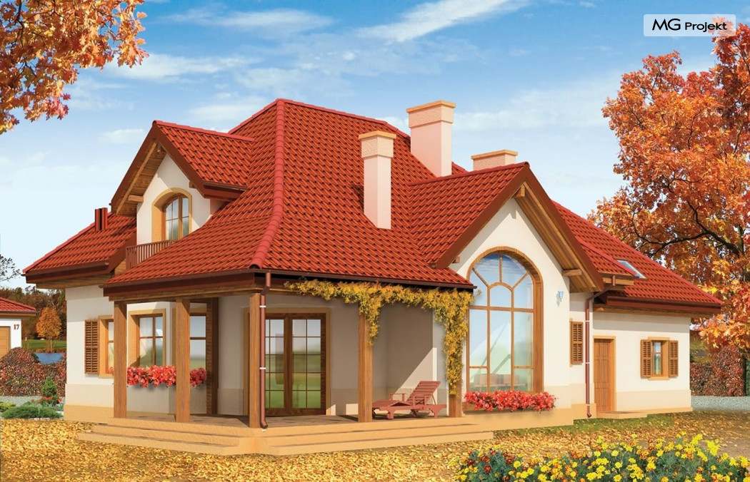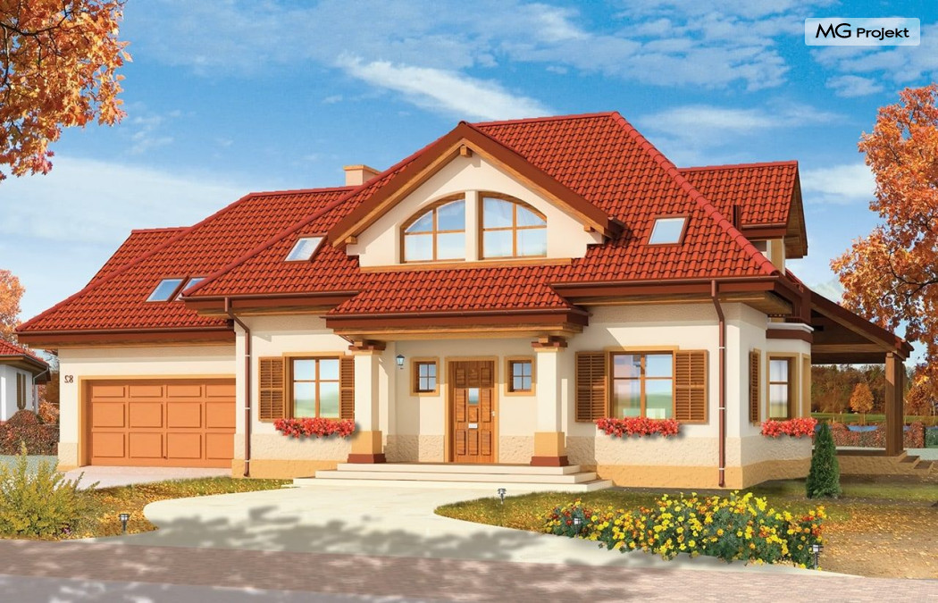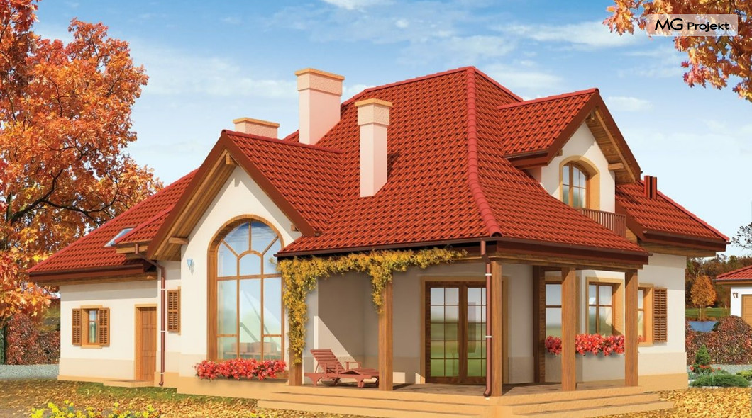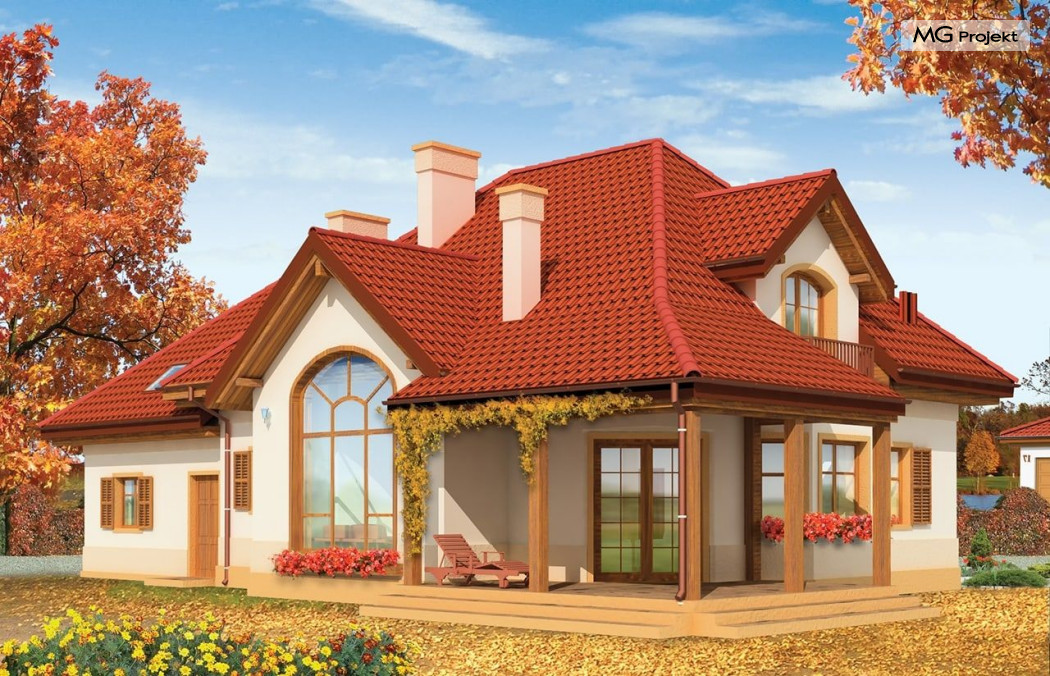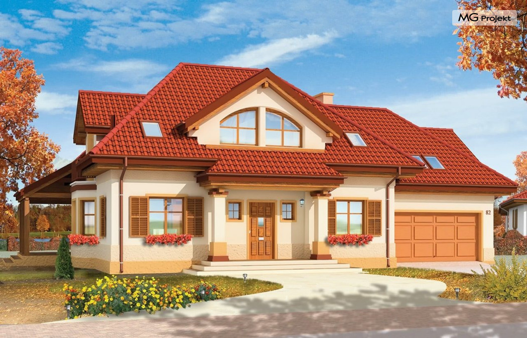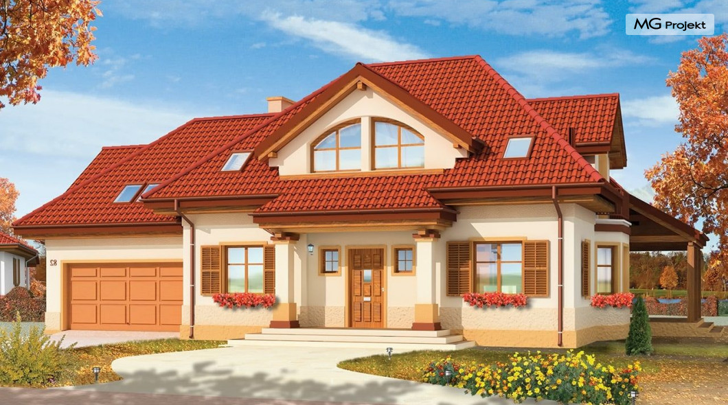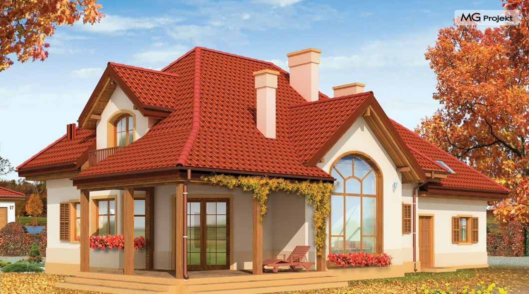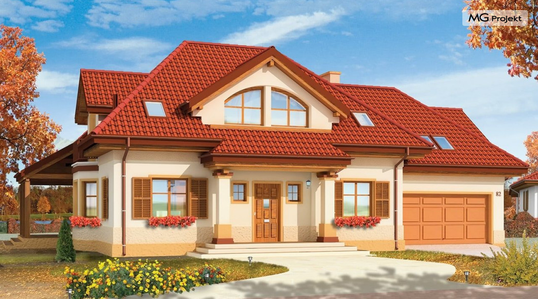 Projekt domu Rubin to przestronny dom dla 4-6 osobowej rodziny, o nietuzinkowej architekturze i ciekawym wnętrzu. Projekt posiada nietypowe rozwiązania, jak duże okno w salonie z otwarciem przestrzennym na antresolę na poddaszu, czy narożny zadaszony podcień z tarasem. Te detale dodają projektowi oryginalnego wyrazu. Wnętrze domu jest przemyślane i jednocześnie maksymalnie funkcjonalne. Na parterze oprócz dużej otwartej przestrzeni dziennej zaprojektowano dodatkowy pokój, natomiast na poddaszu zmieszczono aż pięć pokoi i dużą łazienkę. Pracownia MGProjekt posiada też projekt domu Rubin w odbiciu lustrzanym i inne jego wersje: podstawowy projekt domu Rubin, projekt domu Rubin 2 oraz projekt domu Rubin 3.