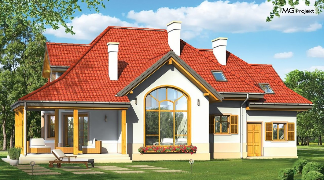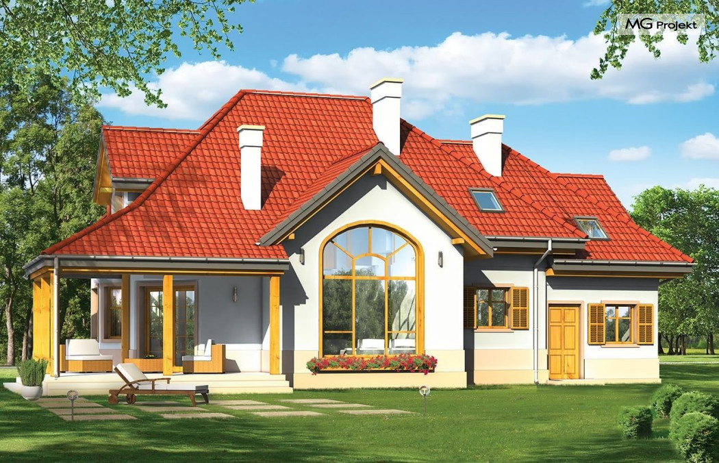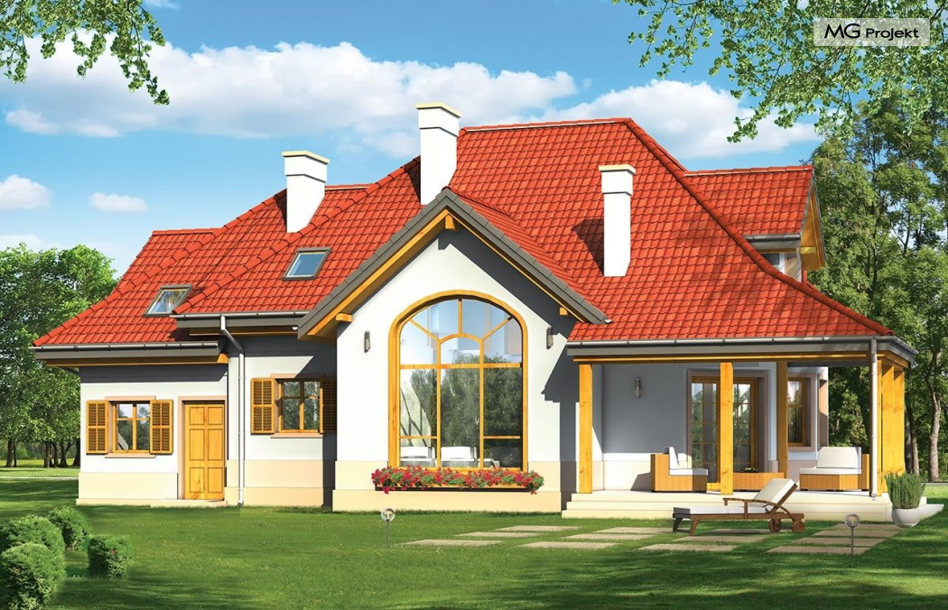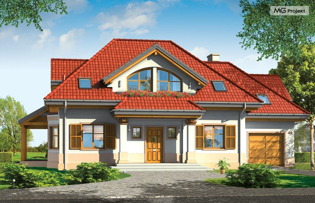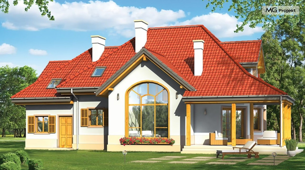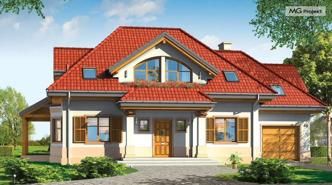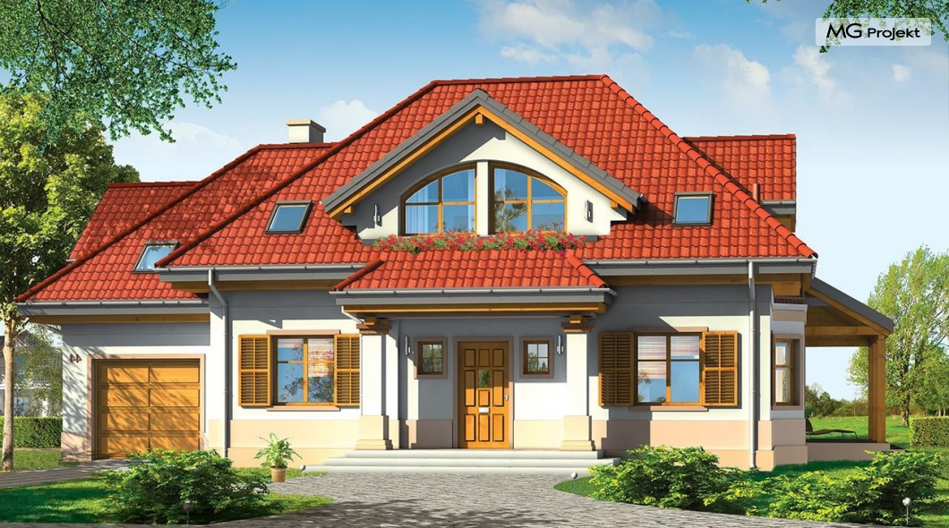 Projekt domu Rubin 2 to wariantowa wersja popularnego projektu Rubin - tym razem zmniejszona, z jednostanowiskowym garażem. Projekt domu przeznaczony jest dla cztero-pięcioosobowej rodziny. Parterowa bryła z poddaszem użytkowym, składa się z części mieszkalnej i dobudowanego z boku garażu. Całość przekryta jest wielospadowym dachem, z dużymi lukarnami na każdej elewacji. Spokojna podmiejska architektura domu, z ciekawymi detalami, jak wykusze, ganki z kolumnami, czy łukowe okna, łączy się z funkcjonalnie zaprojektowanym wnętrzem budynku. Szczególną atrakcją bryły jest duża lukarna frontowa z gankiem wejściowym i kolumnami, duży podcień ogrodowy, gdzie pod zadaszeniem można schronić się przed deszczem lub upalnym słońcem, oraz wielkie dwukondygnacyjne okno salonu, otwierające wnętrze na ogród. Wnętrze parteru to przede wszystkim otwarta przestrzeń dzienna, z salonem, jadalnią i holem. Salon częściowo otwarty jest na antresolę poddasza, dzięki czemu domownicy będą mogli cieszyć się zwiększoną przestrzenią pokoju dziennego. Na parterze zaplanowano też kuchnię, dodatkowy pokój - gabinet lub na przykład sypialnię gościnną, oraz kotłownię i garaż z zapleczem ogrodowym. W projekcie domu Rubin 2, na poddaszu zmieszczono cztery sypialnie z garderobami i szafami wbudowanymi, dużą łazienkę i pralnię-suszarnię. Z holu - antresoli na poddaszu otwiera się przez wysokie okno imponujący widok na salon pod spodem i ogród. Pracownia MGProjekt posiada też projekt domu Rubin w odbiciu lustrzanym i inne jego wersje: podstawowy projekt domu Rubin, projekt domu Rubin 2 oraz projekt domu Rubin 3.