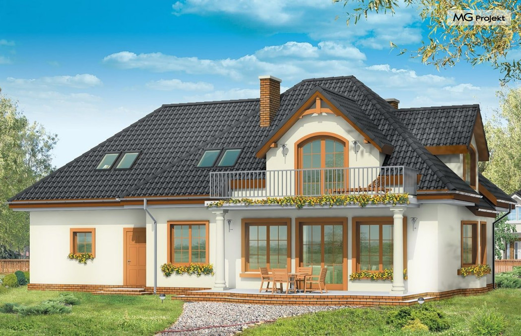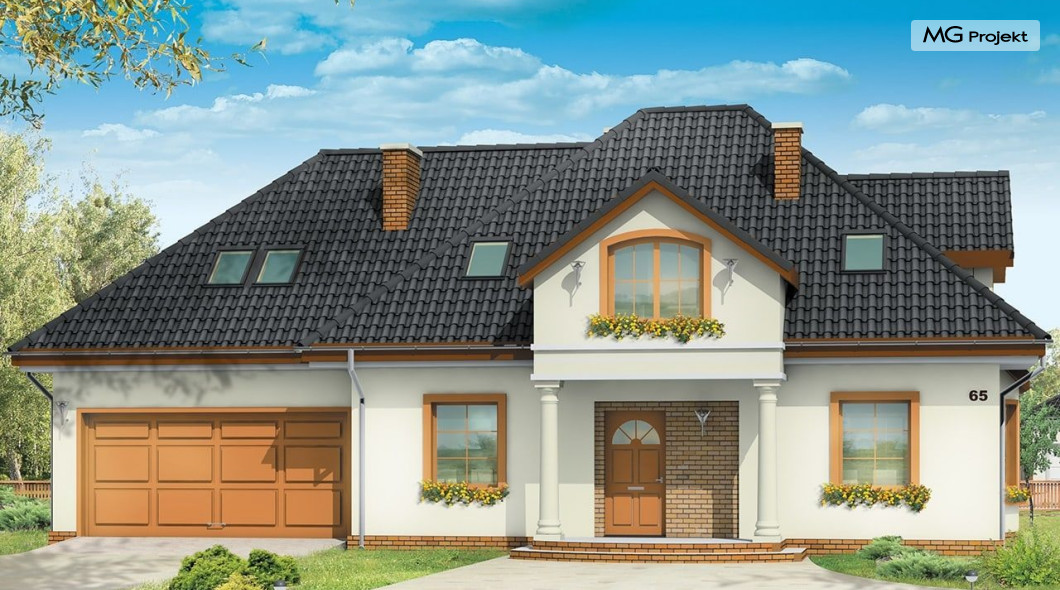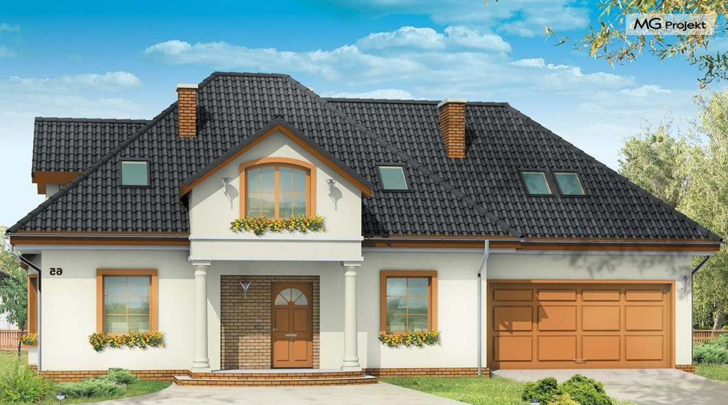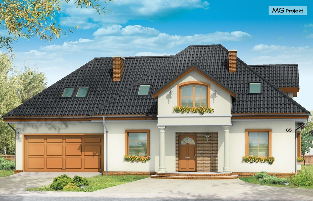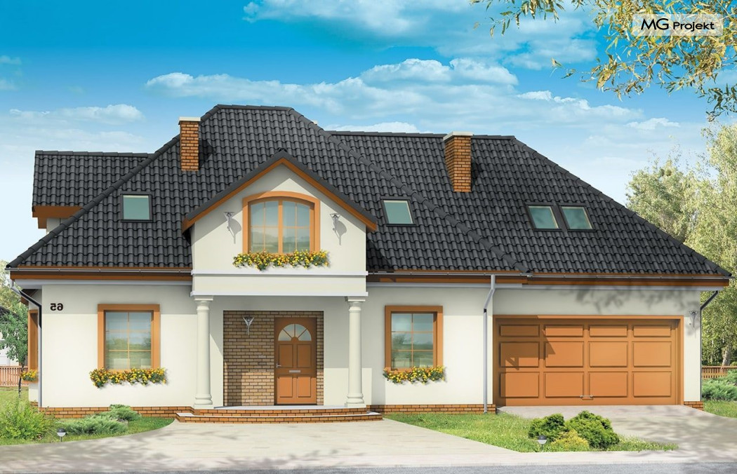 Projekt domu Saga 3, to odpowiedź naszej pracowni na życzenie wielu naszych Klientów, którzy chcieli widzieć ten domek z dwustanowiskowym garażem. Projekt domu Saga cieszy się dużą popularnością, nie mniej jednak część osób rezygnowało z niego ze względu na pojedynczy garaż. Teraz możecie Państwo wybierać między projektami Sagą z pojedynczym i podwójnym garażem. Dom ma bardzo zgrabną bryłę, główna część budynku przekryta jest czterospadowym dachem, z eleganckim frontonem wspartym na kolumnach wejściowych, oraz pięknym balkonem i lukarną od strony ogrodu. Dobudowany szerszy garaż wpływa korzystnie na proporcje domu - Saga 3 wygląda wręcz bardziej dostojnie w tej wersji. Wnętrze w projekcie nie uległo zmianie - na parterze znajduje się jednoprzestrzenny salon, połączony z holem, jadalnią i częściowo z kuchnią. Na parterze zaprojektowano dodatkowy pokój, łazienkę i kotłownię. W projekcie, za podwójnym garażem znajduje się pomieszczenie gospodarcze. Na poddaszudomu, dzięki powiększeniu przestrzeni nad garażem zmieściły się cztery pokoje z łazienką, garderobami i dodatkowo stryszkiem. Pracownia dysponuje odbiciem lustrzanym projektu domu Saga oraz inne wersje: projekt domu Saga projekt domu Saga 2, projekt domu Saga 3.