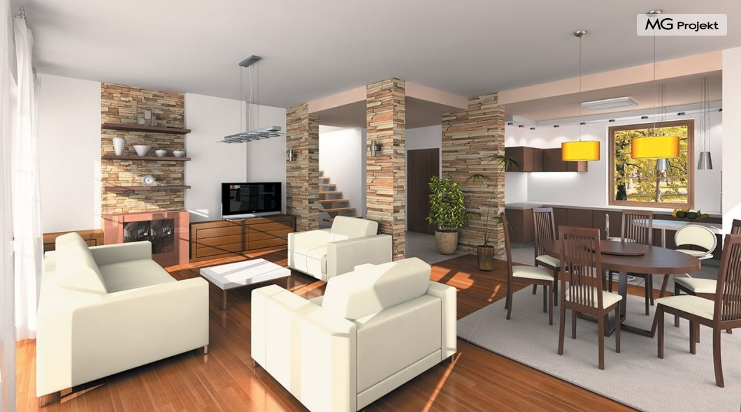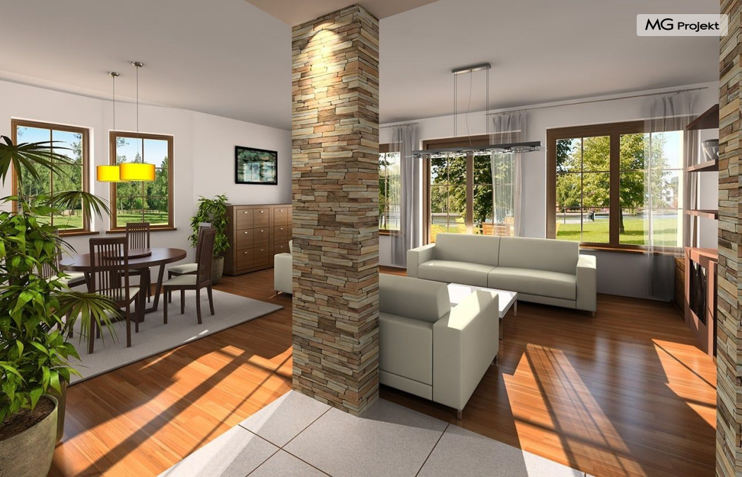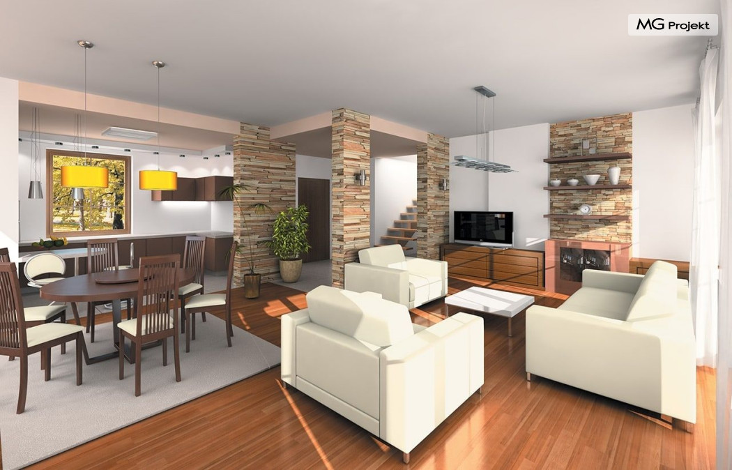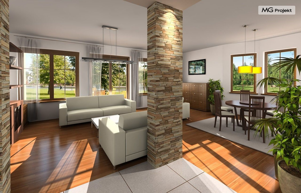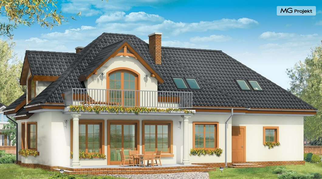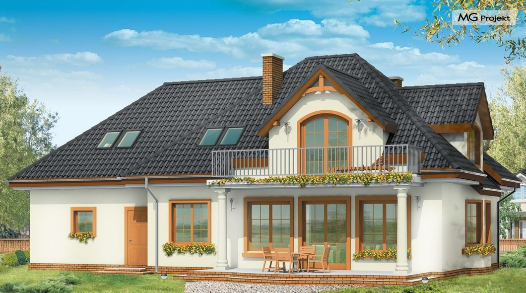 Projekt domu Saga 3, to odpowiedź naszej pracowni na życzenie wielu naszych Klientów, którzy chcieli widzieć ten domek z dwustanowiskowym garażem. Projekt domu Saga cieszy się dużą popularnością, nie mniej jednak część osób rezygnowało z niego ze względu na pojedynczy garaż. Teraz możecie Państwo wybierać między projektami Sagą z pojedynczym i podwójnym garażem. Dom ma bardzo zgrabną bryłę, główna część budynku przekryta jest czterospadowym dachem, z eleganckim frontonem wspartym na kolumnach wejściowych, oraz pięknym balkonem i lukarną od strony ogrodu. Dobudowany szerszy garaż wpływa korzystnie na proporcje domu - Saga 3 wygląda wręcz bardziej dostojnie w tej wersji. Wnętrze w projekcie nie uległo zmianie - na parterze znajduje się jednoprzestrzenny salon, połączony z holem, jadalnią i częściowo z kuchnią. Na parterze zaprojektowano dodatkowy pokój, łazienkę i kotłownię. W projekcie, za podwójnym garażem znajduje się pomieszczenie gospodarcze. Na poddaszudomu, dzięki powiększeniu przestrzeni nad garażem zmieściły się cztery pokoje z łazienką, garderobami i dodatkowo stryszkiem. Pracownia dysponuje odbiciem lustrzanym projektu domu Saga oraz inne wersje: projekt domu Saga projekt domu Saga 2, projekt domu Saga 3.