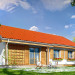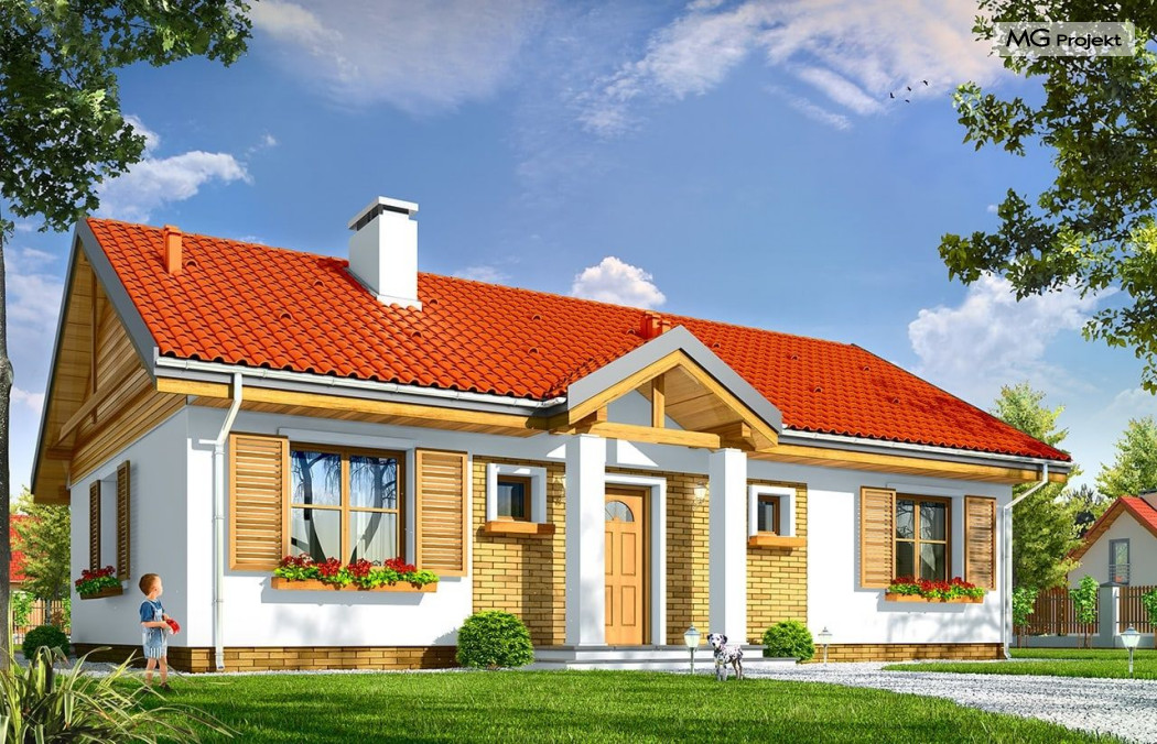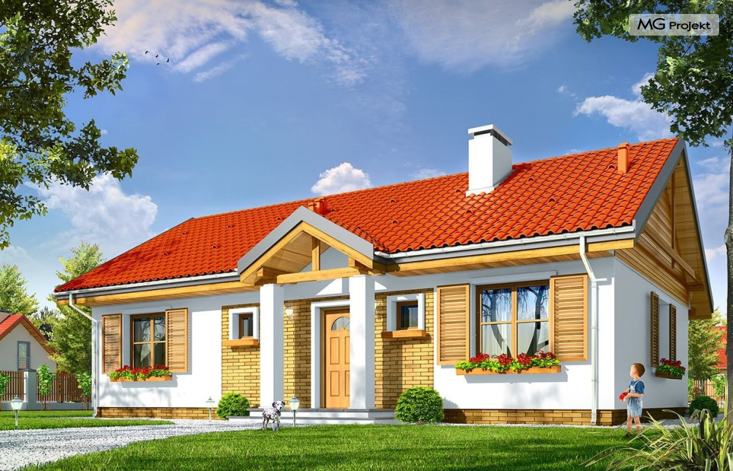 Projekt domu Słoneczny 2 jest kolejną wersją popularnego projektu Słoneczny - parterowego domu dla czteroosobowej rodziny. Projekt domu Słoneczny 2 ma : podwyższony kąt nachylenia dachu, drewniany strop nad parterem zamiast wiązarów (dzięki czemu można zagospodarować strych), jest lepiej izolowany, oraz ma większą kotłownię, w której swobodnie można zainstalować dowolny rodzaj kotła ( również na paliwo stałe). Projekt domu Słoneczny 2 jest prosty i niedrogi w budowie. Można go z powodzeniem realizować metodą gospodarczą, przy udziale własnej pracy i inwencji. Nie ma tu zbędnych kosztownych rozwiązań, każdy element budynku przemyślany jest pod względem funkcjonalnym i ekonomicznym. Bezpretensjonalna architektura domu wpasuje się doskonale w każde otoczenie. Czytelna prostokątna bryła, przekryta dwuspadowym dachem ozdobiona jest od frontu gankiem z kolumienkami, od tyłu zaś praktycznym zadaszeniem tarasu. Okładziny z płytek klinkierowych na ścianach, okiennice - wszystkie te elementy ozdabiają dom i podkreślają jego urodę. Wnętrze Słonecznego 2 podzielono na część dzienną - z salonem, holem i kuchnią, oraz na część z sypialniami i łazienką. Wygodny salon z kącikiem jadalnym, ścianą telewizyjną, kominkiem i ładnymi przeszklonymi drzwiami na taras i ogród, łączy się przestrzennie z holem i wygodną kuchnią. W przedsionku mieści się szafa ubraniowa - z sieni przechodzimy do sporej kotłowni. Każda z dwóch sypialni dziecięcych posiada szafy wnękowe, w sypialni rodziców znajdziemy garderobę. Projekt domu Słoneczny 2 mimo niewielkiej powierzchni jest bardzo funkcjonalny. Praktycznie przewidziano w nim wszystko, czego potrzebuje czteroosobowa rodzina. Dom jest łatwy i niedrogi w realizacji, a dzięki zastosowaniu energooszczędnych rozwiązań - tani w późniejszej eksploatacji. Pracownia posiada odbicie lustrzane projektu a także inne projekty tej serii: projekt domu Słoneczny, projekt domu Słoneczny z garażem, projekt domu Słoneczny z garażem 2, projekt domu Słoneczny z poddaszem.