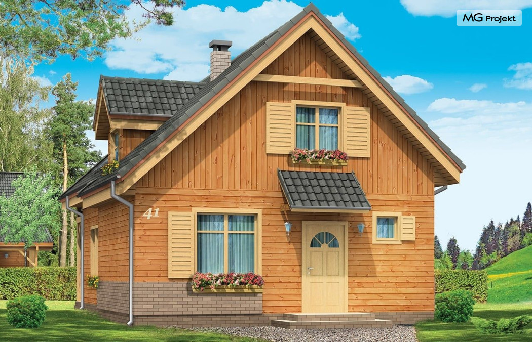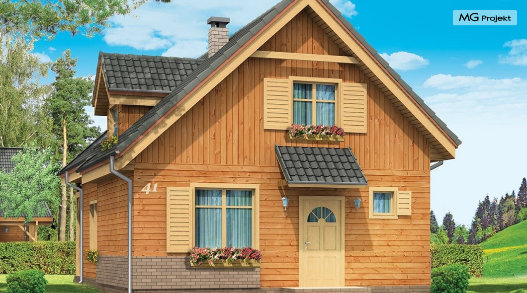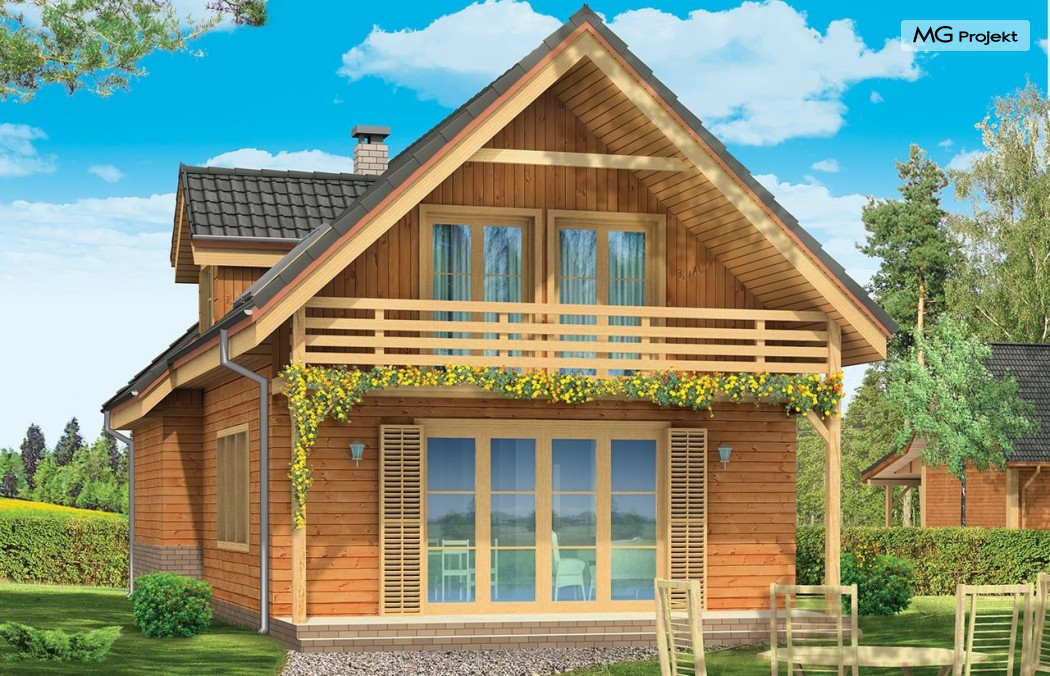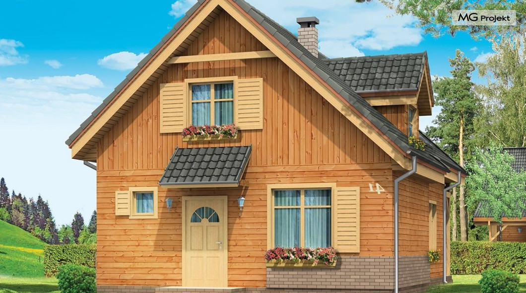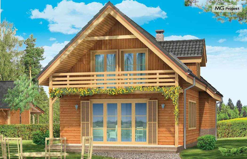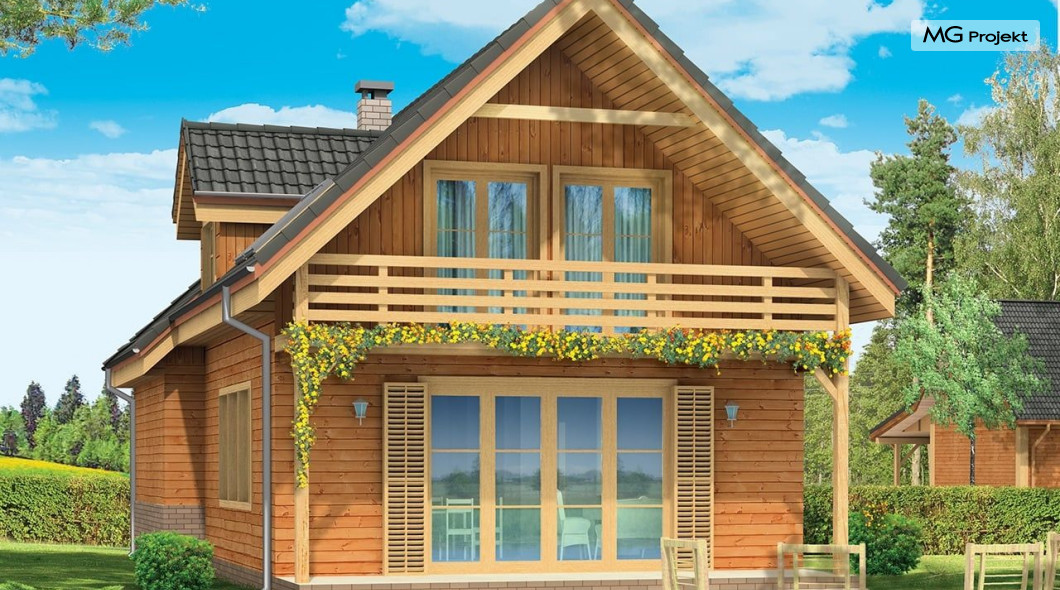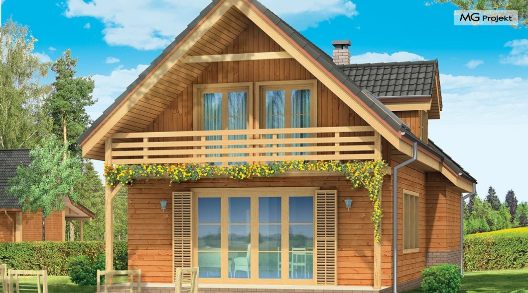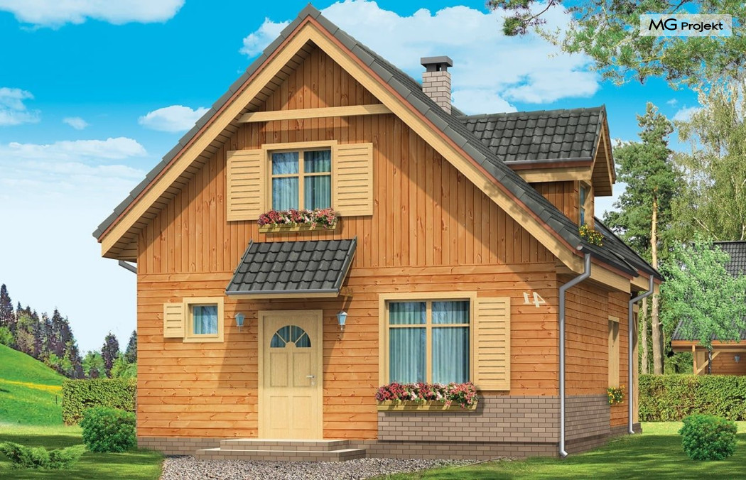 Projekt domu Słowik to parterowy budynek z poddaszem użytkowym. Dom jednorodzinny przeznaczony dla rodziny 4-5cio osobowej, mogący służyć zarówno jako domek jednorodzinny całoroczny jak i letniskowy. Urokliwy, dzięki ciekawym detalom dom ma w rzeczywistości dość prosty układ. Budynek, ze względu na nieskomplikowaną konstrukcję, będzie łatwy w budowie, co odbije się pozytywnie na kosztach inwestycji. Projekt domu Słowik został stworzony w technologii szkieletowej drewnianej. Elewacja domu jest szalowana deskami, ale można również wykonać ją jako tynkową. Domek Słowik dzięki niewielkiej szerokości doskonale wpasuje się również na wąską działkę. Na parterze domu, zaprojektowano jednoprzestrzenną część dzienną, z salonem, holem i częściowo otwartą kuchnią. Z salonu szerokimi drzwiami wychodzimy na częściowo zadaszony taras. W projekcie obok przedsionka umieszczono kotłownię. Na poddaszu znajdują się trzy sypialnie i łazienka. Projekt domu Słowik dostępny jest też w wersji odbicia lustrzanego.