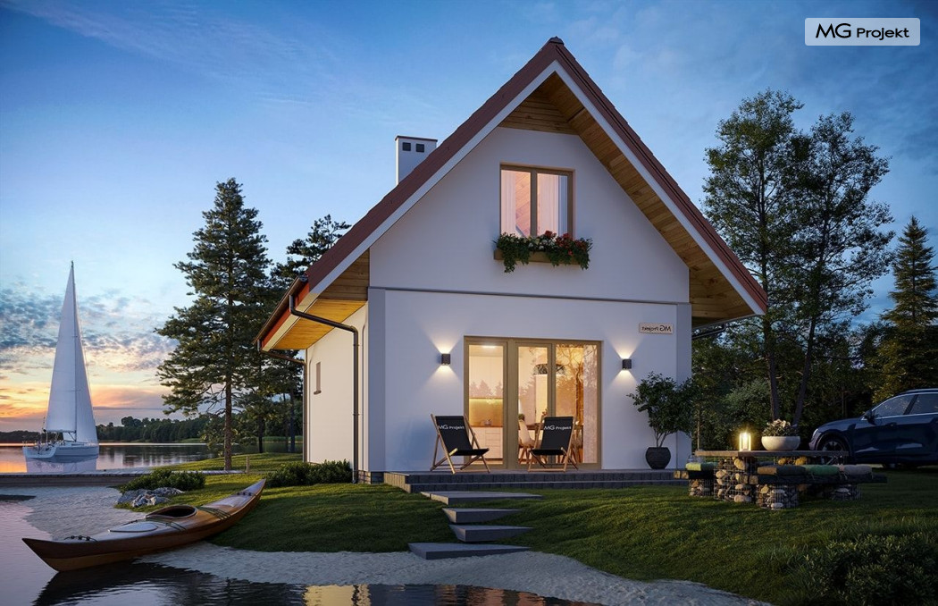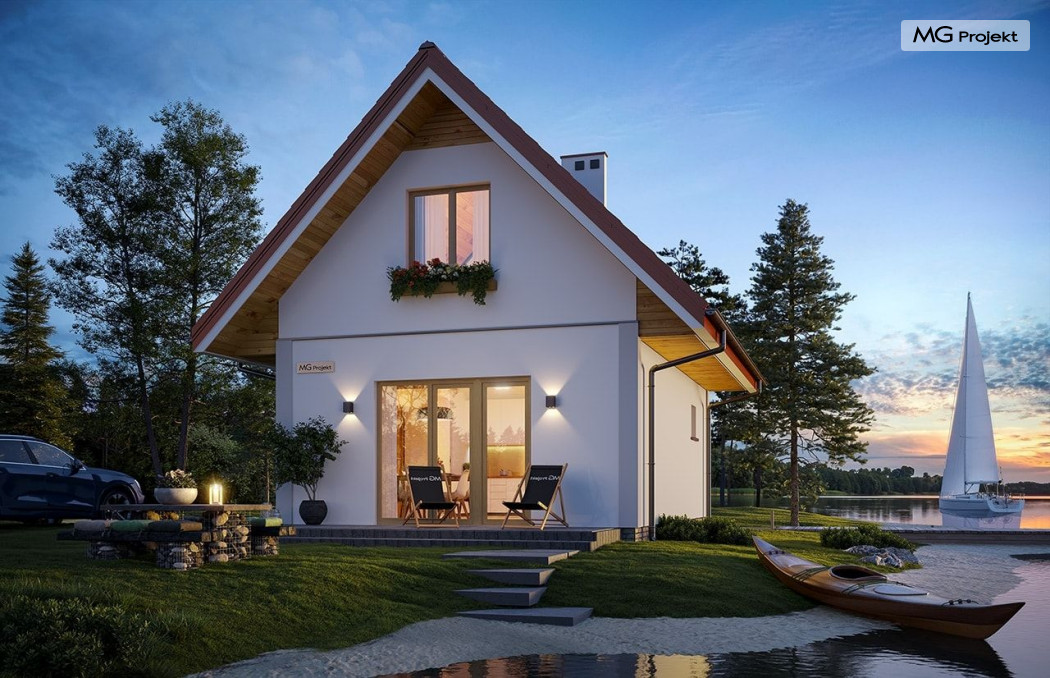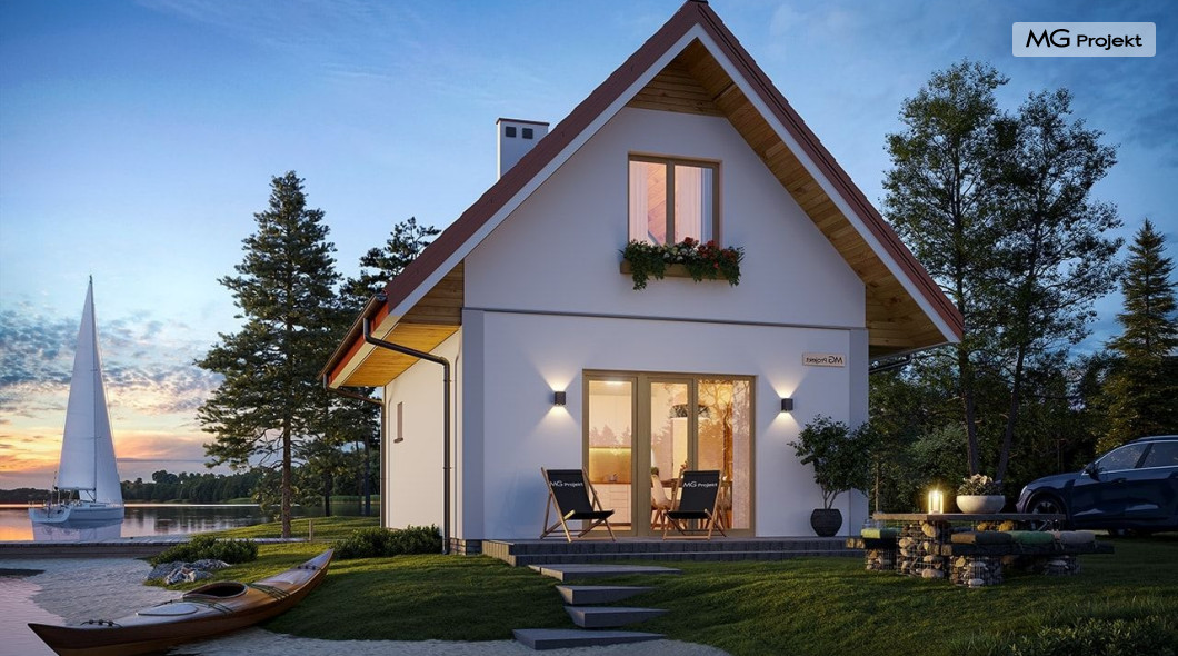 Projekt domu Sosenka to mały, zgrabny domek, mogący pełnić funkcję letniskowego, ale również całorocznego domostwa dla małej rodziny. Jego zaletami są właściwe proporcje, nadające estetyczny wygląd budynku, funkcjonalne wnętrze oraz prosta, tania w budowie konstrukcja.