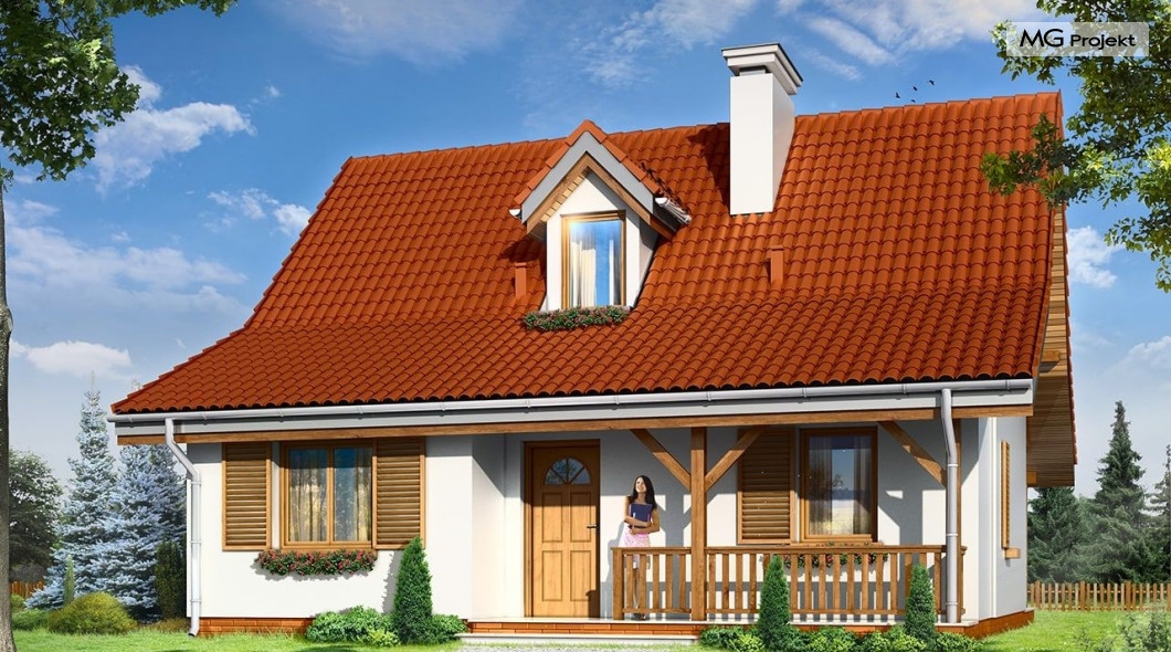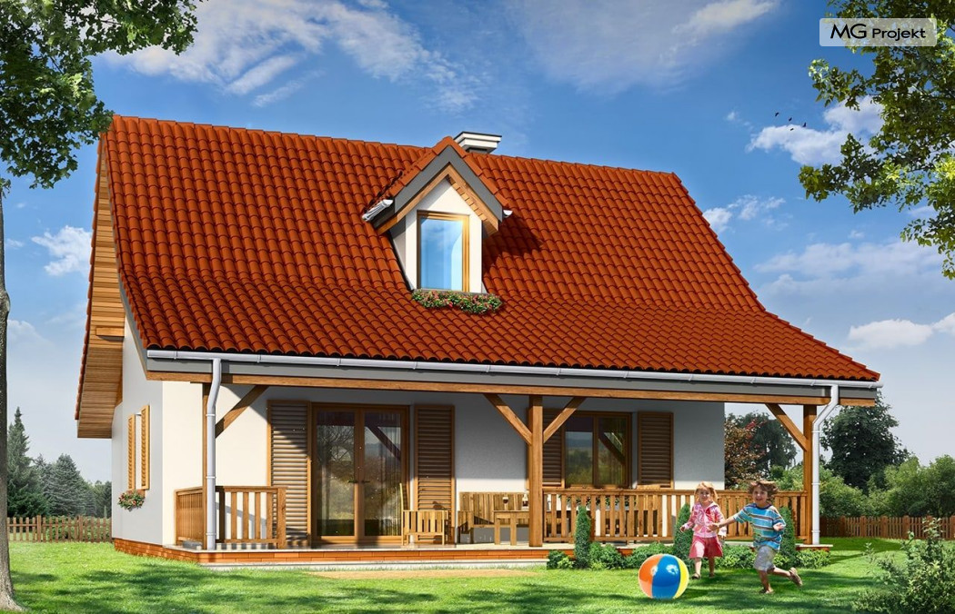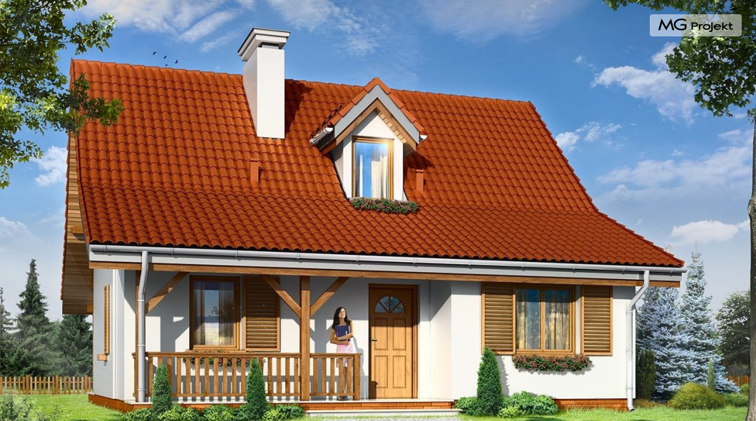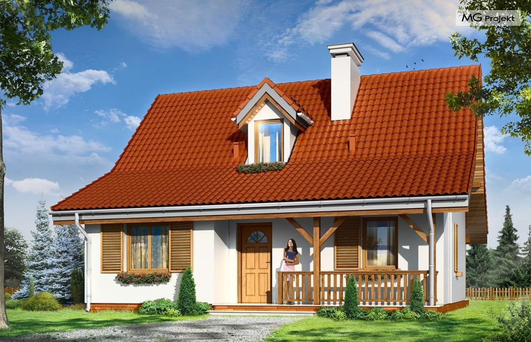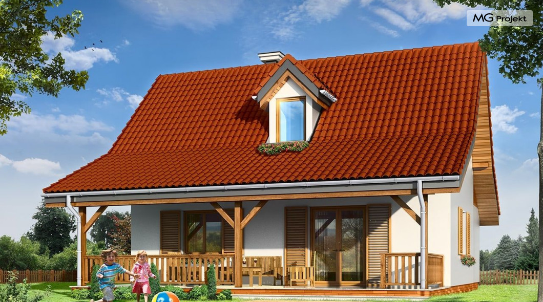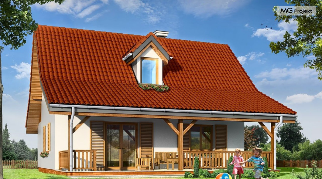 Projekt domu Sosenka 5 to kolejna odsłona projektu z popularnej serii Sosenek z pracowni MG Projekt. Projekt domu Sosenka 5 zaprojektowano dla 3-4 osobowej rodziny, do wykorzystania jako całoroczny dom jednorodzinny. Budynek może też służyć jako letniskowy. Biorąc pod uwagę uzyskaną powierzchnię projekt jest prosty i niedrogi w realizacji. Bryła w projekcie domu Sosenka 5 składa się z zasadniczej części z poddaszem użytkowym, przykrytej dwuspadowym symetrycznym dachem, oraz dwóch dobudówek. Frontowej - mieszczącej pokój na parterze i werandę wejściową, oraz tylnej z dużym zadaszonym tarasem. Zadaszony taras to świetne rozwiązanie powiększające optycznie pokój dzienny. Dach budynku ozdobiono dwiema niewielkimi lukarnami - po jednej na każdej połaci. Wewnątrz, na parterze zaprojektowano przestronny salon z wyeksponowanymi schodami i kominkiem, kuchnię, łazienkę, dodatkowy pokój - na przykład sypialnię dla gości, oraz sień i kotłownię. Na poddaszu zaplanowano dwie sypialnie i toaletę. W domu Sosenka 5 zaprojektowano ogrzewanie centralne z pieca w kotłowni. Pracownia posiada wersję odbicia lustrzanego projektu oraz inne odsłony: tańsza w wykonaniu (projekt domu Sosenka), z tarasem na froncie domu (projekt domu Sosenka 2 ), z innym układem pomieszczeń (projekt domu Sosenka 3), w technologii drewnianej z bocznym tarasem i balkonem (projekt domu Sosenka 4).