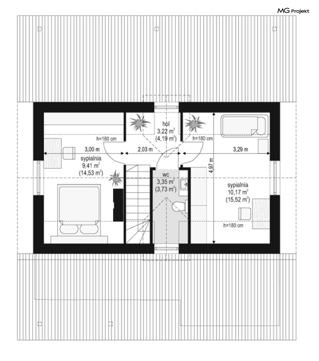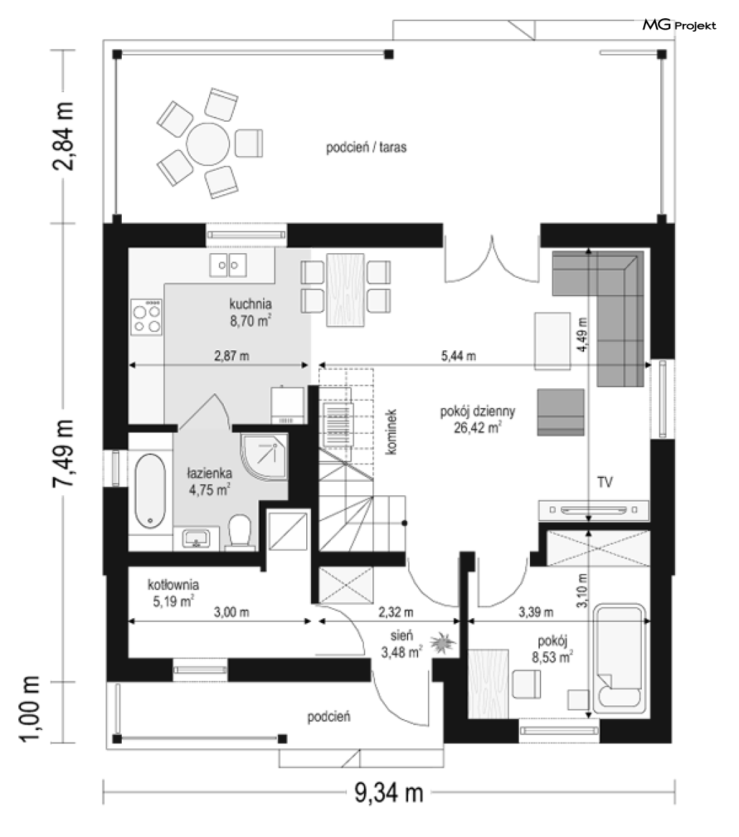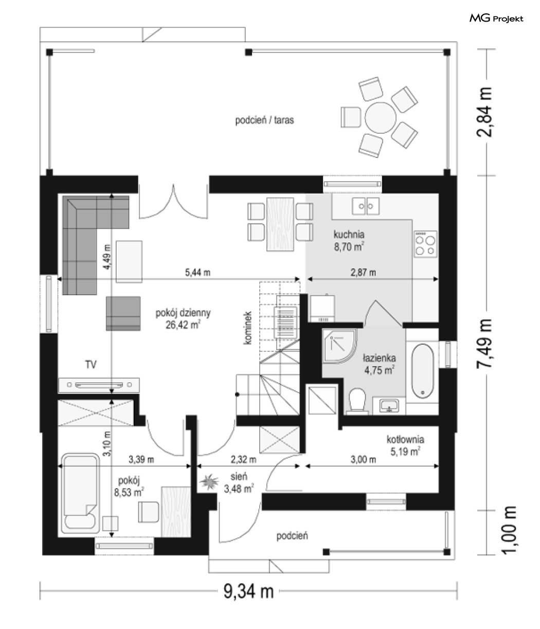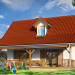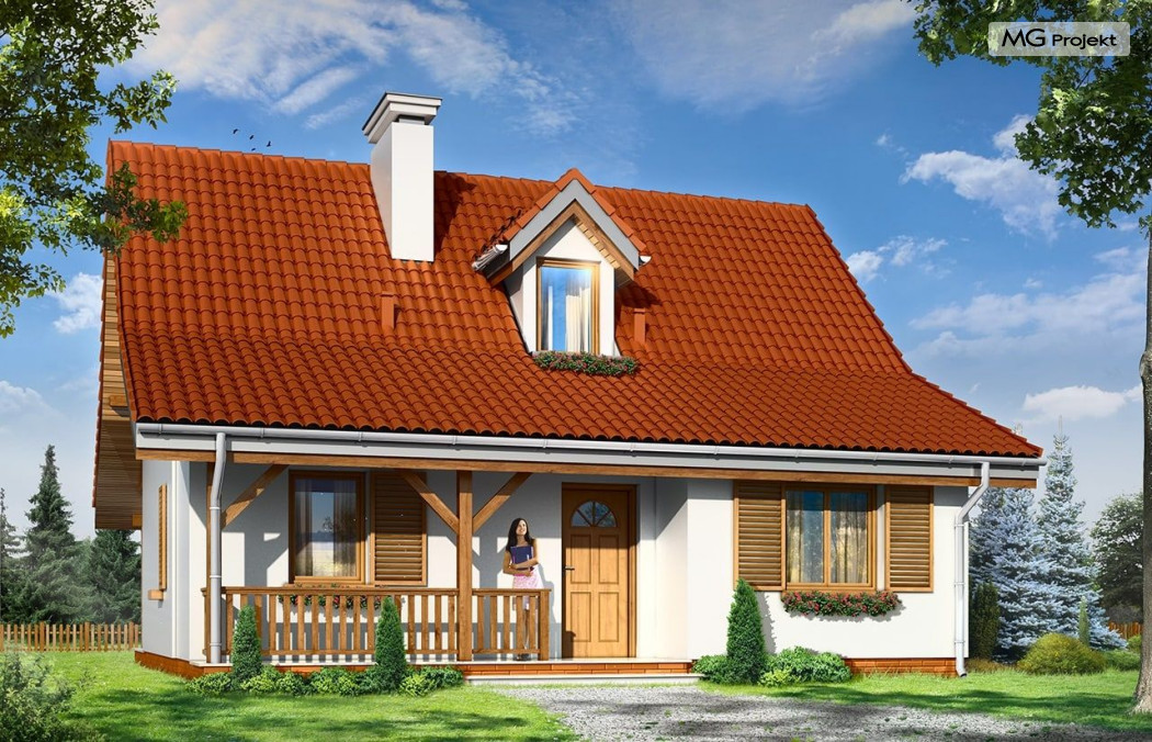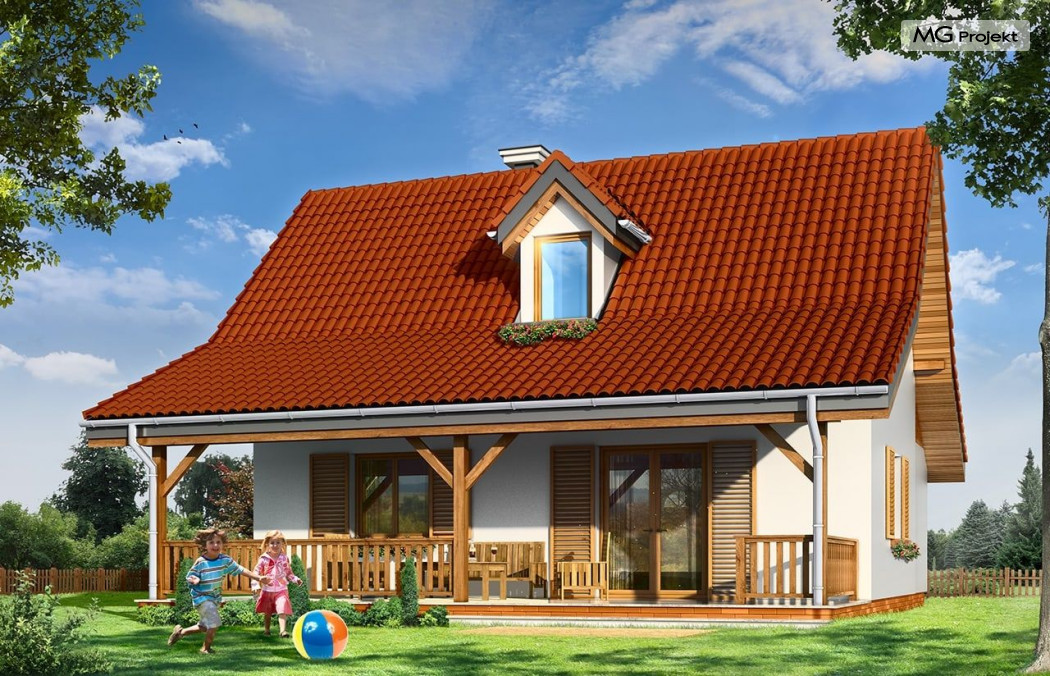 Projekt domu Sosenka 5 to kolejna odsłona projektu z popularnej serii Sosenek z pracowni MG Projekt. Projekt domu Sosenka 5 zaprojektowano dla 3-4 osobowej rodziny, do wykorzystania jako całoroczny dom jednorodzinny. Budynek może też służyć jako letniskowy. Biorąc pod uwagę uzyskaną powierzchnię projekt jest prosty i niedrogi w realizacji. Bryła w projekcie domu Sosenka 5 składa się z zasadniczej części z poddaszem użytkowym, przykrytej dwuspadowym symetrycznym dachem, oraz dwóch dobudówek. Frontowej - mieszczącej pokój na parterze i werandę wejściową, oraz tylnej z dużym zadaszonym tarasem. Zadaszony taras to świetne rozwiązanie powiększające optycznie pokój dzienny. Dach budynku ozdobiono dwiema niewielkimi lukarnami - po jednej na każdej połaci. Wewnątrz, na parterze zaprojektowano przestronny salon z wyeksponowanymi schodami i kominkiem, kuchnię, łazienkę, dodatkowy pokój - na przykład sypialnię dla gości, oraz sień i kotłownię. Na poddaszu zaplanowano dwie sypialnie i toaletę. W domu Sosenka 5 zaprojektowano ogrzewanie centralne z pieca w kotłowni. Pracownia posiada wersję odbicia lustrzanego projektu oraz inne odsłony: tańsza w wykonaniu (projekt domu Sosenka), z tarasem na froncie domu (projekt domu Sosenka 2 ), z innym układem pomieszczeń (projekt domu Sosenka 3), w technologii drewnianej z bocznym tarasem i balkonem (projekt domu Sosenka 4).