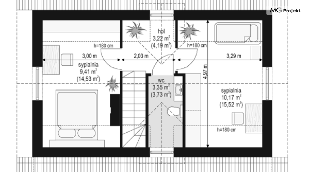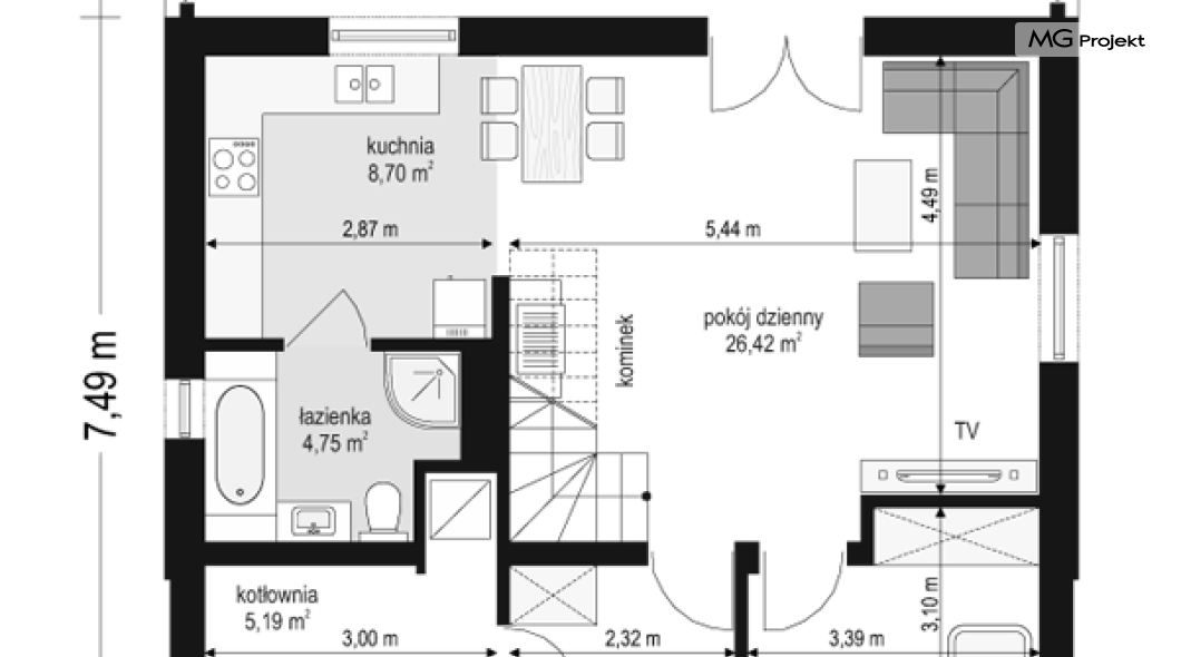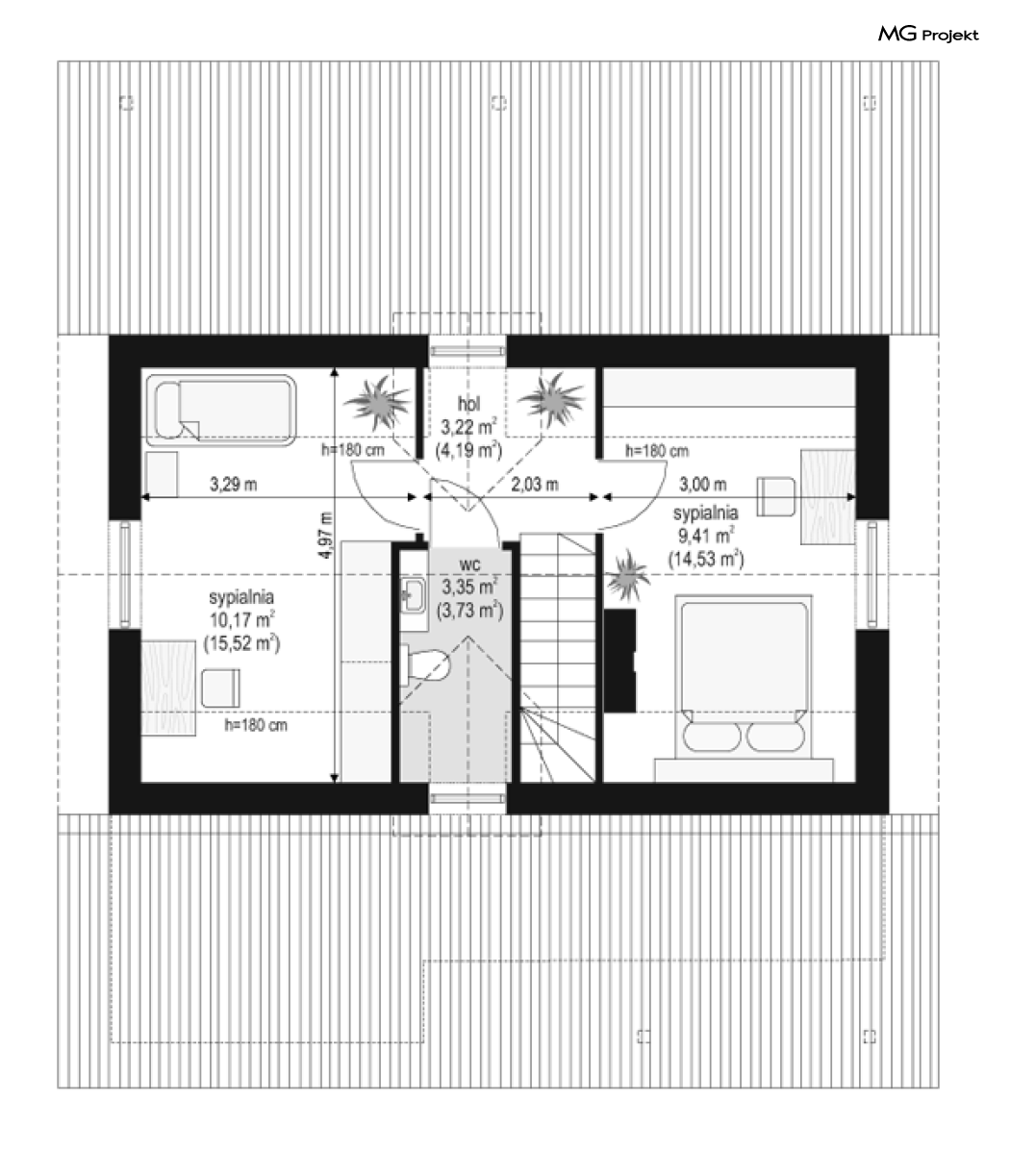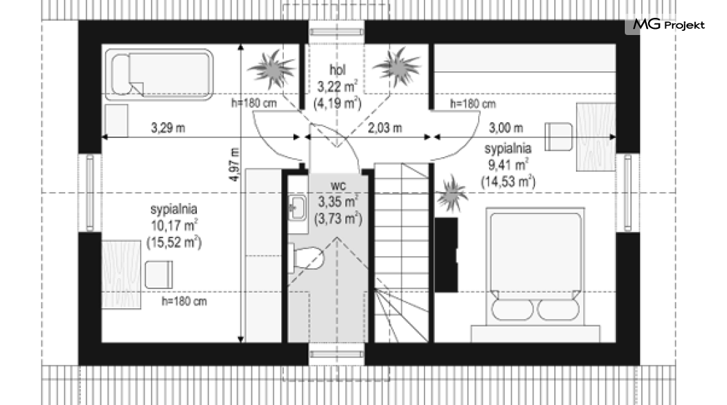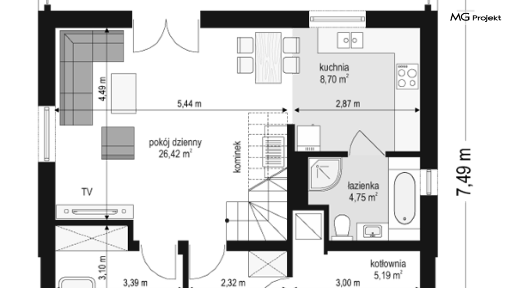 Projekt domu Sosenka 5 to kolejna odsłona projektu z popularnej serii Sosenek z pracowni MG Projekt. Projekt domu Sosenka 5 zaprojektowano dla 3-4 osobowej rodziny, do wykorzystania jako całoroczny dom jednorodzinny. Budynek może też służyć jako letniskowy. Biorąc pod uwagę uzyskaną powierzchnię projekt jest prosty i niedrogi w realizacji. Bryła w projekcie domu Sosenka 5 składa się z zasadniczej części z poddaszem użytkowym, przykrytej dwuspadowym symetrycznym dachem, oraz dwóch dobudówek. Frontowej - mieszczącej pokój na parterze i werandę wejściową, oraz tylnej z dużym zadaszonym tarasem. Zadaszony taras to świetne rozwiązanie powiększające optycznie pokój dzienny. Dach budynku ozdobiono dwiema niewielkimi lukarnami - po jednej na każdej połaci. Wewnątrz, na parterze zaprojektowano przestronny salon z wyeksponowanymi schodami i kominkiem, kuchnię, łazienkę, dodatkowy pokój - na przykład sypialnię dla gości, oraz sień i kotłownię. Na poddaszu zaplanowano dwie sypialnie i toaletę. W domu Sosenka 5 zaprojektowano ogrzewanie centralne z pieca w kotłowni. Pracownia posiada wersję odbicia lustrzanego projektu oraz inne odsłony: tańsza w wykonaniu (projekt domu Sosenka), z tarasem na froncie domu (projekt domu Sosenka 2 ), z innym układem pomieszczeń (projekt domu Sosenka 3), w technologii drewnianej z bocznym tarasem i balkonem (projekt domu Sosenka 4).