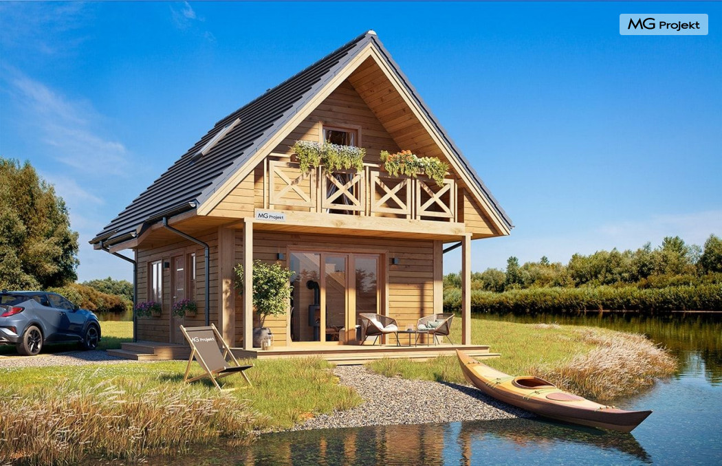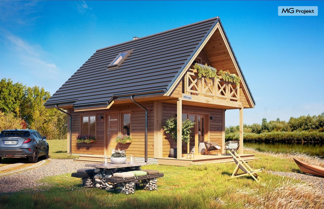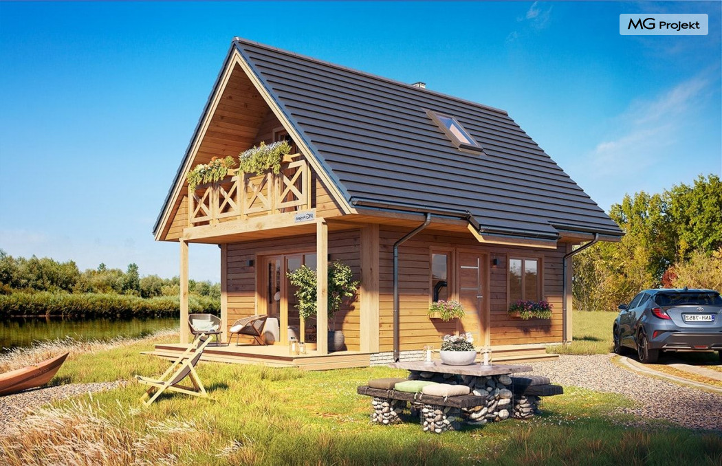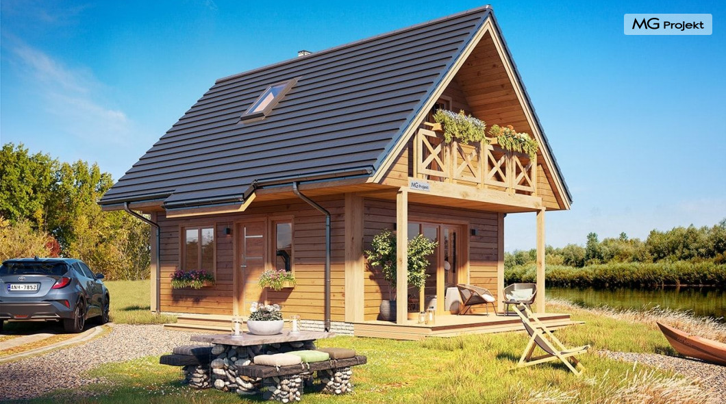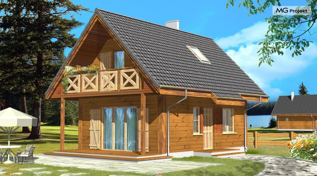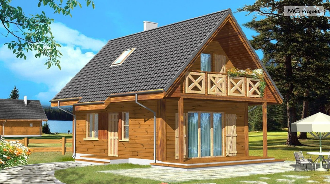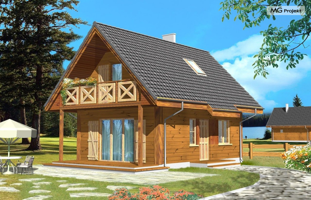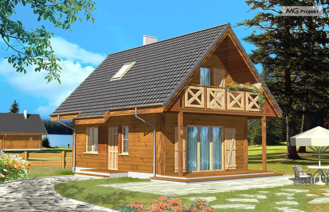 Projekt domu Sosenka Drewniana to mały zgrabny domek. Może pełnić funkcję letniskowego, ale również całorocznego domu. Jego zaletami są właściwe proporcje nadające estetyczny wygląd budynku, funkcjonalne wnętrze oraz prosta, tania w budowie konstrukcja. Pracownia posiada wiele wersji Sosenek ze zmienionymi gabarytami - z balkonem i tarasem z boku domu (Sosenka 4), przedłużony o 0,5 m - bez balkonu, przedłużony o 1,5 m z pomieszczeniem gospodarczym przy kuchni (Sosenka 3), z gankiem wejściowym (Sosenka 2), czy powiększony wariant domu (Sosenka 5). Projekt domu Sosenka Drewniana dostępny jest również w wersji odbicia lustrzanego, oraz dwóch wersjach wariantowych - z gankiem (Projekt domu Sesenka Drewniana Wariant B) i w wersji poszerzonej (Projekt domu Sesenka Drewniana Wariant D).