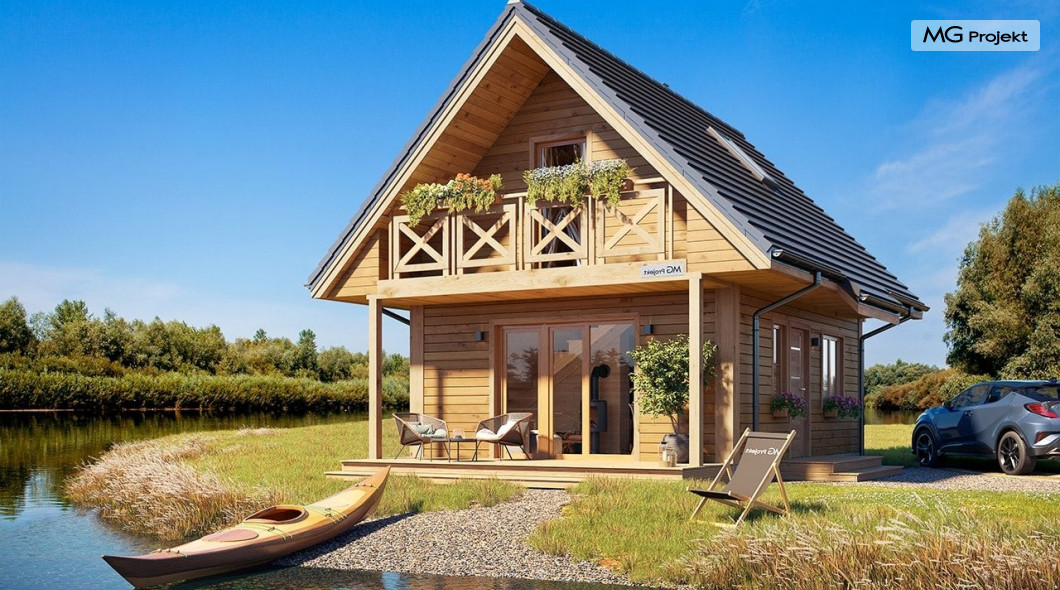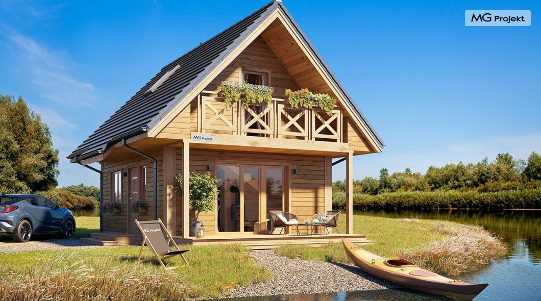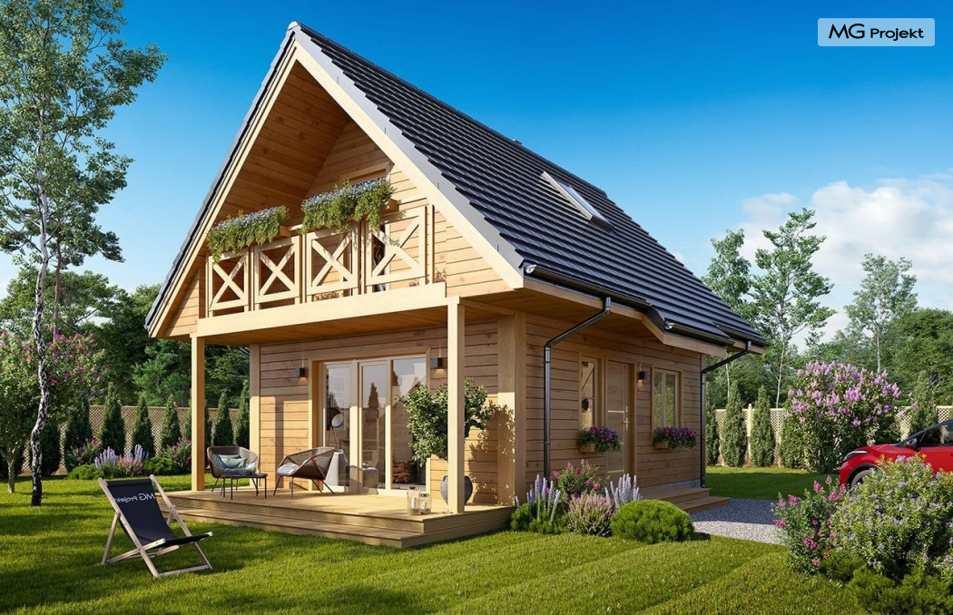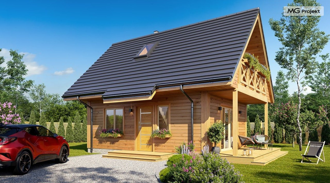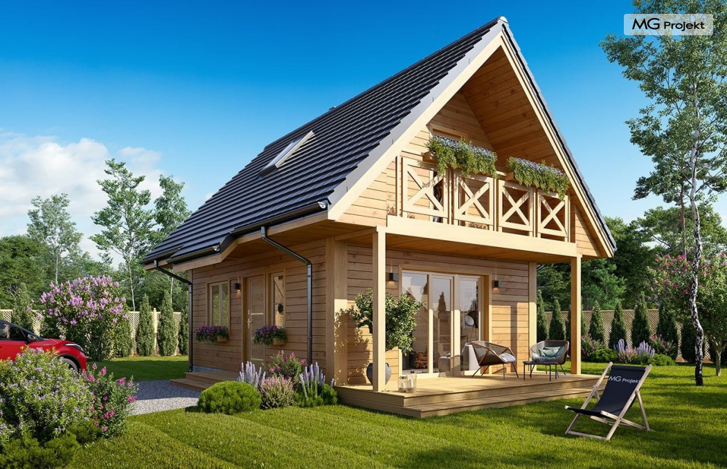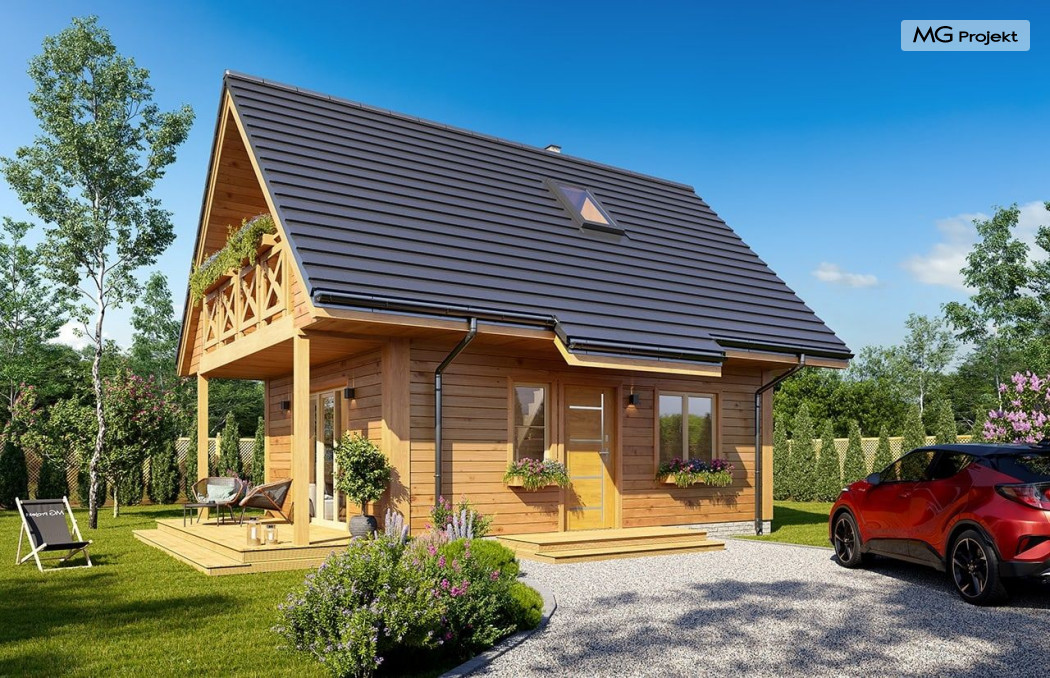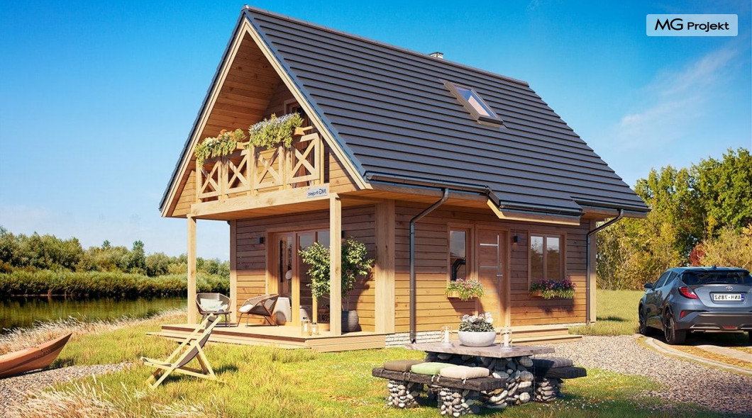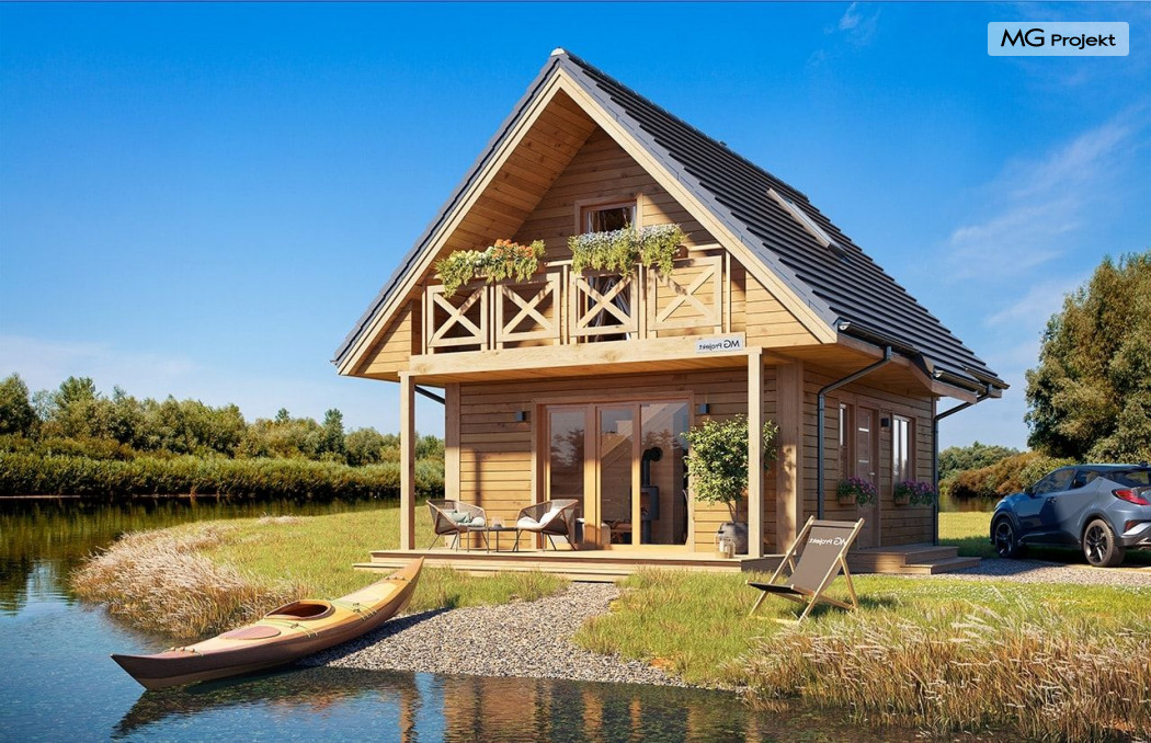 Projekt domu Sosenka Drewniana to mały zgrabny domek. Może pełnić funkcję letniskowego, ale również całorocznego domu. Jego zaletami są właściwe proporcje nadające estetyczny wygląd budynku, funkcjonalne wnętrze oraz prosta, tania w budowie konstrukcja. Pracownia posiada wiele wersji Sosenek ze zmienionymi gabarytami - z balkonem i tarasem z boku domu (Sosenka 4), przedłużony o 0,5 m - bez balkonu, przedłużony o 1,5 m z pomieszczeniem gospodarczym przy kuchni (Sosenka 3), z gankiem wejściowym (Sosenka 2), czy powiększony wariant domu (Sosenka 5). Projekt domu Sosenka Drewniana dostępny jest również w wersji odbicia lustrzanego, oraz dwóch wersjach wariantowych - z gankiem (Projekt domu Sesenka Drewniana Wariant B) i w wersji poszerzonej (Projekt domu Sesenka Drewniana Wariant D).